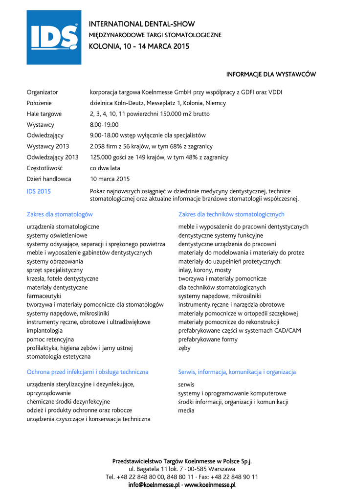 INTERNATIONAL DENTALDENTAL-SHOW MIĘDZYNARODOWE TARGI STOMATOLOGICZNE KOLONIA, 10 10 - 14 MARCA 2015 2015 INFORMACJE DLA WYSTAWCÓW Organizator korporacja targowa Koelnmesse GmbH przy współpracy z GDFI oraz VDDI Położenie dzielnica Köln-Deutz, Messeplatz 1, Kolonia, Niemcy Hale targowe 2, 3, 4, 10, 11 powierzchni 150.000 m2 brutto Wystawcy 8.00-19.00 Odwiedzający 9.00-18.00 wstęp wyłącznie dla specjalistów Wystawcy 2013 2.058 firm z 56 krajów, w tym 68% z zagranicy Odwiedzający 2013 125.000 gości ze 149 krajów, w tym 48% z zagranicy Częstotliwość co dwa lata Dzień handlowca 10 marca 2015 IDS 2015 2015 Pokaz najnowszych osiągnięć w dziedzinie medycyny dentystycznej, technice stomatologicznej oraz aktualne informacje branżowe stomatologii współczesnej. Zakres dla stomatologów Zakres dla techników stomatologicznych stomatologicznych urządzenia stomatologiczne systemy oświetleniowe systemy odsysające, separacji i sprężonego powietrza meble i wyposażenie gabinetów dentystycznych systemy obrazowania sprzęt specjalistyczny krzesła, fotele dentystyczne materiały dentystyczne farmaceutyki tworzywa i materiały pomocnicze dla stomatologów systemy napędowe, mikrosilniki instrumenty ręczne, obrotowe i ultradźwiękowe implantologia pomoc retencyjna profilaktyka, higiena zębów i jamy ustnej stomatologia estetyczna meble i wyposażenie do pracowni dentystycznych dentystyczne systemy funkcyjne dentystyczne urządzenia do pracowni materiały do modelowania i materiały do protez materiały do uzupełnień protetycznych: inlay, korony, mosty tworzywa i materiały pomocnicze dla techników stomatologicznych systemy napędowe, mikrosilniki instrumenty ręczne i narzędzia obrotowe materiały pomocnicze w ortopedii szczękowej materiały pomocnicze do rekonstrukcji prefabrykowane części w systemach CAD/CAM prefabrykowane formy zęby Ochrona przed infekcjami i obsługa techniczna Serwis, informacja, komunikacja i organizacja urządzenia sterylizacyjne i dezynfekujące, oprzyrządowanie chemiczne środki dezynfekcyjne odzież i produkty ochronne oraz robocze urządzenia czyszczące i konserwacja techniczna serwis systemy i oprogramowanie komputerowe środki informacji, organizacji i komunikacji media Przedstawicielstwo Targów Koelnmesse w Polsce Sp.j. ul. Bagatela 11 lok. 7 · 00-585 Warszawa Tel. +48 22 848 80 00, 848 80 11 · Fax: +48 22 848 90 11 [email protected] · www.koelnmesse.pl INTERNATIONAL DENTALDENTAL-SHOW MIĘDZYNARODOWE TARGI STOMATOLOGICZNE KOLONIA, 10 10 - 14 MARCA 2015 2015 Koszty obowiązkowe wszystkie podane wartości są cenami netto Stoisko Cena regularna powierzchnia targowa za m2 bez zabudowy wszystkie rodzaje stoisk 255,00 EURO/ m2 Ryczałt za energię 8,50 EURO/ m2 ogólne zużycie prądu, wody itp. Ryczałt na poczet usług serwisowych NKA dla firm biorących udział w targach po raz pierwszy dla firm biorących udział w targach kolejny raz rozliczany po targach w zależności od zużycia 800,00 EURO ryczałt naliczany jest na poziomie poniesionych kosztów podczas poprzedniej edycji targów Pakiet medialny Katalog drukowany/online/mobil 369,00 EURO wliczony w ryczałt na poczet usług serwisowych Zgłoszenie W celu dokonania zgłoszenia firmy do udziału w targach niezbędne jest wypełnienie dokumentów zgłoszeniowych. Procedurę rozpoczynają nadesłane formularze 1.10 i 1.30. Datą dokonania zgłoszenia jest dzień wpłynięcia dokumentów. Wynajem powierzchni min. wielkość stoiska 12 m2 max. wysokość stoiska 4,00 m Montaż stoiska 03.03 od godz. 8.00 do 09.03.2015 do godz. 20.00 Demontaż stoiska 14.03 od godz. 18.00 do 17.03.2015 do godz. 18.00 Hala 10.1 w dniach 14.03 od godz. 18.00 do 16.03.2015 do godz. 24.00 Zabudowa Koelnmesse Service http://stand.koelnmesse.de Wejściówki wystawcy bezpłatne, ważne w dni targowe oraz montażu i demontażu stoiska 4 wejściówki dla stoiska do 18 m2 1 wejściówka za każde następne rozpoczęte 6 m2 Koszty rezygnacji regulamin w dokumentach zgłoszeniowych zawarty w warunkach uczestnictwa: skrót punkt 14, część ogólna punkt II 8, część szczegółowa punkt 6. Niniejsze informacje ważne są wyłącznie z warunkami uczestnictwa w targach znajdującymi się w dokumentach zgłoszeniowych i nie stanowią oferty handlowej w rozumieniu art. 66 § 1 Kodeksu Cywilnego. www.idswww.ids-cologne.de cologne.de Przedstawicielstwo Targów Koelnmesse w Polsce Sp.j. ul. Bagatela 11 lok. 7 · 00-585 Warszawa Tel. +48 22 848 80 00, 848 80 11 · Fax: +48 22 848 90 11 [email protected] · www.koelnmesse.pl