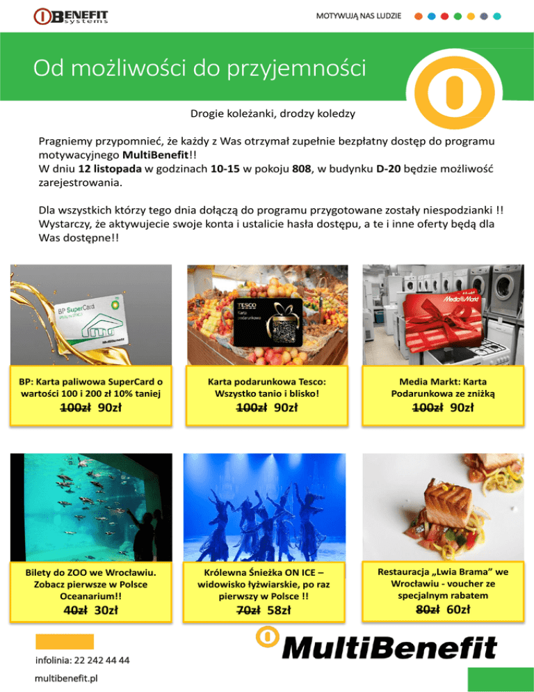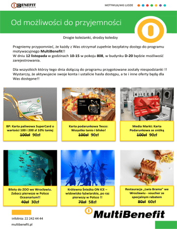 MOTYWUJĄ NAS LUDZIE Od możliwości do przyjemności Drogie koleżanki, drodzy koledzy Pragniemy przypomnieć, że każdy z Was otrzymał zupełnie bezpłatny dostęp do programu motywacyjnego MultiBenefit!! W dniu 12 listopada w godzinach 10-15 w pokoju 808, w budynku D-20 będzie możliwość zarejestrowania. Dla wszystkich którzy tego dnia dołączą do programu przygotowane zostały niespodzianki !! Wystarczy, że aktywujecie swoje konta i ustalicie hasła dostępu, a te i inne oferty będą dla Was dostępne!! BP: Karta paliwowa SuperCard o wartości 100 i 200 zł 10% taniej Karta podarunkowa Tesco: Wszystko tanio i blisko! Media Markt: Karta Podarunkowa ze zniżką 100zł 90zł 100zł 90zł 100zł 90zł Bilety do ZOO we Wrocławiu. Zobacz pierwsze w Polsce Oceanarium!! Królewna Śnieżka ON ICE – widowisko łyżwiarskie, po raz pierwszy w Polsce !! Restauracja „Lwia Brama” we Wrocławiu - voucher ze specjalnym rabatem 40zł 30zł 70zł 58zł 80zł 60zł infolinia: 22 242 44 44 multibenefit.pl