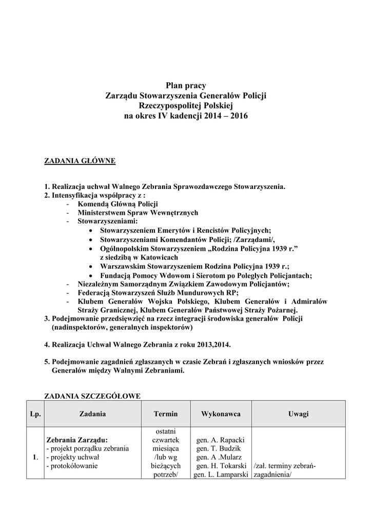 Plan pracy Zarządu Stowarzyszenia Generałów Policji