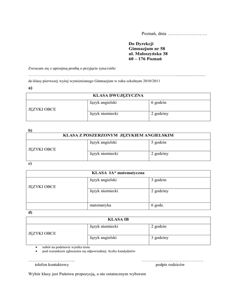 Poznań, dnia ……………………. Do Dyrekcji Gimnazjum nr 58 ul. Małoszyńska 38 60 – 176 Poznań Zwracam się z uprzejmą prośbą o przyjęcie syna/córki …………………………………………………………………………………………………............................. do klasy pierwszej wyżej wymienionego Gimnazjum w roku szkolnym 2010/2011 a) KLASA DWUJĘZYCZNA Język angielski 6 godzin Język niemiecki 2 godziny JĘZYKI OBCE b) KLASA Z POSZERZONYM JĘZYKIEM ANGIELSKIM Język angielski 5 godzin Język niemiecki 2 godziny JĘZYKI OBCE c) KLASA IA* matematyczna Język angielski 3 godzin Język niemiecki 2 godziny matematyka 6 godz. JĘZYKI OBCE d) KLASA IB Język niemiecki 2 godzin Język angielski 3 godziny JĘZYKI OBCE • • nabór na podstawie wyniku testu pod warunkiem zgłoszenia się odpowiedniej liczby kandydatów ………………………….. telefon kontaktowy …………………………………… podpis rodziców Wybór klasy jest Państwa propozycją, a nie ostatecznym wyborem