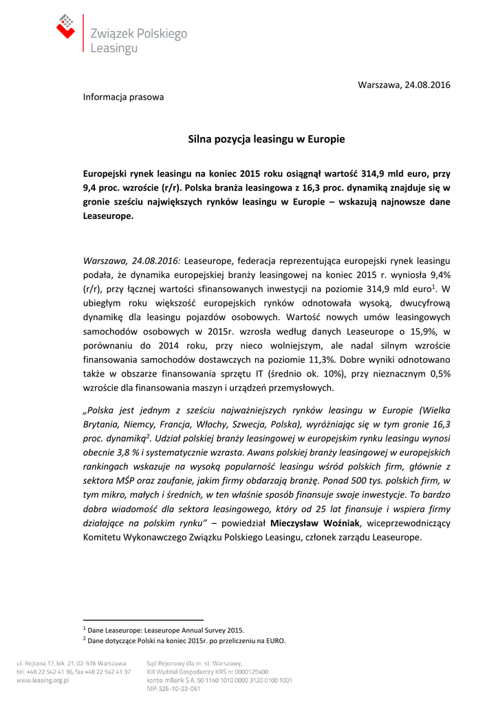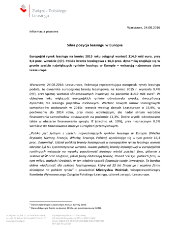 Warszawa, 24.08.2016 Informacja prasowa Silna pozycja leasingu w Europie Europejski rynek leasingu na koniec 2015 roku osiągnął wartość 314,9 mld euro, przy 9,4 proc. wzroście (r/r). Polska branża leasingowa z 16,3 proc. dynamiką znajduje się w gronie sześciu największych rynków leasingu w Europie – wskazują najnowsze dane Leaseurope. Warszawa, 24.08.2016: Leaseurope, federacja reprezentująca europejski rynek leasingu podała, że dynamika europejskiej branży leasingowej na koniec 2015 r. wyniosła 9,4% (r/r), przy łącznej wartości sfinansowanych inwestycji na poziomie 314,9 mld euro1. W ubiegłym roku większość europejskich rynków odnotowała wysoką, dwucyfrową dynamikę dla leasingu pojazdów osobowych. Wartość nowych umów leasingowych samochodów osobowych w 2015r. wzrosła według danych Leaseurope o 15,9%, w porównaniu do 2014 roku, przy nieco wolniejszym, ale nadal silnym wzroście finansowania samochodów dostawczych na poziomie 11,3%. Dobre wyniki odnotowano także w obszarze finansowania sprzętu IT (średnio ok. 10%), przy nieznacznym 0,5% wzroście dla finansowania maszyn i urządzeń przemysłowych. „Polska jest jednym z sześciu najważniejszych rynków leasingu w Europie (Wielka Brytania, Niemcy, Francja, Włochy, Szwecja, Polska), wyróżniając się w tym gronie 16,3 proc. dynamiką2. Udział polskiej branży leasingowej w europejskim rynku leasingu wynosi obecnie 3,8 % i systematycznie wzrasta. Awans polskiej branży leasingowej w europejskich rankingach wskazuje na wysoką popularność leasingu wśród polskich firm, głównie z sektora MŚP oraz zaufanie, jakim firmy obdarzają branżę. Ponad 500 tys. polskich firm, w tym mikro, małych i średnich, w ten właśnie sposób finansuje swoje inwestycje. To bardzo dobra wiadomość dla sektora leasingowego, który od 25 lat finansuje i wspiera firmy działające na polskim rynku” – powiedział Mieczysław Woźniak, wiceprzewodniczący Komitetu Wykonawczego Związku Polskiego Leasingu, członek zarządu Leaseurope. 1 2 Dane Leaseurope: Leaseurope Annual Survey 2015. Dane dotyczące Polski na koniec 2015r. po przeliczeniu na EURO. Wykres 1. Wartość inwestycji sfinansowanych za pośrednictwem leasingu w latach 2014 i 2015 (mld EUR). ZPL/Leaseurope. Finansowanie rozwoju firm Dane Komisji Europejskiej3 opublikowane na koniec 2015r. przedstawiły znaczenie zewnętrznych źródeł finansowania działalności europejskich przedsiębiorców, w tym 47% przedsiębiorców wskazało leasing i zakup ratalny jako istotny dla ich działalności. „Aż 57% polskich przedsiębiorców uczestniczących w badaniu Komisji Europejskiej wskazało leasing i zakup ratalny jako źródła finansowania działalności” – zauważa Mieczysław Woźniak, wiceprzewodniczący Komitetu Wykonawczego Związku Polskiego Leasingu, członek zarządu Leaseurope. „Nas oczywiście najbardziej interesuje struktura finansowania inwestycji przez przedsiębiorców, w tym przede wszystkim przez MŚP. Zgodnie z opublikowanymi w 2015 r. wynikami badania Oxford Economics, 18,9% wartości wszystkich inwestycji MŚP w Europie finansowanych jest przy wykorzystaniu leasingu. W Polsce wskaźnik ten jest jeszcze wyższy i wynosi ok. 30 % 4” – dodaje Mieczysław Woźniak. 3 4 Komisja Europejska, Survey on the access to finance of enterprises (SAFE), Analytical Report 2015. Oxford Economics, The Use of Leasing Amongst European SMEs, 2015 2 Wykres 2. Struktura finansowania inwestycji MŚP w Europie. Oxford Economics /Leaseurope. „Aby zilustrować te dane, rosnąc średniorocznie o 12,5%, w latach 2011 – 2015, branża leasingowa sfinansowała inwestycje polskich firm o wartości około 190 mld PLN. Zakładając średnioroczne tempo wzrostu rynku leasingu w Polsce na poziomie 8% w latach 2016-2020, w okresie najbliższych 5 lat (tj. do roku 2020) polskie firmy leasingowe sfinansują inwestycje o wartości 300 – 320 mld PLN. To istotny wkład w rozwój i modernizację polskich firm, a w konsekwencji wzrost PKB w naszym kraju” – podsumowuje Mieczysław Woźniak. Dynamika finansowania inwestycji za pośrednictwem leasingu na polskim rynku jest nadal wysoka - w I połowie 2016 r. wyniosła 17,7%, co wskazuje na wysoki optymizm inwestycyjny wśród polskich przedsiębiorców. W całym 2016 r. branża leasingowa sfinansuje inwestycje polskich firm, głównie mikro, małych i średnich, o wartości blisko 59 mld zł. Dodatkowe informacje: Anna Polak Związek Polskiego Leasingu T (22 ) 542 41 39 [email protected] ** 3 Związek Polskiego Leasingu (ZPL) to organizacja reprezentująca polski sektor przedsiębiorstw leasingowych, która zrzesza 29 firm leasingowych oraz Polski Związek Wynajmu i Leasingu Pojazdów. ZPL jest członkiem Leaseurope - organizacji zrzeszającej 45 związków z 33 krajów Europy, uczestniczy w pracach powołanej przez Leaseurope Grupy Roboczej krajów Europy Środkowej, Wschodniej i Południowo-Wschodniej (CESEE), Grupy Sterującej ds. Motoryzacji, a także współpracuje z innymi komitetami i grupami roboczymi w Leaseurope. ZPL uczestniczy w pracach grup i zespołów roboczych przygotowujących i opiniujących projekty regulacji prawnych dotyczących branży leasingowej. Przedstawiciele ZPL utrzymują bieżące kontakty z przedstawicielami administracji publicznej i parlamentarzystami. Ponadto, ZPL prowadzi działania wizerunkowe i edukacyjne na rzecz propagowania leasingu, jako narzędzia wspierającego rozwój przedsiębiorczości. 4