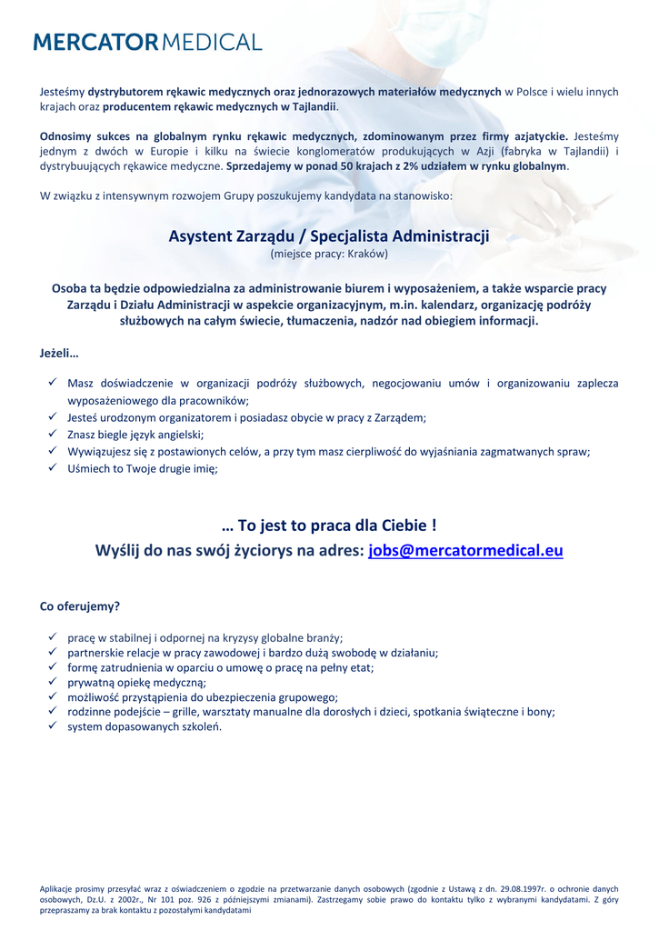 Jesteśmy dystrybutorem rękawic medycznych oraz jednorazowych materiałów medycznych w Polsce i wielu innych krajach oraz producentem rękawic medycznych w Tajlandii. Odnosimy sukces na globalnym rynku rękawic medycznych, zdominowanym przez firmy azjatyckie. Jesteśmy jednym z dwóch w Europie i kilku na świecie konglomeratów produkujących w Azji (fabryka w Tajlandii) i dystrybuujących rękawice medyczne. Sprzedajemy w ponad 50 krajach z 2% udziałem w rynku globalnym. W związku z intensywnym rozwojem Grupy poszukujemy kandydata na stanowisko: Asystent Zarządu / Specjalista Administracji (miejsce pracy: Kraków) Osoba ta będzie odpowiedzialna za administrowanie biurem i wyposażeniem, a także wsparcie pracy Zarządu i Działu Administracji w aspekcie organizacyjnym, m.in. kalendarz, organizację podróży służbowych na całym świecie, tłumaczenia, nadzór nad obiegiem informacji. Jeżeli… Masz doświadczenie w organizacji podróży służbowych, negocjowaniu umów i organizowaniu zaplecza wyposażeniowego dla pracowników; Jesteś urodzonym organizatorem i posiadasz obycie w pracy z Zarządem; Znasz biegle język angielski; Wywiązujesz się z postawionych celów, a przy tym masz cierpliwość do wyjaśniania zagmatwanych spraw; Uśmiech to Twoje drugie imię; … To jest to praca dla Ciebie ! Wyślij do nas swój życiorys na adres: [email protected] Co oferujemy? pracę w stabilnej i odpornej na kryzysy globalne branży; partnerskie relacje w pracy zawodowej i bardzo dużą swobodę w działaniu; formę zatrudnienia w oparciu o umowę o pracę na pełny etat; prywatną opiekę medyczną; możliwość przystąpienia do ubezpieczenia grupowego; rodzinne podejście – grille, warsztaty manualne dla dorosłych i dzieci, spotkania świąteczne i bony; system dopasowanych szkoleń. Aplikacje prosimy przesyłać wraz z oświadczeniem o zgodzie na przetwarzanie danych osobowych (zgodnie z Ustawą z dn. 29.08.1997r. o ochronie danych osobowych, Dz.U. z 2002r., Nr 101 poz. 926 z późniejszymi zmianami). Zastrzegamy sobie prawo do kontaktu tylko z wybranymi kandydatami. Z góry przepraszamy za brak kontaktu z pozostałymi kandydatami