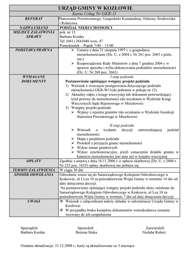 URZĄD GMINY W KOZŁOWIE Karta Usług Nr GKR-11 REFERAT NAZWA USŁUGI MIEJSCE ZAŁATWINIA SPRAWY PODSTAWA PRAWNA WYMAGANE DOKUMENTY Planowania Przestrzennego, Gospodarki Komunalnej, Ochrony Środowiska i Rolnictwa PODZIAŁ NIERUCHOMOŚCI pok. nr 12 Barbara Kordas Tel. (041) 3841048 wew. 47 Poniedziałek – Piątek 7:00 – 15:00 Ustawa z dnia 21 sierpnia 1997 r. o gospodarce nieruchomościami (Dz. U. z 2004 r. Nr 261 poz. 2603 z późn. zm.) Rozporządzenie Rady Ministrów z dnia 7 grudnia 2004 r. w sprawie sposobu i trybu dokonywania podziałów nieruchomości (Dz. U. Nr 268 poz. 2663) I etap podziału Postanowienie opiniujące wstępny projekt podziału 1) Wniosek o wszczęcie postępowania dotyczącego podziału nieruchomości GKR-W11(do pobrania w pokoju nr 12) 2) Aktualny odpis z księgi wieczystej lub dokument potwierdzający tytuł prawny do nieruchomości (do uzyskania w Wydziale Ksiąg Wieczystych Sądu Rejonowego w Miechowie) 3) Wstępny projekt podziału Wypisy z rejestru gruntów (do uzyskania w Wydziale Geodezji Starostwa Powiatowego w Miechowie) II etap podziału wydanie decyzji OPŁATY TERMIN ZAŁATWIENIA SPOSÓB ODWOŁANIA UWAGI Sporządził: Barbara Kordas Wniosek o zatwierdzającej podział nieruchomości Mapa z projektem podziału Protokół z przyjęcia granic nieruchomości Wykaz zmian gruntowych Wykaz synchronizacyjny, jeżeli oznaczenie działek gruntu w katastrze nieruchomości jest inne niż w księdze wieczystej Zgodnie z ustawą z dnia 16.11.2006 r. o opłacie skarbowej (Dz. U. z 2006 r. Nr 225 poz. 1635) opłaty skarbowej nie pobiera się. W ciągu 30 dni Odwołanie wnosi się do Samorządowego Kolegium Odwoławczego w Krakowie, ul J.Lea 10 za pośrednictwem Wójta Gminy w terminie 14 dni od daty doręczenia decyzji. Na postanowienie opiniujące wstępny projekt podziału służy zażalenie do Samorządowego Kolegium Odwoławczego w Krakowie, ul Lea 10 za pośrednictwem Wójta Gminy w terminie 7 dni od daty doręczenia decyzji. Wniosek z załącznikami należy składać w sekretariacie Urzędu Gminy w Kozłowie W przypadku braku kompletu dokumentów wnioskodawca zostanie wezwany do ich uzupełnienia Sprawdził: Bożena Słoka Ostatnia aktualizacja: 31.12.2008 r., karty są aktualizowane co 3 miesiące. Zatwierdził: Nielaba Robert