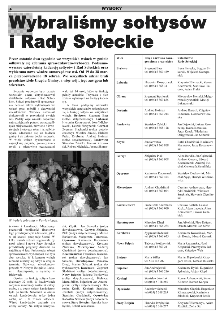 Wybraliśmy sołtysów i Rady Sołeckie 4 WYBORY Przez ostatnie dwa tygodnie we wszystkich wsiach w gminie odbywały się zebrania sprawozdawczo-wyborcze. Podsumowywano czteroletnią kadencję sołtysów i Rad Sołeckich oraz wybierano nowe władze samorządowe wsi. Od 19 do 28 marca przeprowadzono 18 zebrań. We wszystkich udział brali przedstawiciele Urzędu Gminy, a więc wójt, jego zastępca lub sekretarz. Zebrania wyborcze były przede wszystkim oceną dotychczasowej działalności sołtysów i Rad Sołeckich. Sołtysi przedstawili sprawozdania, oceniali zakres wykonanych we wsiach prac, mówili o aktywności mieszkańców. Wszyscy natomiast dyskutowali o przyszłości swoich wsi. Padały więc wnioski dotyczące najważniejszych potrzeb poszczególnych miejscowości, mówiono o inwestycjach bieżącego roku i lat najbliższych, odnoszono się do budżetu gminy i do zakresu dopłat unijnych. W wielu wsiach dyskutowano o największej przyszłej gminnej inwestycji, a mianowicie oczyszczalni wało też 14 osób, które tę funkcję pełniły aktualnie. Trzynastu z nich zostało wybranych na bieżącą kadencję. A teraz podajemy nazwiska wszystkich kandydatów ubiegających się o funkcję sołtysa we wszystkich wsiach. Brylewo: Zygmunt Baer (sołtys dotychczasowy), Lubonia: Hieronim Koszyczarek, Józef Michałowski, Leszek Skrzypczak, Górzno: Zygmunt Stachurski (sołtys dotychczasowy), Wiesław Janicki, Elżbieta Prałat, Drobnin: Andrzej Hofman (sołtys dotychczasowy), Pawłowice: Stanisław Żabicki, Tomasz Kozłowski, Robert Michalak, Janusz Skorup- W trakcie zebrania w Pawłowicach. ścieków i kanalizacji. Mieszkańcy poznawali możliwości finansowe tego przedsięwzięcia i działania, jakie w tej kwestii podejmuje Urząd. W kilku wsiach zebrani sugerowali, by nowi sołtysi i nowe Rady Sołeckie przedstawiły programy działania na najbliższe 4 lata. Frekwencja zebrań sprawozdawczo-wyborczych nie była zbyt wysoka. W kilkunastu wsiach zebrania musiały się odbyć w drugim terminie. Najwięcej mieszkańców przyszło w Nowym Belęcinie, Luboni i Hersztupowie, a najmniej w Bielawach. Ogółem na funkcję sołtysa kandydowały 32 osób. W Pawłowicach sołtysem zamierzały zostać aż cztery osoby, a w trzech wsiach kandydatów było po trzech. Natomiast w ośmiu wsiach kandydowała tylko jedna osoba, no i ta została sołtysem. Wśród kandydatów znalazły się cztery kobiety. Na sołtysa kandydo- ski, Zbytki: Jan Serwatka (sołtys dotychczasowy), Garzyn: Zbigniew Ptak (sołtys dotychczasowy), Marian Bartkowiak, Małgorzata Tarnowska, Oporowo: Kazimierz Kaczmarek (sołtys dotychczasowy), Krystyna Zbierska, Mierzejewo: Andrzej Chudziński (sołtys dotychczasowy), Krzemieniewo: Franciszek Kaczmarek (sołtys dotychczasowy), Jan Siniecki, Hersztupowo: Mirosław Długi, Marian Sobczak (sołtys dotychczasowy), Karchowo: Zygmunt Słodziński (sołtys dotychczasowy), Nowy Belęcin: Tadeusz Wojtkowiak (sołtys dotychczasowy), Bielawy: Marta Stiller, Bojanice: Jan Andrzejewski (sołtys dotychczasowy), Hieronim Kubik, Kociugi: Stanisław Józefiak (sołtys dotychczasowy), Stanisław Chudziński, Oporówko: Radosław Sobecki (sołtys dotychczasowy), Stary Belęcin: Henryka Przybylska, Robert Wudarczak. Wieś Imię i nazwisko nowego sołtysa oraz telefon Członkowie Rady Sołeckiej Brylewo Zygmunt Baer tel. (065) 5 360 439 Irena Pierecka, Bogdan Sikorski, Wojciech Szczepaniak Lubonia Hieronim Koszyczarek tel. (065) 5 368 311 Krzysztof Biernacki, Zenon Kaczmarek, Stanisław Płaczek, Adam Prałat Górzno Zygmunt Stachurski tel. (065) 5 360 835 Mieczysław Homski, Małgorzata Krysztofiak, Maciej Łukaszewski Drobnin Andrzej Hofman tel. (065) 5 360 214 Andrzej Banach, Zbigniew Biderman, Dorota Pawłowska Pawłowice Stanisław Żabicki tel. (065) 5 368 128 Jan Dajewski, Łukasz Grobelny, Iwona Kowalska, Jerzy Kozak, Władysław Osięgłowski, Jan Sobczak Zbytki Jan Serwatka tel. (065) 5 360 868 Rafał Chudziński, Kazimierz Marszałek, Jerzy Robaszewski Garzyn Zbigniew Ptak tel. (065) 5 360 908 Alina Bondia, Jan Gajewski, Andrzej Gorący, Edward Kaźmierczak, Andrzej Piechel, Genowefa Ziemlińska Oporowo Kazimierz Kaczmarek tel. (065) 5 369 474 Stanisław Dudkowiak, Michał Zając, Henryk Wiśnierewicz Mierzejewo Andrzej Chudziński tel. (065) 5 360 074 Czesław Andrzejczak, Henryk Dawidziak, Wiesława Smektała, Sławomir Ziemliński Krzemieniewo Franciszek Kaczmarek tel. (065) 5 360 069 Czesław Kielich, Łukasz Kruk, Adam Łagoda, Alina Kamieniarz, Łukasz Gembiak Hersztupowo Mirosław Długi tel. (065) 5 366 284 Jan Jabłoński, Piotr Krüger, Danuta Mrozek, Jan Mróz Karchowo Zygmunt Słodziński tel. (065) 5 360 655 Kazimierz Kokociński, Marcin Kozak, Edward Kromski Nowy Belęcin Tadeusz Wojtkowiak tel. (065) 5 360 241 Marta Raczyńska, Józef Kasperski, Przemysław Jańczak, Zbigniew Wels Bielawy Marta Stiller tel. 504 147 707 Marian Kąkolewski, Grzegorz Rosik, Tomasz Rusiński Bojanice Jan Andrzejewski tel. (065) 5 366 216 Kazimierz Hylak, Eugeniusz Jędrzejak, Alojzy Klupś Kociugi Stanisław Józefiak tel.(065) 5 368 265 Roman Urbanowski, Zenon Klimasz, Roman Kozyra Oporówko Radosław Sobecki tel.(065) 5 368 265 Mirosław Glapiak, Eugeniusz Klimaszewski, Kazimierz Jakubiak, Krzysztof Rosik Stary Belęcin Henryka Przybylska tel.(065) 5 366 277 Krzysztof Biernaczyk, Adam Józefiak, Zofia Oto