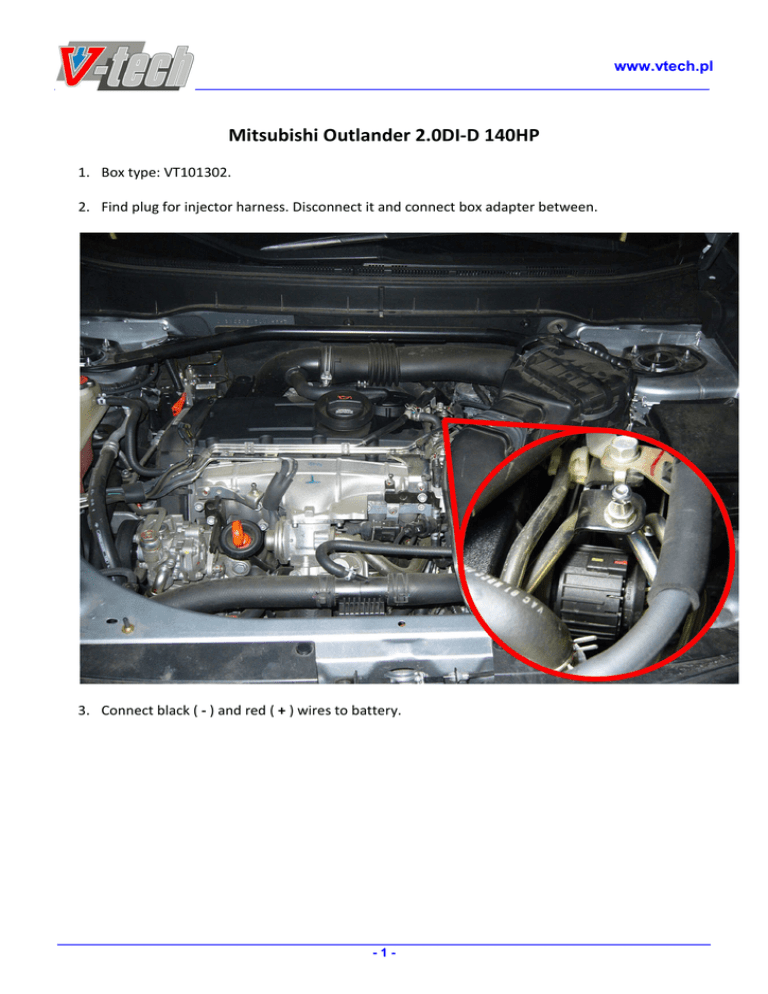 www.vtech.pl ____________________________________________________________________________ Mitsubishi Outlander 2.0DI-D 140HP 1. Box type: VT101302. 2. Find plug for injector harness. Disconnect it and connect box adapter between. 3. Connect black ( - ) and red ( + ) wires to battery. ___________________________________________________________________________________________ -1-