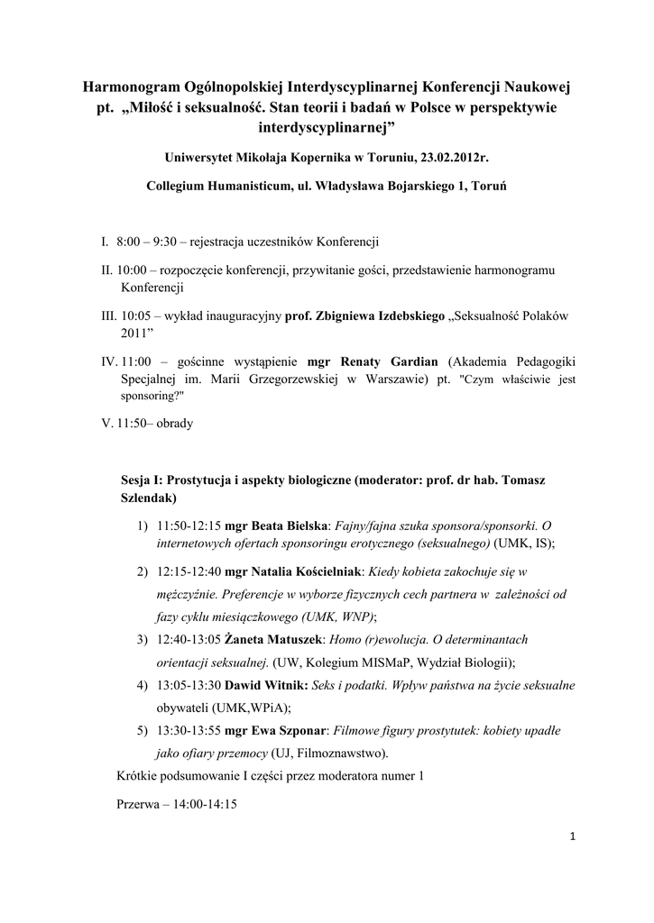 Harmonogram Ogólnopolskiej Interdyscyplinarnej Konferencji Naukowej pt. „Miłość i seksualność. Stan teorii i badań w Polsce w perspektywie interdyscyplinarnej” Uniwersytet Mikołaja Kopernika w Toruniu, 23.02.2012r. Collegium Humanisticum, ul. Władysława Bojarskiego 1, Toruń I. 8:00 – 9:30 – rejestracja uczestników Konferencji II. 10:00 – rozpoczęcie konferencji, przywitanie gości, przedstawienie harmonogramu Konferencji III. 10:05 – wykład inauguracyjny prof. Zbigniewa Izdebskiego „Seksualność Polaków 2011” IV. 11:00 – gościnne wystąpienie mgr Renaty Gardian (Akademia Pedagogiki Specjalnej im. Marii Grzegorzewskiej w Warszawie) pt. "Czym właściwie jest sponsoring?" V. 11:50– obrady Sesja I: Prostytucja i aspekty biologiczne (moderator: prof. dr hab. Tomasz Szlendak) 1) 11:50-12:15 mgr Beata Bielska: Fajny/fajna szuka sponsora/sponsorki. O internetowych ofertach sponsoringu erotycznego (seksualnego) (UMK, IS); 2) 12:15-12:40 mgr Natalia Kościelniak: Kiedy kobieta zakochuje się w mężczyźnie. Preferencje w wyborze fizycznych cech partnera w zależności od fazy cyklu miesiączkowego (UMK, WNP); 3) 12:40-13:05 Żaneta Matuszek: Homo (r)ewolucja. O determinantach orientacji seksualnej. (UW, Kolegium MISMaP, Wydział Biologii); 4) 13:05-13:30 Dawid Witnik: Seks i podatki. Wpływ państwa na życie seksualne obywateli (UMK,WPiA); 5) 13:30-13:55 mgr Ewa Szponar: Filmowe figury prostytutek: kobiety upadłe jako ofiary przemocy (UJ, Filmoznawstwo). Krótkie podsumowanie I części przez moderatora numer 1 Przerwa – 14:00-14:15 1 Sesja II: seks a media (moderator dr hab. Krzysztof Olechnicki) 1) 14:15-14:40 Diana Bożek: Doskonały seks z doskonałą kobietą - <Playboy> jako erotyczna Biblia XXI wieku (UW, WPiA); 2) 14:40-15:05 mgr Bartłomiej Oleszek: Seks w eterze. Problem seksualności we współczesnych polskich spektaklach radiowych (UMK, Wydział Filologiczny); 3) 15:05-15:30 mgr Katarzyna Stępkowska: Współczesny świat erotyki i seksu wolność czy zniewolenie? (UKSW); 4) 15:30-15:55 mgr Maciej Gurtowski: Dlaczego na lesbijki fajnie jest popatrzeć a na gejów nie? Komunikat z badań (UMK, IS). Krótkie podsumowanie II części przez moderatora numer 2 Przerwa – 16:00-16:20 Sesja III: seks a religia (moderator: dr Paweł Załęcki) 1) 16:20-17:00 wykład dr. Pawła Załęckiego, pt. Seks a współczesny Kościół rzymskokatolicki. Prolegomena do analizy wybranych form relacji. 2) 17:00-17:25 Prof. dr hab. Marian Grabowski: Kategoria czystości w koncepcji miłości seksualnej Karola Wojtyły (UMK, Wydział Teologiczny); 3) 17:25-17:50 Kamila Dobosz: Miłość i seksualność w katolicyzmie (Akademia „Ignatianum” w Krakowie). 4) 17:50-18:15 mgr Aleksander Sztramski: Miłość oblubieńcza i jej fundamenty w teologii ciała bł. Jana Pawła II (absolwent WPiA i WT UMK) Krótkie podsumowanie III części przez moderatora numer 3 VI. Zakończenie Konferencji Obiad dla referentów 2 3