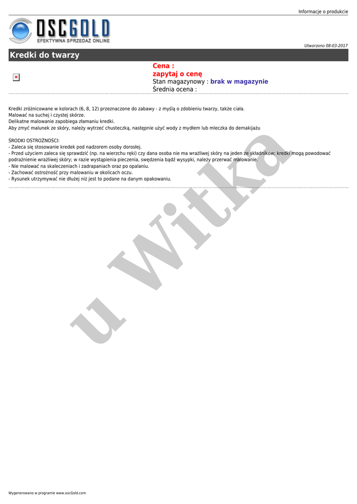 Informacje o produkcie Utworzono 08-03-2017 Kredki do twarzy Cena : zapytaj o cenę Stan magazynowy : brak w magazynie Średnia ocena : Kredki zróżnicowane w kolorach (6, 8, 12) przeznaczone do zabawy - z myślą o zdobieniu twarzy, także ciała. Malować na suchej i czystej skórze. Delikatne malowanie zapobiega złamaniu kredki. Aby zmyć malunek ze skóry, należy wytrzeć chusteczką, następnie użyć wody z mydłem lub mleczka do demakijażu u W it ka ŚRODKI OSTROŻNOŚCI: - Zaleca się stosowanie kredek pod nadzorem osoby dorosłej. - Przed użyciem zaleca się sprawdzić (np. na wierzchu ręki) czy dana osoba nie ma wrażliwej skóry na jeden ze składników; kredki mogą powodować podrażnienie wrażliwej skóry; w razie wystąpienia pieczenia, swędzenia bądź wysypki, należy przerwać malowanie. - Nie malować na skaleczeniach i zadrapaniach oraz po opalaniu. - Zachować ostrożność przy malowaniu w okolicach oczu. - Rysunek utrzymywać nie dłużej niż jest to podane na danym opakowaniu. Wygenerowano w programie www.oscGold.com