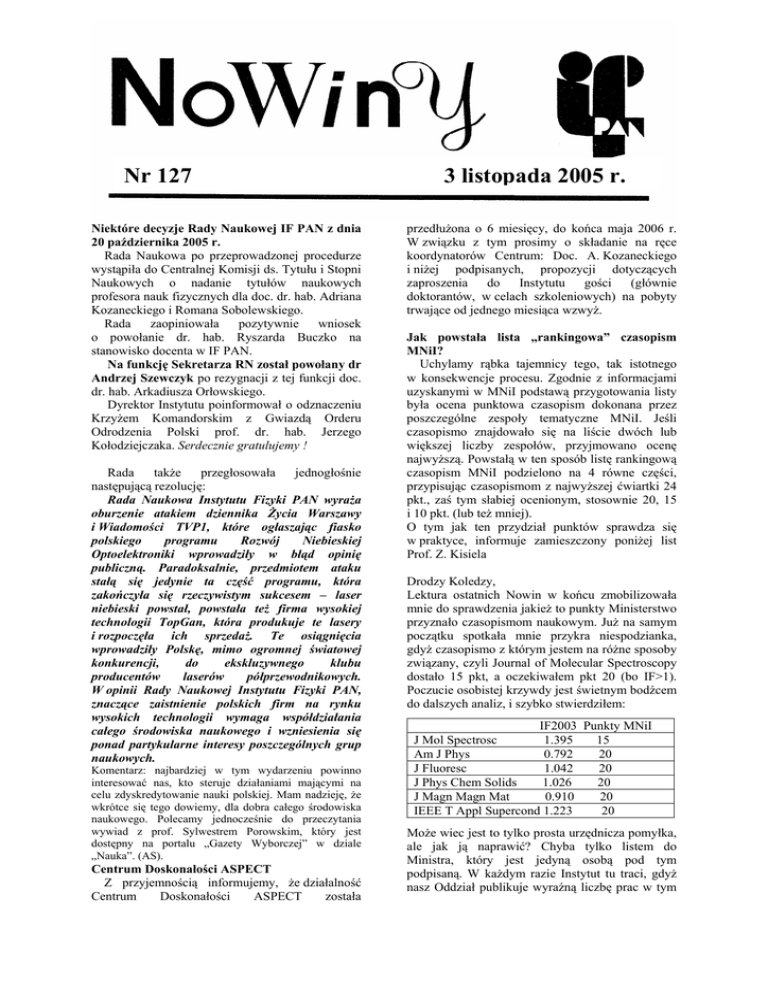 Nr 127 Niektóre decyzje Rady Naukowej IF PAN z dnia 20 października 2005 r. Rada Naukowa po przeprowadzonej procedurze wystąpiła do Centralnej Komisji ds. Tytułu i Stopni Naukowych o nadanie tytułów naukowych profesora nauk fizycznych dla doc. dr. hab. Adriana Kozaneckiego i Romana Sobolewskiego. Rada zaopiniowała pozytywnie wniosek o powołanie dr. hab. Ryszarda Buczko na stanowisko docenta w IF PAN. Na funkcję Sekretarza RN został powołany dr Andrzej Szewczyk po rezygnacji z tej funkcji doc. dr. hab. Arkadiusza Orłowskiego. Dyrektor Instytutu poinformował o odznaczeniu Krzyżem Komandorskim z Gwiazdą Orderu Odrodzenia Polski prof. dr. hab. Jerzego Kołodziejczaka. Serdecznie gratulujemy ! Rada także przegłosowała jednogłośnie następującą rezolucję: Rada Naukowa Instytutu Fizyki PAN wyraża oburzenie atakiem dziennika Życia Warszawy i Wiadomości TVP1, które ogłaszając fiasko polskiego programu Rozwój Niebieskiej Optoelektroniki wprowadziły w błąd opinię publiczną. Paradoksalnie, przedmiotem ataku stałą się jedynie ta część programu, która zakończyła się rzeczywistym sukcesem – laser niebieski powstał, powstała też firma wysokiej technologii TopGan, która produkuje te lasery i rozpoczęła ich sprzedaż. Te osiągnięcia wprowadziły Polskę, mimo ogromnej światowej konkurencji, do ekskluzywnego klubu producentów laserów półprzewodnikowych. W opinii Rady Naukowej Instytutu Fizyki PAN, znaczące zaistnienie polskich firm na rynku wysokich technologii wymaga współdziałania całego środowiska naukowego i wzniesienia się ponad partykularne interesy poszczególnych grup naukowych. Komentarz: najbardziej w tym wydarzeniu powinno interesować nas, kto steruje działaniami mającymi na celu zdyskredytowanie nauki polskiej. Mam nadzieję, że wkrótce się tego dowiemy, dla dobra całego środowiska naukowego. Polecamy jednocześnie do przeczytania wywiad z prof. Sylwestrem Porowskim, który jest dostępny na portalu „Gazety Wyborczej” w dziale „Nauka”. (AS). Centrum Doskonałości ASPECT Z przyjemnością informujemy, że działalność Centrum Doskonałości ASPECT została 3 listopada 2005 r. przedłużona o 6 miesięcy, do końca maja 2006 r. W związku z tym prosimy o składanie na ręce koordynatorów Centrum: Doc. A. Kozaneckiego i niżej podpisanych, propozycji dotyczących zaproszenia do Instytutu gości (głównie doktorantów, w celach szkoleniowych) na pobyty trwające od jednego miesiąca wzwyż. Jak powstała lista „rankingowa” czasopism MNiI? Uchylamy rąbka tajemnicy tego, tak istotnego w konsekwencje procesu. Zgodnie z informacjami uzyskanymi w MNiI podstawą przygotowania listy była ocena punktowa czasopism dokonana przez poszczególne zespoły tematyczne MNiI. Jeśli czasopismo znajdowało się na liście dwóch lub większej liczby zespołów, przyjmowano ocenę najwyższą. Powstałą w ten sposób listę rankingową czasopism MNiI podzielono na 4 równe części, przypisując czasopismom z najwyższej ćwiartki 24 pkt., zaś tym słabiej ocenionym, stosownie 20, 15 i 10 pkt. (lub też mniej). O tym jak ten przydział punktów sprawdza się w praktyce, informuje zamieszczony poniżej list Prof. Z. Kisiela Drodzy Koledzy, Lektura ostatnich Nowin w końcu zmobilizowała mnie do sprawdzenia jakież to punkty Ministerstwo przyznało czasopismom naukowym. Już na samym początku spotkała mnie przykra niespodzianka, gdyż czasopismo z którym jestem na różne sposoby związany, czyli Journal of Molecular Spectroscopy dostało 15 pkt, a oczekiwałem pkt 20 (bo IF>1). Poczucie osobistej krzywdy jest świetnym bodźcem do dalszych analiz, i szybko stwierdziłem: IF2003 Punkty MNiI J Mol Spectrosc 1.395 15 Am J Phys 0.792 20 J Fluoresc 1.042 20 J Phys Chem Solids 1.026 20 J Magn Magn Mat 0.910 20 IEEE T Appl Supercond 1.223 20 Może wiec jest to tylko prosta urzędnicza pomyłka, ale jak ją naprawić? Chyba tylko listem do Ministra, który jest jedyną osobą pod tym podpisaną. W każdym razie Instytut tu traci, gdyż nasz Oddział publikuje wyraźną liczbę prac w tym czasopiśmie, zwykle z większościowym autorstwem z Instytutu. Dla porównania kilka innych czasopism z niskawym IF, które też zostały ocenione na 20 pkt. J Brazil Chem Soc J Foramin Res Vacuum IF2003 Punkty MNiI 0.895 20 1.000 20 0.612 20 To ostatnie to już trochę mnie zdziwiło, bo tytuł niewątpliwie zacny, ale czy przypadkiem nie wypromowany przez jakieś lobby? A co może dostać 24 pkt. (w fizyce to czasopismo z IF powyżej ok. 2): Adv Math Topology IF2003 Punkty MNiI 0.930 24 0.535 24 Hmm..., ale matematykom nie żałujemy bo są mniejszym, bardziej hermetycznym środowiskiem, trudniej im o cytowania itp. Dalej: Agron J Ambio IEEE T Aero Elec Sys Mater Trans Wirel Netw IF2003 Punkty MNiI 1.243 24 1.123 24 0.697 24 1.159 24 1.17 24 To już jest trudniejsze do zrozumienia. Są także dobrze punktowane czasopisma bez IF(2003): J Sandw Struct Mater Value Health Women Health J Retailing J Risk Uncertainty IF2003 Punkty MNiI ? 24 ? 24 ? 24 (IF2000=0.90) ? 24 ? 24 (IF1995=1.063) Sprawdzian przy pomocy Googla ujawnił, niezbyt imponujące, IF'y dla dwóch z tych czasopism. W świetle powyższych liczb dwa całkiem przyzwoite czasopisma biologiczno/chemiczne: Synapse Synlett IF2003 Punkty MNiI 2.924 20 2.741 20 są za to wyraźnie niedocenione. Ciekawostką jest: Adv Space Res IF2003 Punkty MNiI 0.483 24 co stwierdzam z mieszanymi uczuciami gdyż mam tam dwa artykuły i nie przypuszczałem, że są tak dobrze opublikowane. Czasopismo to zalicza się do czasopism astronomicznych, gdzie rozpiętość IFów jest mniej więcej taka jak dla czasopism fizycznych (najbardziej renomowany Astrophys. J ma IF2003=6.604, na szczęście Ministerstwo przyznało mu też 24 pkt). O co w tym wszystkim chodzi? Trudno się oprzeć wrażeniu, że widzimy wynik twórczego ważenia różnych dziedzin połączonego ze zwykłym chaosem urzędniczym. W konsekwencj