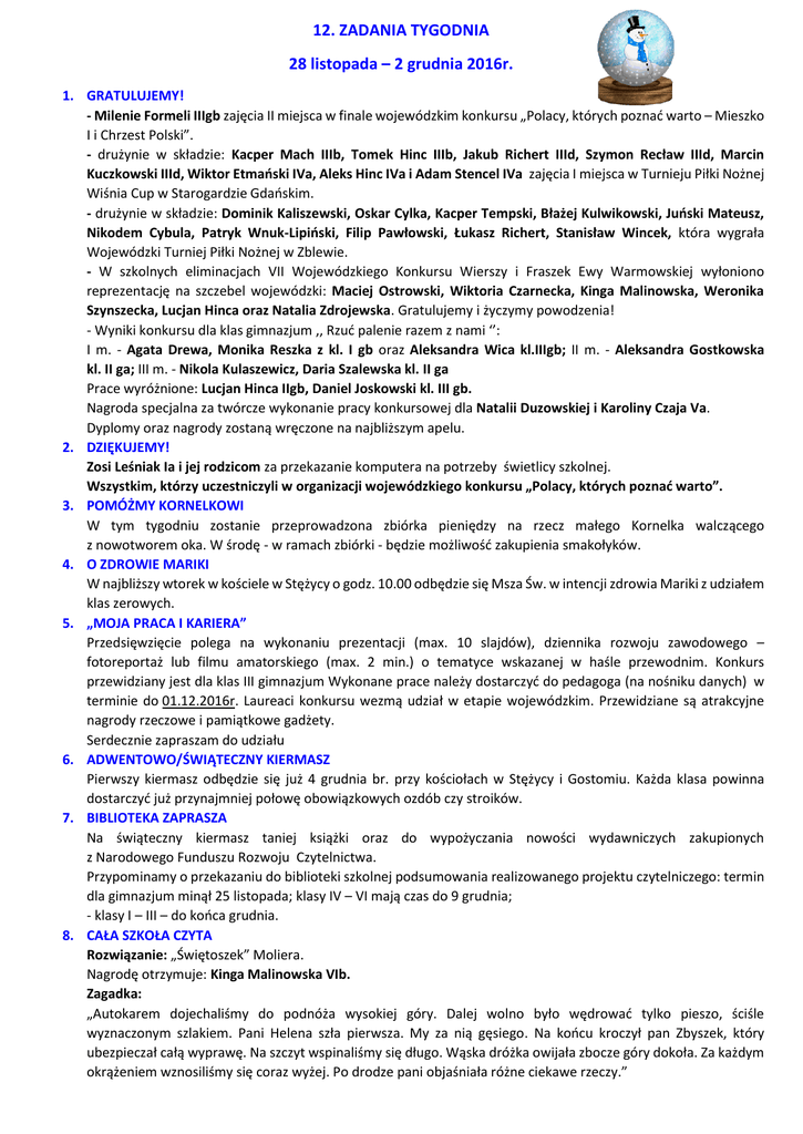 12. ZADANIA TYGODNIA 28 listopada – 2 grudnia 2016r. 1. GRATULUJEMY! - Milenie Formeli IIIgb zajęcia II miejsca w finale wojewódzkim konkursu „Polacy, których poznać warto – Mieszko I i Chrzest Polski”. - drużynie w składzie: Kacper Mach IIIb, Tomek Hinc IIIb, Jakub Richert IIId, Szymon Recław IIId, Marcin Kuczkowski IIId, Wiktor Etmański IVa, Aleks Hinc IVa i Adam Stencel IVa zajęcia I miejsca w Turnieju Piłki Nożnej Wiśnia Cup w Starogardzie Gdańskim. - drużynie w składzie: Dominik Kaliszewski, Oskar Cylka, Kacper Tempski, Błażej Kulwikowski, Juński Mateusz, Nikodem Cybula, Patryk Wnuk-Lipiński, Filip Pawłowski, Łukasz Richert, Stanisław Wincek, która wygrała Wojewódzki Turniej Piłki Nożnej w Zblewie. - W szkolnych eliminacjach VII Wojewódzkiego Konkursu Wierszy i Fraszek Ewy Warmowskiej wyłoniono reprezentację na szczebel wojewódzki: Maciej Ostrowski, Wiktoria Czarnecka, Kinga Malinowska, Weronika Szynszecka, Lucjan Hinca oraz Natalia Zdrojewska. Gratulujemy i życzymy powodzenia! - Wyniki konkursu dla klas gimnazjum ,, Rzuć palenie razem z nami ‘’: I m. - Agata Drewa, Monika Reszka z kl. I gb oraz Aleksandra Wica kl.IIIgb; II m. - Aleksandra Gostkowska kl. II ga; III m. - Nikola Kulaszewicz, Daria Szalewska kl. II ga Prace wyróżnione: Lucjan Hinca IIgb, Daniel Joskowski kl. III gb. Nagroda specjalna za twórcze wykonanie pracy konkursowej dla Natalii Duzowskiej i Karoliny Czaja Va. Dyplomy oraz nagrody zostaną wręczone na najbliższym apelu. 2. DZIĘKUJEMY! Zosi Leśniak Ia i jej rodzicom za przekazanie komputera na potrzeby świetlicy szkolnej. Wszystkim, którzy uczestniczyli w organizacji wojewódzkiego konkursu „Polacy, których poznać warto”. 3. POMÓŻMY KORNELKOWI W tym tygodniu zostanie przeprowadzona zbiórka pieniędzy na rzecz małego Kornelka walczącego z nowotworem oka. W środę - w ramach zbiórki - będzie możliwość zakupienia smakołyków. 4. O ZDROWIE MARIKI W najbliższy wtorek w kościele w Stężycy o godz. 10.00 odbędzie się Msza Św. w intencji zdrowia Mariki z udziałem klas zerowych. 5. „MOJA PRACA I KARIERA” Przedsięwzięcie polega na wykonaniu prezentacji (max. 10 slajdów), dziennika rozwoju zawodowego – fotoreportaż lub filmu amatorskiego (max. 2 min.) o tematyce wskazanej w haśle przewodnim. Konkurs przewidziany jest dla klas III gimnazjum Wykonane prace należy dostarczyć do pedagoga (na nośniku danych) w terminie do 01.12.2016r. Laureaci konkursu wezmą udział w etapie wojewódzkim. Przewidziane są atrakcyjne nagrody rzeczowe i pamiątkowe gadżety. Serdecznie zapraszam do udziału 6. ADWENTOWO/ŚWIĄTECZNY KIERMASZ Pierwszy kiermasz odbędzie się już 4 grudnia br. przy kościołach w Stężycy i Gostomiu. Każda klasa powinna dostarczyć już przynajmniej połowę obowiązkowych ozdób czy stroików. 7. BIBLIOTEKA ZAPRASZA Na świąteczny kiermasz taniej książki oraz do wypożyczania nowości wydawniczych zakupionych z Narodowego Funduszu Rozwoju Czytelnictwa. Przypominamy o przekazaniu do biblioteki szkolnej podsumowania realizowanego projektu czytelniczego: termin dla gimnazjum minął 25 listopada; klasy IV – VI mają czas do 9 grudnia; - klasy I – III – do końca grudnia. 8. CAŁA SZKOŁA CZYTA Rozwiązanie: „Świętoszek” Moliera. Nagrodę otrzymuje: Kinga Malinowska VIb. Zagadka: „Autokarem dojechaliśmy do podnóża wysokiej góry. Dalej wolno było wędrować tylko pieszo, ściśle wyznaczonym szlakiem. Pani Helena szła pierwsza. My za nią gęsiego. Na końcu kroczył pan Zbyszek, który ubezpieczał całą wyprawę. Na szczyt wspinaliśmy się długo. Wąska dróżka owijała zbocze góry dokoła. Za każdym okrążeniem wznosiliśmy się coraz wyżej. Po drodze pani objaśniała różne ciekawe rzeczy.”