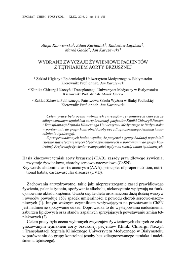 BROMAT. CHEM. TOKSYKOL. – XLIX, 2016, 3, str. 511 – 515 Alicja Karwowska1, Adam Kurianiuk 1, Radosław Łapiński 2 , Marek Gacko2, Jan Karczewski 3 WYBRANE ZWYCZAJE ŻYWIENIOWE PACJENTÓW Z TĘTNIAKIEM AORTY BRZUSZNEJ 1 2 Zakład Higieny i Epidemiologii Uniwersytetu Medycznego w Białymstoku Kierownik: Prof. dr hab. Jan Karczewski Klinika Chirurgii Naczyń i Transplantacji, Uniwersytet Medyczny w Białymstoku Kierownik: Prof. dr hab. Marek Gacko 3 Zakład Zdrowia Publicznego, Państwowa Szkoła Wyższa w Białej Podlaskiej Kierownik: Prof. dr hab. Jan Karczewski Celem pracy była ocena wybranych zwyczajów żywieniowych chorych ze zdiagnozowanym tętniakiem aorty brzusznej, pacjentów Kliniki Chirurgii Naczyń i Transplantacji Szpitala Klinicznego Uniwersytetu Medycznego w Białymstoku w porównaniu do grupy kontrolnej (osoby bez zdiagnozowanego tętniaka i nadciśnienia tętniczego). Z przeprowadzonych badań wynika, że pacjenci z grupy badanej popełniali istotnie statystycznie więcej błędów żywieniowych w porównaniu do grupy kontrolnej. Preferencje żywieniowe mogą mieć wpływ na rozwój zmian tętniakowych. Hasła kluczowe: tętniak aorty brzusznej (TAB), zasady prawidłowego żywienia, zwyczaje żywieniowe, choroby sercowo-naczyniowe (ChSN). Key words: abdominal aortic aneurysm (AAA), principles of proper nutrition, nutritional habits, cardiovascular diseases (CVD). Zachowania antyzdrowotne, takie jak: nieprzestrzeganie zasad prawidłowego żywienia, palenie tytoniu, spożywanie alkoholu, niekorzystnie wpływają na funkcjonowanie układu krążenia. Uważa się, że dieta urozmaicona dużą ilością warzyw i owoców powoduje 15% spadek umieralności z powodu chorób sercowo-naczyniowych (1). Innym ważnym czynnikiem wpływającym na powstawanie ChSN jest nadmierne spożywanie cukru. Doprowadza to do występowania nadciśnienia, zaburzeń lipidowych oraz stanów zapalnych sprzyjających powstawaniu zmian tętniakowych (2). Celem pracy była ocena wybranych zwyczajów żywieniowych chorych ze zdiagnozowanym tętniakiem aorty brzusznej, pacjentów Kliniki Chirurgii Naczyń i Transplantacji Szpitala Klinicznego Uniwersytetu Medycznego w Białymstoku w porównaniu do grupy kontrolnej (osoby bez zdiagnozowanego tętniaka i nadciśnienia tętniczego). 512 A. Karwowska i współpr. Nr 3 MATERIAŁ I METODY Ocena zachowań zdrowotnych dokonana została metodą sondażu diagnostycznego za pomocą kwestionariusza anonimowej ankiety konstrukcji własnej. Ankietę przeprowadzono wśród 50 pacjentów, którzy byli leczeni od stycznia 2015 r. do kwietnia 2016 r. na oddziale Kliniki Chirurgii Naczyń i Transplantacji Uniwersyteckiego Szpitala Klinicznego w Białymstoku. Grupę kontrolną stanowiło 50 losowo wybranych osób powyżej 50 r.ż, u których nie zdiagnozowano tętniaków aorty brzusznej oraz nadciśnienia tętniczego. Średnia wieku grupy badanej wynosiła 69 ± 13,53; grupy kontrolnej 62 ± 7,25. Do oceny statystycznej wyników użyto pakietu Statistica 10 firmy StatSoft z wykorzystaniem testu nieparametrycznego chi2. Wartość p < 0,05 uznano za istotną statystycznie. WYNIKI I ICH OMÓWIENIE Z przeprowadzonych badań wynika, że ponad połowa osób ankietowanych regularnie spożywa posiłki (66% osób z grupy badanej oraz 60% z grupy kontrolnej). Większość pacjentów z TAB główne dania i ostatni posiłek przed snem spożywała w odstępie krótszym niż grupa kontrolna (tab. I). Pacjenci z tętniakiem aorty częściej wybierali produkty pełnotłuste, mięso wieprzowe (82%), pieczywo jasne (76%), ser żółty (48%), wędliny (74%) oraz masło (40%). Osoby z grupy kontrolnej rzadziej jadły mięso czerwone, aż 28% ankietowanych (spożywających mięso) sięgało po nie tylko raz w tygodniu. Część osób z grupy kontrolnej (20%) zastąpiła tradycyjne sposoby przygotowywania posiłków gotowaniem na parze ograniczając utratę witamin, w tym kwasu askorbinowego, a także częściej sięgała po drób (68%) i ryby (62%). Zdecydowana większość ankietowanych pojadała między głównymi posiłkami. Badani z grupy kontrolnej istotnie statystycznie częściej sięgali po warzywa i owoce bogate w antyoksydanty, a cukier zastępowali miodem (tabela I) . Sposób żywienia wpływa na występowanie chorób układu krążenia (3). Europejskie Towarzystwo Kardiologiczne zaleca, aby profilatyka ChSN opierała się, m.in. na spożywaniu warzyw i owoców w ilości 200 g dziennie oraz ograniczeniu spożywania czerwonego mięsa oraz nasyconych kwasów tłuszczowych (4). Strom i Jensen potwierdzają, że zmniejszenie spożycia tłuszczu powoduje spadek liczby zgonów spowodowanych zmianami miażdżycowymi w naczyniach (5). W niniejszym badaniu grupa osób zdrowych deklarowała istotnie statystycznie większe spożycie warzyw i owoców w porównaniu do badanych z TAB. Flawonoidy zawarte w cytrusach oraz polifenole zawarte w jabłkach, dzięki działaniu antyoksydacyjnemu przeciwdziałają miażdżycy oraz występowaniu hiperlipidemii, które sprzyjają powstawaniu zmian tętniakowych (6). W badaniach własnych wykazano większe spożycie ryb w grupie kontrolnej. Wiąże się to ze zwiększonym dostarczaniem kwasów omega-3, wykazujących ochronny wpływ na śródbłonek naczyniowy poprzez stymulację syntezy tlenku azotu, co w konsekwencji obniża ciśnienie krwi. Kwasy omega-3 hamują generowanie wolnych rodników tlenowych oraz przeciwdziałają procesowi agregacji płytek (7). Nr 3 513 Wybrane zwyczaje żywieniowe pacjentów z tętniakiem aorty brzusznej T a b e l a I. Wybrane zwyczaje żywieniowe. T a b l e I. Selected eating habits. Grupa badana Cecha Przerwy między posiłkami Ostatni posiłek przed snem %1 Liczba (n) powyżej 4 godzin 12 24,00* 23 46,00* 3–4 godziny 29 58,00 21 42,00 3–2 godziny 9 18,00 6 12,00 poniżej 2 godzin 0 – 0 – powyżej 4 godzin 1 Produkty spożywane między posiłkami Spożywane warzywa 11 22,00* 21 42,00 19 38,00 3–2 godziny 19 38,00*