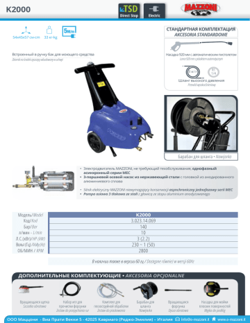TSD K2000 Direct Stop Electric СТАНДАРТНАЯ КОМПЛЕКТАЦИЯ AKCESORIA STANDARDOWE 5M/m 54x45x57 см-cm 33 кг-kg Встроенный в ручку бак для моющего средства Zbiornik na środek czyszczący wbudowany w uchwyt Насадка 920 мм с автоматическим пистолетом Lance 920 mm z pistoletem automatycznym 8 м/m R1 1/4 Шланг высокого давления Przewód wysokociśnieniowy Барабан для шланга · Nawijarka • Электродвигатель Mazzoni, не требующий техобслуживания, однофазный асинхронный серии MEC • 3-поршневой осевой насос из нержавеющей стали с головкой из анодированного алюминиевого сплава • Silnik elektryczny MAZZONI niewymagający konserwacji asynchroniczny jednofazowy serii MEC • Pompa osiowa 3 tłokowa ze stali z głowicą ze stopu aluminium anodyzowanego K2000 Модель/Model Код/Kod Бар/Bar л/мин - L/min Л.С.(кВт)/HP (kW) Вольт (Гц) /Volty (Hz) ОБ/МИН / RPM 3.023.14.069 140 10 3 (2.2) 230 ~ 1 (50) 2800 В наличии также в версии 60 гц / Dostępne również w wersji 60Hz ДОПОЛНИТЕЛЬНЫЕ КОМПЛЕКТУЮЩИЕ • AKCESORIA OPCJONALNE Вращающаяся щетка Szczotka obrotowa Набор игл для прочистки форсунки Zestaw do przepychania rur Комплект для пескоструйной обработки Zestaw do piaskowania Барабан для шланга Nawijarka Вращающаяся форсунка Dysza obrotowa ООО Маццони - Виа Прати Векки 5 - 42025 Кавриаго (Реджо-Эмилия) – Италия Насадка для мойки плоских поверхностей Myjka do podłóg E info@e�mazzoni.it H www.e�mazzoni.it