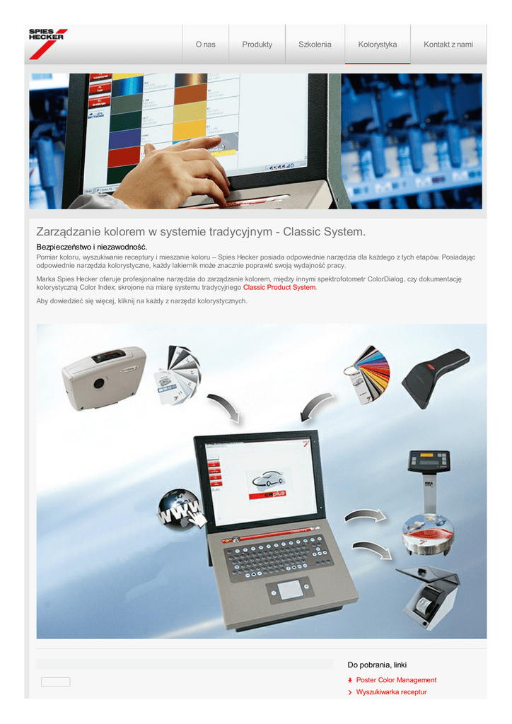O nas Produkty Szkolenia Kolorystyka Kontakt z nami Zarządzanie kolorem w systemie tradycyjnym - Classic System. Bezpieczeństwo i niezawodność. Pomiar koloru, wyszukiwanie receptury i mieszanie koloru – Spies Hecker posiada odpowiednie narzędzia dla każdego z tych etapów. Posiadając odpowiednie narzędzia kolorystyczne, każdy lakiernik może znacznie poprawić swoją wydajność pracy. Marka Spies Hecker oferuje profesjonalne narzędzia do zarządzanie kolorem, między innymi spektrofotometr ColorDialog, czy dokumentację kolorystyczną Color Index; skrojone na miarę systemu tradycyjnego Classic Product System. Aby dowiedzieć się więcej, kliknij na każdy z narzędzi kolorystycznych. Do pobrania, linki Poster Color Management Wyszukiwarka receptur Inne narzędzia http://www.axaltacoatingsystems.com/content/spieshecker_pl/pl_PL/colors/colour-management/colour-management-classic.print.html