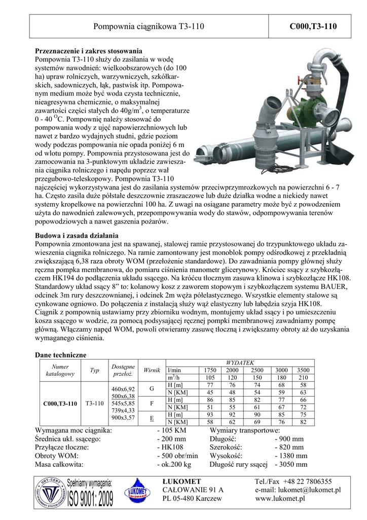 Pompownia ciągnikowa T3-110 C000,T3-110 Przeznaczenie i zakres stosowania Pompownia T3-110 służy do zasilania w wodę systemów nawodnień: wielkoobszarowych (do 100 ha) upraw rolniczych, warzywniczych, szkółkarskich, sadowniczych, łąk, pastwisk itp. Pompowanym medium może być woda czysta technicznie, nieagresywna chemicznie, o maksymalnej zawartości części stałych do 40g/m3, o temperaturze 0 - 40 OC. Pompownię należy stosować do pompowania wody z ujęć napowierzchniowych lub nawet z bardzo wydajnych studni, gdzie poziom wody podczas pompowania nie opada poniżej 6 m od wlotu pompy. Pompownia przystosowana jest do zamocowania na 3-punktowym układzie zawieszania ciągnika rolniczego i napędu poprzez wał przegubowo-teleskopowy. Pompownia T3-110 najczęściej wykorzystywana jest do zasilania systemów przeciwprzymrozkowych na powierzchni 6 - 7 ha. Często zasila duże półstałe deszczownie zraszaczowe lub duże działka wodne a niekiedy nawet systemy kropelkowe na powierzchni 100 ha. Z uwagi na osiągane parametry może być z powodzeniem użyta do nawodnień zalewowych, przepompowywania wody do stawów, odpompowywania terenów popowodziowych a nawet gaszenia pożarów. Budowa i zasada działania Pompownia zmontowana jest na spawanej, stalowej ramie przystosowanej do trzypunktowego układu zawieszenia ciągnika rolniczego. Na ramie zamontowany jest monoblok pompy odśrodkowej z przekładnią zwiększającą 6,38 raza obroty WOM (przełożenie standardowe). Do zawadniania pompy głównej służy ręczna pompka membranowa, do pomiaru ciśnienia manometr glicerynowy. Króciec ssący z szybkozłączem HK194 do podłączenia układu ssącego. Na króćcu tłocznym zasuwa klinowa i szybkozłącze HK108. Standardowy układ ssący 8” to: kolanowy kosz z zaworem stopowym i szybkozłączem systemu BAUER, odcinek 3m rury deszczownianej, i odcinek 2m węża półelastycznego. Wszystkie elementy stalowe są cynkowane ogniowo. Do połączenia z instalacją służy wąż elastyczny lub łabędzia szyja HK108. Ciągnik z pompownią ustawiamy przy zbiorniku wodnym, montujemy układ ssący i po umieszczeniu kosza ssącego w wodzie, za pomocą podsysającej ręcznej pompki membranowej zawadniamy pompę główną. Włączamy napęd WOM, powoli otwieramy zasuwę tłoczną i zwiększamy obroty aż do uzyskania wymaganego ciśnienia. Dane techniczne Numer katalogowy C000,T3-110 Typ Dostępne przełoż. T3-110 460x6,92 500x6,38 545x5,85 739x4,33 900x3,57 Wymagana moc ciągnika: Średnica ukł. ssącego: Przyłącze tłoczne: Obroty WOM: Masa całkowita: Wirnik G F E l/min m3/h H [m] N [KM] H [m] N [KM] H [m] N [KM] - 105 KM - 200 mm - HK108 - 500 obr/min - ok.200 kg 1750 105 77 45 86 51 93 58 WYDATEK 2000 2500 120 150 76 74 48 54 85 82 55 61 92 90 62 69 3000 180 68 59 77 67 85 76 3500 210 58 63 66 72 75 82 Wymiary transportowe: Długość: - 900 mm Szerokość: - 820 mm Wysokość: - 1380 mm Długość rury ssącej - 3050 mm ŁUKOMET CAŁOWANIE 91 A PL 05-480 Karczew Tel./Fax +48 22 7806355 e-mail: [email protected] www.lukomet.pl