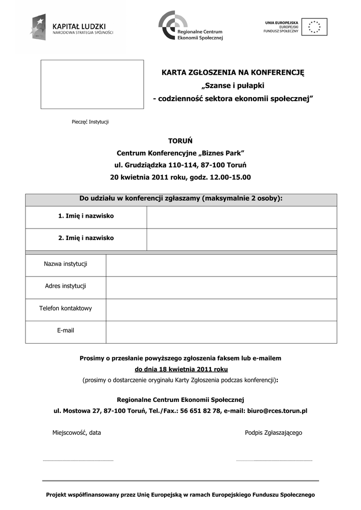 KARTA ZGŁOSZENIA NA KONFERENCJĘ „Szanse i pułapki - codzienność sektora ekonomii społecznej” Pieczęć Instytucji TORUŃ Centrum Konferencyjne „Biznes Park” ul. Grudziądzka 110-114, 87-100 Toruń 20 kwietnia 2011 roku, godz. 12.00-15.00 Do udziału w konferencji zgłaszamy (maksymalnie 2 osoby): 1. Imię i nazwisko 2. Imię i nazwisko Nazwa instytucji Adres instytucji Telefon kontaktowy E-mail Prosimy o przesłanie powyŜszego zgłoszenia faksem lub e-mailem do dnia 18 kwietnia 2011 roku (prosimy o dostarczenie oryginału Karty Zgłoszenia podczas konferencji): Regionalne Centrum Ekonomii Społecznej ul. Mostowa 27, 87-100 Toruń, Tel./Fax.: 56 651 82 78, e-mail: [email protected] Miejscowość, data ................................................................ Podpis Zgłaszającego ………………..................................................... Projekt współfinansowany przez Unię Europejską w ramach Europejskiego Funduszu Społecznego