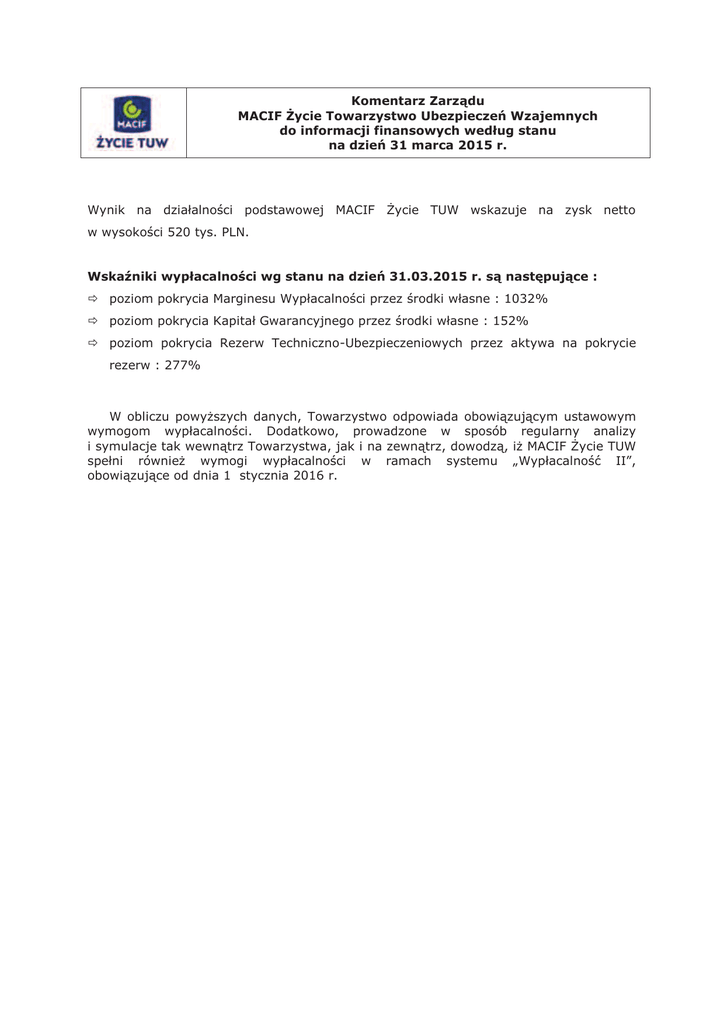 Komentarz Zarządu MACIF Życie Towarzystwo Ubezpieczeń Wzajemnych do informacji finansowych według stanu na dzień 31 marca 2015 r. Wynik na działalności podstawowej MACIF Życie TUW wskazuje na zysk netto w wysokości 520 tys. PLN. Wskaźniki wypłacalności wg stanu na dzień 31.03.2015 r. są następujące : ð poziom pokrycia Marginesu Wypłacalności przez środki własne : 1032% ð poziom pokrycia Kapitał Gwarancyjnego przez środki własne : 152% ð poziom pokrycia Rezerw Techniczno-Ubezpieczeniowych przez aktywa na pokrycie rezerw : 277% W obliczu powyższych danych, Towarzystwo odpowiada obowiązującym ustawowym wymogom wypłacalności. Dodatkowo, prowadzone w sposób regularny analizy i symulacje tak wewnątrz Towarzystwa, jak i na zewnątrz, dowodzą, iż MACIF Życie TUW spełni również wymogi wypłacalności w ramach systemu „Wypłacalność II”, obowiązujące od dnia 1 stycznia 2016 r. Macif ĩycie Towarzystwo UbezpieczeĔ Wzajemnych 31-03-2015 Nazwa zak!adu ubezpieczeĔ: Sprawozdanie sporządzone na dzieĔ: I. Bilans zak!adu ubezpieczeĔ 1.1 | Aktywa zak!adu ubezpieczeĔ Wyszczególnienie początek okresu koniec okresu A A. WartoĞci niematerialne i prawne 1. WartoĞü firmy 2. Inne wartoĞci niematerialne i prawne i zaliczki na poczet wartoĞci niematerialnych i prawnych B. Lokaty I. NieruchomoĞci 1. Grunty w!asne oraz prawo wieczystego uĪytkowania gruntu 2. Budynki, budowle oraz spó!dzielcze w!asnoĞciowe prawo do lokalu B C 3. Inwestycje budowlane i zaliczki na poczet tych inwestycji II. Lokaty w jednostkach podporządkowanych 1. Udzia!y lub akcje w jednostkach podporządkowanych 2. PoĪyczki udzielone jednostkom podporządkowanym oraz d!uĪne papiery wartoĞciowe emitowane przez te jednostki 3. Pozosta!e lokaty III. Inne lokaty finansowe 1. Udzia!y, akcje oraz inne papiery wartoĞciowe o zmiennej kwocie dochodu oraz jednostki uczestnictwa i certyfikaty inwestycyjne w funduszach inwestycyjnych 2. D!uĪne papiery wartoĞciowe i inne papiery wartoĞciowe o sta!ej kwocie dochodu 3. Udzia!y we wspólnych przedsiĊwziĊciach lokacyjnych 4. PoĪyczki zabezpieczone hipotecznie 5. Pozosta!e poĪyczki 6. Lokaty terminowe w instytucjach kredytowych 7. Pozosta!e lokaty IV. NaleĪnoĞci depozytowe od cedentów C. Aktywa netto ubezpieczeĔ na Īycie, gdy ryzyko lokaty (inwestycyjne) ponosi ubezpieczający D. NaleĪnoĞci I. NaleĪnoĞci z tytu!u ubezpieczeĔ bezpoĞrednich 1. NaleĪnoĞci od ubezpieczających 1.1. od jednostek podporządkowanych 1.2. od pozosta!ych jednostek 2. NaleĪnoĞci od poĞredników ubezpieczeniowych 2.1. od jednostek podporządkowanych 2.2. od pozosta!ych jednostek 3. Inne naleĪnoĞci 3.1. od jednostek podporządkowanych 3.2. od pozosta!ych jednostek II. NaleĪnoĞci z tytu!u reasekuracji 1. od jednostek podporządkowanych 2. od pozosta!ych jednostek III. Inne naleĪnoĞci 1.NaleĪnoĞci od budĪetu 2. Pozosta!e naleĪnoĞci 2.1. od jednostek podporządkowanych 2.2. od pozosta!ych jednostek E. Inne sk!adniki aktywów I. Rzeczowe sk!adniki aktywów II. ĝrodki pieniĊĪne III. Pozosta!e sk!adniki aktywów F. Rozliczenia miĊdzyokresowe I. Aktywa z tytu!u odroczonego podatku dochodowego II. Aktywowane koszty akwizycji III. Zarachowane odsetki i czynsze IV. Inne rozliczenia miĊdzyokresowe AKTYWA RAZEM Strona numer 2 Suma kontrolna FF0292DE 72 0 140 0 72 26 453 0 0 140 27 225 0 0 0 0 21 21 0 0 24 24 0 0 26 432 0 0 27 201 252 252 21 628 0 0 0 0 4 552 0 21 938 0 0 0 0 5 011 0 0 2 258 1 554 1 503 0 1 503 51 0 51 0 0 0 304 0 304 400 1 399 0 399 433 355 50 28 1 458 352 1 060 0 46 30 674 0 2 461 2 038 1 905 0 1 905 133 0 133 0 0 0 0 0 0 423 0 423 0 423 485 421 48 16 1 467 353 1 095 0 19 31 778 Nazwa zak!adu ubezpieczeĔ: Macif ĩycie Towarzystwo UbezpieczeĔ Wzajemnych Sprawozdanie sporządzone na dzieĔ: I. Bilans zak!adu ubezpieczeĔ 1.2 | Pasywa zak!adu ubezpieczeĔ 31-03-2015 Wyszczególnienie A A. Kapita! w!asny I. Kapita! podstawowy II. NaleĪne wp!aty na kapita! podstawowy (wielkoĞü ujemna) III. Akcje w!asne (wielkoĞü ujemna) IV. Kapita! (fundusz) zapasowy V. Kapita! (fundusz) z aktualizacji wyceny VI. Pozosta!e kapita!y rezerwowe VII. Zysk (strata) z lat ubieg!ych VIII. Zysk (strata) netto B. Zobowiązania podporządkowane C. Rezerwy techniczno - ubezpieczeniowe I. Rezerwa sk!adek i rezerwa na pokrycie ryzyka niewygas!ego II. Rezerwa ubezpieczeĔ na Īycie III. Rezerwy na niewyp!acone odszkodowania i Ğwiadczenia IV. Rezerwy na premie i rabaty dla ubezpieczonych V. Rezerwy na wyrównanie szkodowoĞci (ryzyka) VI. Rezerwy na zwrot sk!adek dla cz!onków VII. Pozosta!e rezerwy techniczno - ubezpieczeniowe okreĞlone w statucie VIII. Rezerwa ubezpieczeĔ na Īycie, gdy ryzyko lokaty (inwestycyjne) ponosi ubezpieczający D. Udzia! reasekuratorów w rezerwach techniczno ubezpieczeniowych (wielkoĞü ujemna) I. Udzia! reasekuratorów w rezerwie sk!adek i w rezerwie na pokrycie ryzyka niewygas!ego II. Udzia! reasekuratorów w rezerwie ubezpieczeĔ na Īycie III. Udzia! reasekuratorów w rezerwie na niewyp!acone odszkodowania i Ğwiadczenia IV. Udzia! reasekuratorów w rezerwie na premie i rabaty dla ubezpieczonych V. Udzia! reasekuratorów w pozosta!ych rezerwach okreĞlonych w statucie VI. Udzia! reasekuratorów w rezerwie ubezpieczeĔ na Īycie, gdy ryzyko lokaty (inwestycyjne) ponosi ubezpieczający E. Oszacowane regresy i odzyski (wielkoĞü ujemna) I. Oszacowane regresy i odzyski brutto II. Udzia! reasekuratorów w oszacowanych regresach i odzyskach F. Pozosta!e rezerwy I. Rezerwy na Ğwiadczenia emerytalne oraz inne obowiązkowe Ğwiadczenia pracowników II. Rezerwa z tytu!u odroczonego podatku dochodowego III. Inne rezerwy G. Zobowiązania z tytu!u depozytów reasekuratorów H. Pozosta!e zobowiązania i fundusze specjalne I. Zobowiązania z tytu!u ubezpieczeĔ bezpoĞrednich 1. Zobowiązania wobec ubezpieczających 1.1 wobec jednostek podporządkowanych 1.2. wobec pozosta!ych jednostek 2. Zobowiązania wobec poĞredników ubezpieczeniowy