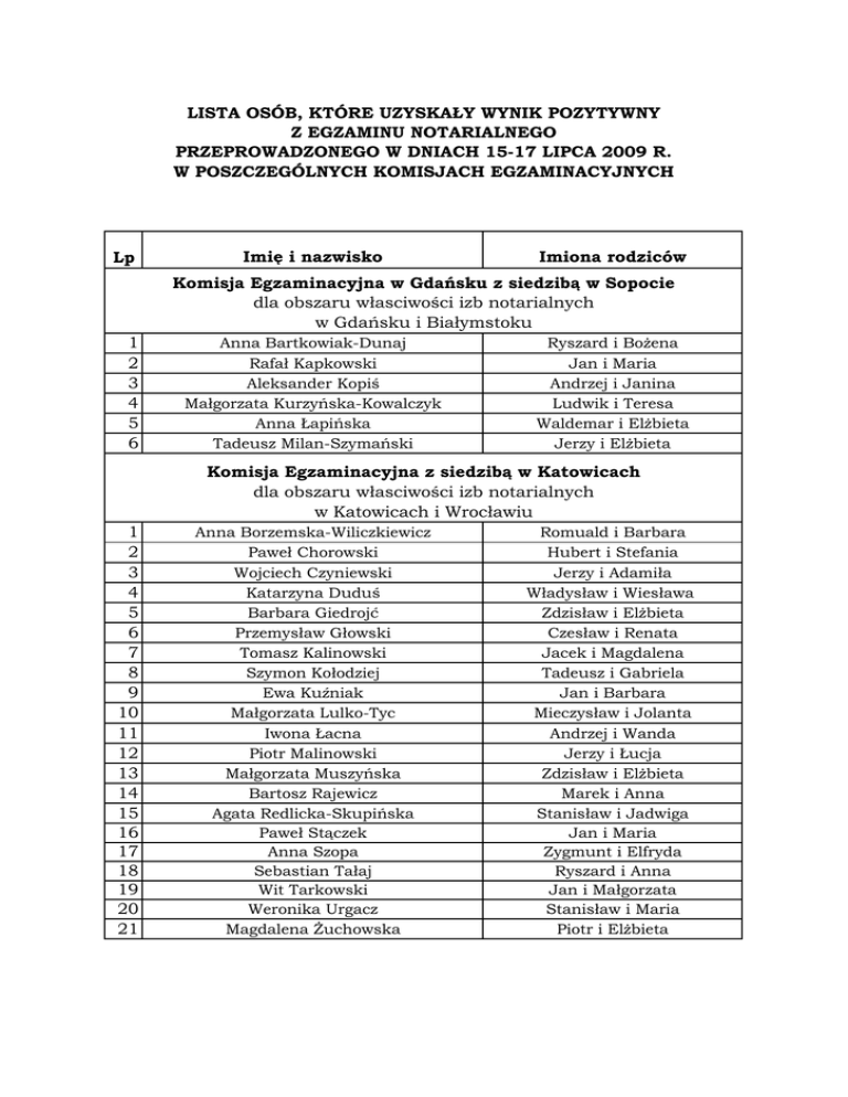 LISTA OSÓB, KTÓRE UZYSKAŁY WYNIK POZYTYWNY Z EGZAMINU NOTARIALNEGO PRZEPROWADZONEGO W DNIACH 15-17 LIPCA 2009 R. W POSZCZEGÓLNYCH KOMISJACH EGZAMINACYJNYCH Lp Imię i nazwisko Imiona rodziców Komisja Egzaminacyjna w Gdańsku z siedzibą w Sopocie dla obszaru własciwości izb notarialnych w Gdańsku i Białymstoku 1 2 3 4 5 6 Anna Bartkowiak-Dunaj Rafał Kapkowski Aleksander Kopiś Małgorzata Kurzyńska-Kowalczyk Anna Łapińska Tadeusz Milan-Szymański Ryszard i BoŜena Jan i Maria Andrzej i Janina Ludwik i Teresa Waldemar i ElŜbieta Jerzy i ElŜbieta Komisja Egzaminacyjna z siedzibą w Katowicach dla obszaru własciwości izb notarialnych w Katowicach i Wrocławiu 1 2 3 4 5 6 7 8 9 10 11 12 13 14 15 16 17 18 19 20 21 Anna Borzemska-Wiliczkiewicz Paweł Chorowski Wojciech Czyniewski Katarzyna Duduś Barbara Giedrojć Przemysław Głowski Tomasz Kalinowski Szymon Kołodziej Ewa Kuźniak Małgorzata Lulko-Tyc Iwona Łacna Piotr Malinowski Małgorzata Muszyńska Bartosz Rajewicz Agata Redlicka-Skupińska Paweł Stączek Anna Szopa Sebastian Tałaj Wit Tarkowski Weronika Urgacz Magdalena śuchowska Romuald i Barbara Hubert i Stefania Jerzy i Adamiła Władysław i Wiesława Zdzisław i ElŜbieta Czesław i Renata Jacek i Magdalena Tadeusz i Gabriela Jan i Barbara Mieczysław i Jolanta Andrzej i Wanda Jerzy i Łucja Zdzisław i ElŜbieta Marek i Anna Stanisław i Jadwiga Jan i Maria Zygmunt i Elfryda Ryszard i Anna Jan i Małgorzata Stanisław i Maria Piotr i ElŜbieta Komisja Egzaminacyjna z siedzibą w Krakowie dla obszaru własciwości izb notarialnych w Krakowie i Rzeszowie 1 2 3 4 5 6 7 8 9 10 11 12 13 14 15 16 17 18 Monika Baczyńska-Pytlik Marek Dyka Ewa Dziurzyńska Marzena Górowska Magdalena Hradecka-Madlewska Jerzy Koblański Marcin Kot Bartłomiej Lippa Piotr Mierniczek Barbara Miśkiewicz Edyta Niemirska Agnieszka Pudo Renata Rzeźniewska-Pal Marta Sajkiewicz-Zarzycka Marcin Solak Justyna Tuszyńska Roman Wendelski Grzegorz Wolczko Ryszard i Katarzyna Zygmunt i Halina Jan i GraŜyna Jan i Anna Roman i Genowefa Jerzy i Henryka Kazimierz i Ewa Wojciech i Kazimiera Stanisław i Zofia Henryk i Dorota Zbigniew i Mirosława Stanisław i Maria Józef i Zofia Stefan i Roswita Andrzej i Joanna Tadeusz i Zofia Jan i Marta Jan i Anna Komisja Egzaminacyjna z siedzibą w Poznaniu dla obszaru własciwości izb notarialnych w Poznaniu, Łodzi i Szczecinie 1 2 3 4 5 6 7 8 9 10 11 12 13 14 15 Joanna Baczyńska Karol Barański Michał Daleszyński Anna Grocholska Agnieszka Grzejszczak Mateusz Jabłoński Katarzyna Kordos Tomasz Król Weronika Kubacka Agata Laskowska Bogumiła Małek Joanna Maszorek Andrzej Rataj Łukasz Wilk Ireneusz Załuski Henryk i Anna Przemysław i Kinga Krzysztof i Zofia Zbyszek i Aleksanda Karol i Halina Florian i Ewa Bogdan i GraŜyna Krzysztof i Zofia Stanisław i Maria Marek i Małgorzata Janusz i ElŜbieta Jan i Ewa Aleksander i Maria Józef i Ewa Zbigniew i Lucyna Komisja Egzaminacyjna z siedzibą w Warszawie dla obszaru własciwości izb notarialnych w Warszawie i Lublinie 1 2 3 4 5 6 7 8 9 10 11 12 13 14 15 16 17 Marta Kolbusz Dagmara Konopka Zbigniew Krawczak Artur Leonarski Maciej Makowski Tomasz Markuszewski Karolina Matusiewicz Rafał Nasiłowski Hubert Perycz Karolina Pękala Ewa Rokos Mariusz Soczyński Milena Stempień-Jachowicz Dominik Szymczak Mirosław Więch Robert Wróblewski Marta Zabielska Marek i Małgorzata Henryk i Henryka Wojciech i ElŜbieta Stanisław i Danuta Janusz i Bogumiła Krzysztof i ElŜbieta Stanisław i Teresa Józef i Feliksa Andrzej i Ewa Marek i Barbara Henryk i Zofia Jarosław i Ewa Tadeusz i Barbara Konstanty i Anna Jan i Alicja Marian i Jolanta Andrzej i Jolanta