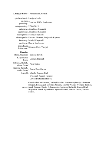 Latający kufer - Arkadiusz Klucznik tytuł realizacji: Latający kufer miejsce Teatr im. H.Ch. Andersena premiery: data premiery: 27-04-2013 reżyseria: Arkadiusz Klucznik scenariusz: Arkadiusz Klucznik scenografia: Maciej Chojnacki choreografia: Urszula Pietrzak, Wojciech Kaproń kostiumy: Maciej Chojnacki projekcje: Dawid Kozłowski konsultacje Şebnem Cirit (Turcja) kulturowe: Obsada: Hans Andersen - Bartosz Siwek Księżniczka - Urszula Pietrzak Esma Sułtan Abdullah, - Piotr Gajos ojciec Esmy Kadyna Zeyneb, - Roma Drozdówna matka Esmy Łabędź - Mirella Rogoza-Biel - Wojciech Kaproń (taniec) - Dawid Bartoszek (taniec) Oraz Ludzie z Odensee(Dania) i ludzie z Istambułu (Turcja) - Bożena Dragun, Ilona Zgiet, Gabriela Jaskuła, Maryla Wąsiel, Wioletta Tomica, uwagi: Jacek Dragun, Daniel Arbaczewski, Mateusz Kaliński, Konrad Biel, Bogusław Benek Byrski oraz Ryszard Drozd, Marcin Drozd, Dariusz Manel.
