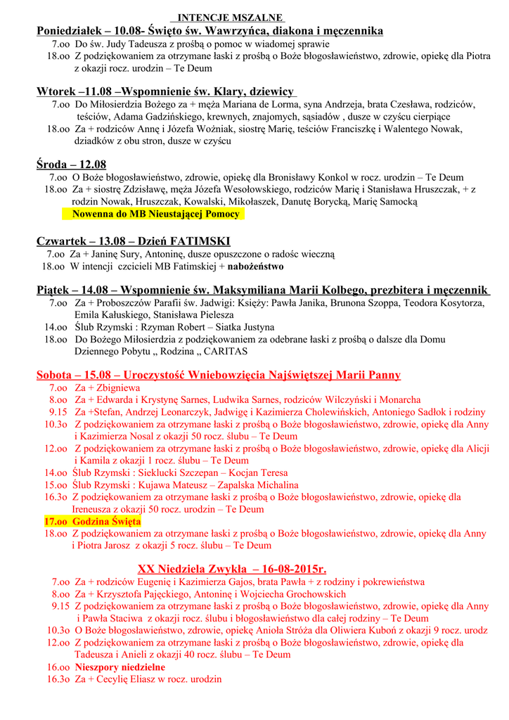 INTENCJE MSZALNE Poniedziałek – 10.08- Święto św. Wawrzyńca, diakona i męczennika 7.oo Do św. Judy Tadeusza z prośbą o pomoc w wiadomej sprawie 18.oo Z podziękowaniem za otrzymane łaski z prośbą o Boże błogosławieństwo, zdrowie, opiekę dla Piotra z okazji rocz. urodzin – Te Deum Wtorek –11.08 –Wspomnienie św. Klary, dziewicy 7.oo Do Miłosierdzia Bożego za + męża Mariana de Lorma, syna Andrzeja, brata Czesława, rodziców, teściów, Adama Gadzińskiego, krewnych, znajomych, sąsiadów , dusze w czyścu cierpiące 18.oo Za + rodziców Annę i Józefa Wożniak, siostrę Marię, teściów Franciszkę i Walentego Nowak, dziadków z obu stron, dusze w czyścu Środa – 12.08 7.oo O Boże błogosławieństwo, zdrowie, opiekę dla Bronisławy Konkol w rocz. urodzin – Te Deum 18.oo Za + siostrę Zdzisławę, męża Józefa Wesołowskiego, rodziców Marię i Stanisława Hruszczak, + z rodzin Nowak, Hruszczak, Kowalski, Mikołaszek, Danutę Borycką, Marię Samocką Nowenna do MB Nieustającej Pomocy Czwartek – 13.08 – Dzień FATIMSKI 7.oo Za + Janinę Sury, Antoninę, dusze opuszczone o radośc wieczną 18.oo W intencji czcicieli MB Fatimskiej + nabożeństwo Piątek – 14.08 – Wspomnienie św. Maksymiliana Marii Kolbego, prezbitera i męczennik 7.oo Za + Proboszczów Parafii św. Jadwigi: Księży: Pawła Janika, Brunona Szoppa, Teodora Kosytorza, Emila Kałuskiego, Stanisława Pielesza 14.oo Ślub Rzymski : Rzyman Robert – Siatka Justyna 18.oo Do Bożego Miłosierdzia z podziękowaniem za odebrane łaski z prośbą o dalsze dla Domu Dziennego Pobytu „ Rodzina „ CARITAS Sobota – 15.08 – Uroczystość Wniebowzięcia Najświętszej Marii Panny 7.oo 8.oo 9.15 10.3o 12.oo 14.oo 15.oo 16.3o 17.oo 18.oo Za + Zbigniewa Za + Edwarda i Krystynę Sarnes, Ludwika Sarnes, rodziców Wilczyński i Monarcha Za +Stefan, Andrzej Leonarczyk, Jadwigę i Kazimierza Cholewińskich, Antoniego Sadłok i rodziny Z podziękowaniem za otrzymane łaski z prośbą o Boże błogosławieństwo, zdrowie, opiekę dla Anny i Kazimierza Nosal z okazji 50 rocz. ślubu – Te Deum Z podziękowaniem za otrzymane łaski z prośbą o Boże błogosławieństwo, zdrowie, opiekę dla Alicji i Kamila z okazji 1 rocz. ślubu – Te Deum Ślub Rzymski : Sieklucki Szczepan – Kocjan Teresa Ślub Rzymski : Kujawa Mateusz – Zapalska Michalina Z podziękowaniem za otrzymane łaski z prośbą o Boże błogosławieństwo, zdrowie, opiekę dla Ireneusza z okazji 50 rocz. urodzin – Te Deum Godzina Święta Z podziękowaniem za otrzymane łaski z prośbą o Boże błogosławieństwo, zdrowie, opiekę dla Anny i Piotra Jarosz z okazji 5 rocz. ślubu – Te Deum XX Niedziela Zwykła – 16-08-2015r. 7.oo Za + rodziców Eugenię i Kazimierza Gajos, brata Pawła + z rodziny i pokrewieństwa 8.oo Za + Krzysztofa Pajęckiego, Antoninę i Wojciecha Grochowskich 9.15 Z podziękowaniem za otrzymane łaski z prośbą o Boże błogosławieństwo, zdrowie, opiekę dla Anny i Pawła Staciwa z okazji rocz. ślubu i błogosławieństwo dla całej rodziny – Te Deum 10.3o O Boże błogosławieństwo, zdrowie, opiekę Anioła Stróża dla Oliwiera Kuboń z okazji 9 rocz. urodz 12.oo Z podziękowaniem za otrzymane łaski z prośbą o Boże błogosławieństwo, zdrowie, opiekę dla Tadeusza i Anieli z okazji 40 rocz. ślubu – Te Deum 16.oo Nieszpory niedzielne 16.3o Za + Cecylię Eliasz w rocz. urodzin