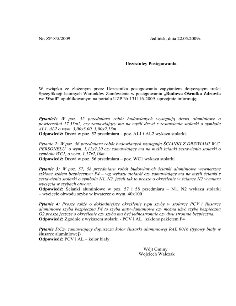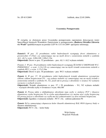 Nr. ZP-8/5/2009 Jedlińsk, dnia 22.05.2009r. Uczestnicy Postępowania W związku ze złoŜonym przez Uczestnika postępowania zapytaniem dotyczącym treści Specyfikacji Istotnych Warunków Zamówienia w postępowaniu „Budowa Ośrodka Zdrowia we Wsoli” opublikowanym na portalu UZP Nr 131116-2009 uprzejmie informuję: Pytanie1: W poz. 52 przedmiaru robót budowlanych występują drzwi aluminiowe o powierzchni 17,55m2, czy zamawiający ma na myśli drzwi z zestawienia stolarki o symbolu AL1, AL2 o wym. 3,00x3,00, 3,00x2,15m Odpowiedź: Drzwi w poz. 52 przedmiaru – poz. AL1 i AL2 wykazu stolarki. Pytanie 2: W poz. 56 przedmiaru robót budowlanych występują ŚCIANKI Z DRZWIAMI W.C. PERSONELU o wym. 1,12x2,20 czy zamawiający ma na myśli ścianki zestawienia stolarki o symbolu WC1, o wym. 1,17x2,10m Odpowiedź: Drzwi w poz. 56 przedmiaru – poz. WC1 wykazu stolarki Pytanie 3: W poz. 57, 58 przedmiaru robót budowlanych ścianki aluminiowe wewnętrzne szklone szkłem bezpiecznym P4 – wg wykazu stolarki czy zamawiający ma na myśli ścianki z zestawienia stolarki o symbolu N1, N2, jeŜeli tak to proszę o określenie w ściance N2 wymiaru wycięcia w szybach otworu. Odpowiedź: Ścianki aluminiowe w poz. 57 i 58 przedmiaru – N1, N2 wykazu stolarki – wycięcie obwodu szyby w kwaterze o wym. 40x100 Pytanie 4: Proszę takŜe o dokładniejsze określenie typu szyby w stolarce PCV i ślusarce aluminiowe szyba bezpieczna P4 to szyba antywłamaniowa czy moŜna uŜyć szybę bezpieczną O2 proszę jeszcze o określenie czy szyba ma być jednostronnie czy dwu stronnie bezpieczna. Odpowiedź: Zgodnie z wykazem stolarki - PCV i AL szklone pakietem P4 Pytanie 5:Czy zamawiający dopuszcza kolor ślusarki aluminiowej RAL 0016 (typowy biały w ślusarce aluminiowej) Odpowiedź: PCV i AL – kolor biały Wójt Gminy Wojciech Walczak