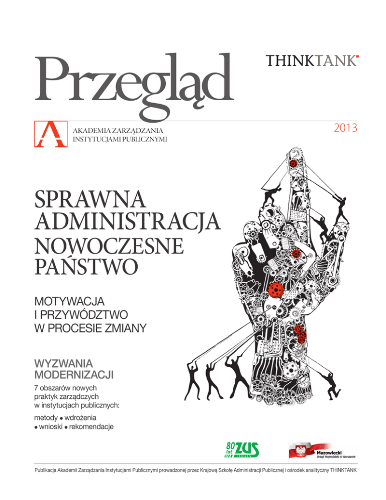 Przeglad Akademia Zarządzania Instytucjami Publicznymi 2013 SPRAWNA ADMINISTRACJA NOWOCZESNE PAŃSTWO Motywacja i przywództwo w procesie zmiany WYZWANIA MODERNIZACJI 7 obszarów nowych praktyk zarządczych w instytucjach publicznych: metody wdrożenia wnioski rekomendacje Publikacja Akademii Zarządzania Instytucjami Publicznymi prowadzonej przez Krajową Szkołę Administracji Publicznej i ośrodek analityczny THINKTANK Akademia Zarządzania Instytucjami Publicznymi Podnosimy kompetencje zarządcze liderów i menedżerów administracji centralnej i samorządowej. Umożliwiamy wymianę wiedzy i dobrych praktyk między instytucjami publicznymi. Projekt jest kontynuacją pilotażu realizowanego z inicjatywy ZUS i MUW w okresie wrzesień 2012 – maj 2013 r. Zapraszamy na nowy cykl warsztatów! [email protected] wnioski » Rekomendacje THINKTANK 1. Instytucje publiczne muszą się modernizować i podnosić własną efektywność. Tego oczekują obywatele, coraz lepiej wykształceni i bardziej świadomi rozwiązań na sektor publiczny są bowiem ograniczane. Metody zarządcze służące podnoszeniu skuteczności działania organizacji zostały już opracowane przez firmy. Warto, aby administracja, uwzględniając swoją specyfikę, korzystała z doświadczeń biznesu. 2. Jedną z metod sprawdzonych przez przedsiębiorstwa jest zarządzanie przez cele. wytyczaniu zadań dla pojedynczych osób i całej organizacji. Zarządzanie przez cele jest także wdrażane w administracji, w Polsce m.in. przez Zakład Ubezpieczeń Społecznych i Mazowiecki Urząd Wojewódzki. W sferze publicznej w procesie zarządzania stosowane jest w wielu jednostkach: zarządzanie procesowe, zarządzanie ryzykiem i zarządzanie IT. Lepszemu zrozumieniu potrzeb społecznych służyć mogą badania satysfakcji klienta (obywatela) i rozwinięcie kompetencji analitycznych pracowników administracji, a efektywniejszej pracy urzędników – stosowanie systemów motywacyjnych. 3. W modernizowaniu administracji nie do przecenienia jest postęp technologiczny, który zmienia sposób funkcjonowania instytucji, m.in. w zakresie kolekcjonowania i analizy danych czy komunikacji z klientem. Technologie umożliwiają też pomiar wprowadzanych zmian organizacyjnych, a co za tym idzie – udowadnianie, że przekładają się one na wyższą efektywność. 4. Modernizowanie instytucji publicznych wymaga czasu, nie uda się jednak bez zaangażowania kierownictwa i zmiany postaw pracowników. Aby zmiana przyniosła efekty, urzędnicy muszą rozumieć jej cele i widzieć w tym zawodowe korzyści. Najlepiej o tym mówić poprzez przykłady, dlatego warto organizować warsztaty prezentujące wdrożenia nowych rozwiązań zarządczych w konkretnych instytucjach. Jest to szczególnie ważne dla liderów i menedżerów administracji. Wymiana doświadczeń i rekomendacji pozwala im szybciej się uczyć, jak wprowadzać zmiany, jak definiować główne ich bariery i znajdować sposoby, aby je przełamywać. | Przegląd 2013 Polega ono na wspólnym ich określaniu przez przełożonych i podwładnych oraz REKOMENDACJE wdrażanych na świecie. Wymusza to także polityka budżetowa – z roku na rok środki str. 4 J eśli modernizować, to metodycznie Zbigniew Derdziuk 6Sprawna administracja działa przez cele Wydawcą publikacji jest ośrodek analityczny THINKTANK. Naszą misją jest inspirowanie debaty publicznej w Polsce oraz dostarczanie liderom biznesu i administracji publicznej wiedzy i narzędzi do podejmowania lepszych decyzji. Najlepsze polskie praktyki popularyzujemy za granicą. www.mttp.pl, www.ttpolska.eu Jacek Kozłowski 13 16 22 III O rganizacja nastawiona na klienta wa r s z tat y 19 el: skuteczna C administracja II Egzamin dojrzałości procesowej IV R yzyko wliczone w zarządzanie V Informatyzacja zoptymalizowana 25 VI Urzędnik analitykiem? 28 Przegląd 2013| spis treści 10 I VII P racownik kompetentny i zaangażowany ul. Mińska 25, 03-808 Warszawa tel. 22 628 20 04, 22 628 04 10, faks 22 628 04 12 e-mail: [email protected] Partnerzy zarządzający: dr Małgorzata Bonikowska, [email protected] Paweł Rabiej, [email protected] Dyrektor wykonawczy: Michał Smagowicz, [email protected] Dyrektor artystyczny: Katarzyna Zbytniewska, [email protected] Grafik: Monika Chylińska Programy i projekty THINKTANK: Marcin Dąbrowski [email protected], tel. kom. 608 638 258 Alicja Defratyka [email protected], tel. kom. 600 330 437 Urszula Borzym [email protected], tel. kom. 608 639 956 Renata Ert-Eberdt [email protected], tel. kom. 608 360 063 Jan Sokolik, [email protected], tel. kom. 608 638 389 Komunikacja: Mateusz Barczyk [email protected], tel. kom. 608 885 284 Marta Murawska, [email protected] Multimedia: Rafał Szyc, [email protected] 31siedem warsztatów pierwszego cyklu Akademii – podsumowanie Biuro THINKTANK i dystrybucja publikacji: Justyna Budzyńska-Wasiak, [email protected] tel. 22 628 20 04, tel. kom. 608 593 632 THINKTANK Sp. z o.o. KRS 0000325641, NIP 701-01-83-649, REGON 141839360 Zarząd: Paweł Rabiej (prezes) dr Małgorzata Bonikowska (członek zarządu) Partnerem publikacji jest Ośrodek Rozwoju i Innowacji Krajowej Szkoły Administracji Publicznej, której misją jest kształcenie i przygotowywanie do służby publicznej członków korpusu służby cywilnej oraz kadr wyższych urzędników dla administracji Rzeczypospolitej Polskiej. Krajowa Szkoła Administracji Publicznej, Ośrodek Rozwoju i Innowacji ul. Wawelska 56, 00-922 Warszawa, tel. 48 22 60 80 111, email: [email protected] Koncepcja redakcyjna publikacji: dr Małgorzata Bonikowska, Zbigniew Derdziuk, Jacek Kozłowski Opracowanie tekstów: Kazimierz Żurek Konsultacja: dr Małgorzata Bonikowska Koordynator wydawnictwa: Anna Chyckowska Nakład: 1000 egzemplarzy ISBN: 978-83-63460-24-2 THINKTANK dziękuje pracownikom ZUS oraz MUW za pomoc przy realizacji publikacji. MYŚLI, O KTÓRYCH SIĘ MÓWI Nowe idee i trendy dla polskich liderów Przywództwo, innowacje, ro