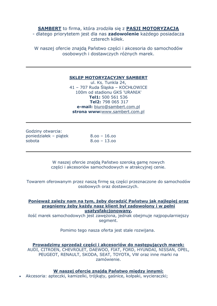 SAMBERT to firma, która zrodziła się z PASJI MOTORYZACJĄ - dlatego priorytetem jest dla nas zadowolenie każdego posiadacza czterech kółek. W naszej ofercie znajdą Państwo części i akcesoria do samochodów osobowych i dostawczych różnych marek. SKLEP MOTORYZACYJNY SAMBERT ul. Ks. Tunkla 24, 41 – 707 Ruda Śląska – KOCHŁOWICE 100m od stadionu GKS 'URANIA' Tel1: 500 561 536 Tel2: 798 065 317 e-mail: [email protected] strona www:www.sambert.com.pl Godziny otwarcia: poniedziałek – piątek sobota 8.oo – 16.oo 8.oo – 13.oo W naszej ofercie znajdą Państwo szeroką gamę nowych części i akcesoriów samochodowych w atrakcyjnej cenie. Towarem oferowanym przez naszą firmę są części przeznaczone do samochodów osobowych oraz dostawczych. Ponieważ zależy nam na tym, żeby doradzić Państwu jak najlepiej oraz pragniemy żeby każdy nasz klient był zadowolony i w pełni usatysfakcjonowany, ilość marek samochodowych jest zawężona, jednak obejmuje najpopularniejszy segment. Pomimo tego nasza oferta jest stale rozwijana. Prowadzimy sprzedaż części i akcesoriów do następujących marek: AUDI, CITROEN, CHEVROLET, DAEWOO, FIAT, FORD, HYUNDAI, NISSAN, OPEL, PEUGEOT, RENAULT, SKODA, SEAT, TOYOTA, VW oraz inne marki na zamówienie. W naszej ofercie znajdą Państwo między innymi: Akcesoria: apteczki, kamizelki, trójkąty, gaśnice, kołpaki, wycieraczki; Chemia i kosmetyki samochodowe; Chłodzenie silnika: chłodnice, pompy wody, termostaty, wentylatory; Filtry: oleju, powietrza, kabinowe (przeciwpyłkowe), paliwa; Oleje i płyny eksploatacyjne: oleje silnikowe , oleje przekładniowe, oleje do układów wspomagania, dodatki do olejów i paliw, do układu chłodzenia, smary; Silnik i osprzęt: łańcuchowe zestawy rozrządu, miski olejowe, mechanizmy rozrządu, paski napędowe, paski rozrządu; Układ elektryczny i zapłonowy: akumulatory, czujniki, materiały instalacyjne, świece zapłonowe, świece żarowe, przewody zapłonowe, cewki zapłonowe; Układ hamulcowy: bębny, cylinderki, klocki, linki hamulcowe, pompy hamulcowe, szczęki, tarcze; Układ napędowy: sprzęgła, koła dwumasowe, przeguby napędowe; Sondy lambda, tłumiki; Zawieszenie i układ kierowniczy: amortyzatory, końcówki drążków kierowniczych, łączniki stabilizatorów, łożyska kół, sprężyny, sworznie, tuleje, wahacze; Naszym głównym celem jest Państwa zadowolenie - dlatego priorytetem dla nas jest doradzenie Państwu, a dopiero później dostarczenie części o jak najlepszej jakości w jak najlepszej cenie. Prowadzimy sklep stacjonarny w Rudzie Śląskiej oraz sprzedaż internetową (wysyłkową). Cały czas zwiększamy asortyment, dzięki czemu wychodząc naprzeciw zapotrzebowaniu klientów oferujemy możliwość zakupu części renomowanych i cenionych marek takich jak: ATE, BOSCH, SKF, LUK, INA, MOOG, LEMFORDER, SWAG i wiele innych, gwarantując przy tym ich oryginalność i wzorowe wykonanie. W sprzedaży posiadamy także wysokiej jakości zamienniki innych, mniej znanych firm, które zwykle nie odbiegają niezawodnością w użytkowaniu. Produkty, które można u nas kupić nabywamy wyłącznie u certyfikowanych dostawców, co uniemożliwia uzyskanie nieoryginalnych części. Nasze części pochodzą od tych samych dostawców u których zaopatrują się autoryzowane warsztaty i serwisy samochodowe. Klientów z Rudy Śląskiej i okolic zapraszamy do odwiedzenia naszego sklepu stacjonarnego, aby na własne oczy przekonać się o oryginalności i szerokiej gamie naszych produktów. Wielu z Was odwiedziło nasz sklep i zostało naszymi stałymi klientami! Zapraszamy do współpracy warsztaty samochodowe, firmy, sklepy, taksówkarzy. Każdy stały klient jest u nas doceniany, o czym można się przekonać podejmując z nami trwałą współpracę! Nasz personel gwarantuje indywidualne podejście do każdego klienta oraz fachową pomoc przy doborze odpowiedniej części. ZAPRASZAMY DO SKORZYSTANIA Z NASZYCH USŁUG BEZPOŚREDNIO W SIEDZIBIE FIRMY LUB NA POLSKICH SERWISACH AUKCYJNYCH - KLIKNIJ! WSZELKIE DODATKOWE INFORMACJE ZNAJDĄ PAŃSTWO NA NASZEJ STRONIE INTERNETOWEJ.