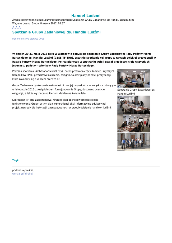 Handel Ludzmi Źródło: http://handelludzmi.eu/hl/aktualnosci/6858,Spotkanie-Grupy-Zadaniowej-ds-Handlu-Ludzmi.html Wygenerowano: Środa, 8 marca 2017, 05:37 AAA Spotkanie Grupy Zadaniowej ds. Handlu Ludźmi Dodane dnia 01 czerwca 2016 W dniach 30-31 maja 2016 roku w Warszawie odbyło się spotkanie Grupy Zadaniowej Rady Państw Morza Bałtyckiego ds. Handlu Ludźmi (CBSS TF-THB), ostatnie spotkanie tej grupy w ramach polskiej prezydencji w Radzie Państw Morza Bałtyckiego. Po raz pierwszy w spotkaniu wzięli udział przedstawiciele wszystkich jedenastu państw – członków Rady Państw Morza Bałtyckiego. Podczas spotkania, Ambasador Michał Czyż polski przewodniczący Komitetu Wyższych Urzędników RPMB przedstawił założenia, osiągnięcia oraz plany polskiej prezydencji, która zakończy się z końcem czerwca br. Grupa Zadaniowa dyskutowała natomiast nt. swojej przyszłości – w związku z mijającym w listopadzie 2016 dziesięcioleciem funkcjonowania Grupy, dokonano oceny jej Spotkanie Grupy Zadaniowej ds. osiągnięć, a także wyznaczono kierunki działań na kolejne lata. Handlu Ludźmi Sekretariat TF-THB zaprezentował również plan obchodów dziesięciolecia funkcjonowania Grupy, w tym plan wzmocnionej akcji informacyjno-edukacyjnej i projekt nagrody dla instytucji, zaangażowanych w przeciwdziałanie handlowi ludźmi. Tagi: podziel się treścią: wersja pdf drukuj