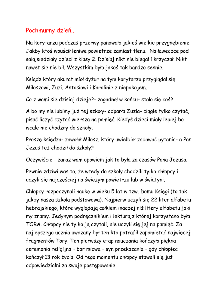 Pochmurny dzień.. Na korytarzu podczas przerwy panowało jakieś wielkie przygnębienie. Jakby ktoś wpuścił leniwe powietrze zamiast tlenu. Na ławeczce pod salą siedziały dzieci z klasy 2. Dzisiaj nikt nie biegał i krzyczał. Nikt nawet się nie bił. Wszystkim było jakoś tak bardzo sennie. Ksiądz który akurat miał dyżur na tym korytarzu przyglądał się Miłoszowi, Zuzi, Antosiowi i Karolinie z niepokojem. Co z wami się dzisiaj dzieje?- zagadnął w końcu- stało się coś? A bo my nie lubimy już tej szkoły- odparła Zuzia- ciągle tylko czytać, pisać liczyć czytać wiersza na pamięć. Kiedyś dzieci miały lepiej bo wcale nie chodziły do szkoły. Proszę księdza- zawołał Miłosz, który uwielbiał zadawać pytania- a Pan Jezus też chodził do szkoły? Oczywiście- zaraz wam opowiem jak to była za czasów Pana Jezusa. Pewnie zdziwi was to, że wtedy do szkoły chodzili tylko chłopcy i uczyli się najczęściej na świeżym powietrzu lub w świątyni. Chłopcy rozpoczynali naukę w wieku 5 lat w tzw. Domu Księgi (to tak jakby nasza szkoła podstawowa). Najpierw uczyli się 22 liter alfabetu hebrajskiego, które wyglądają całkiem inaczej niż litery alfabetu jaki my znamy. Jedynym podręcznikiem i lekturą z której korzystano była TORA. Chłopcy nie tylko ją czytali, ale uczyli się jej na pamięć. Za najlepszego ucznia uważany był ten kto potrafił zapamiętać najwięcej fragmentów Tory. Ten pierwszy etap nauczania kończyła piękna ceremonia religijna – bar micwa – syn przekazania – gdy chłopiec kończył 13 rok życia. Od tego momentu chłopcy stawali się już odpowiedzialni za swoje postępowanie. Dziewczęta potrzebną naukę pobierały w domu od swoich matek, gdzie uczyły się gotowania i przyrządzania posiłków, dbania o gospodarstwo. Przy tym dowiadywały się o zwyczajach i religii swojego narodu. Chodź nie czytały Tory poznawały od praktycznej strony te wszystkie prawa o których chłopcy uczyli się w szkole. Często uczono je także śpiewu, tańca i gry na instrumentach takich jak harfa, flet, tamburyno. Co to jest Tora- zapytała Karolinka. TORA to Święta Księga Izraela zawierająca pierwszych pięć ksiąg Starego Testamentu, które przypisywane są Mojżeszowi. Księga Rodzaju, Księga Wyjścia, Księga Kapłańska, Księga Liczb i Księga Powtórzonego Prawa. Dzieci miały jeszcze masę pytań ale zadzwonił dzwonek i pobiegły do klasy przekonane że nawet 2000lat temu trzeba było się uczyć czytać i liczyć .