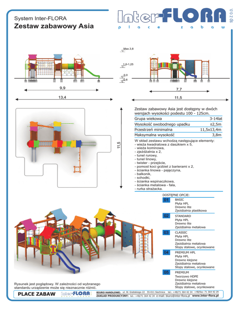 sp z o.o. System Inter-FLORA Zestaw zabawowy Asia Max.3,8 1,0-1,25 0,0 -0,6 9,9 7,7 13,4 11,5 Zestaw zabawowy Asia jest dostępny w dwóch wersjach wysokości podestu 100 - 125cm. Grupa wiekowa 3-14lat 11,5 Wysokość swobodnego upadku Przestrzeń minimalna Maksymalna wysokość ≤2,5m 11,5x13,4m 3,8m W skład zestawu wchodzą następujące elementy: - wieża kwadratowa z daszkiem x 5, - wieża kominowa, - zjeżdżalnia x 2, - tunel rurowy, - tunel linowy, - twister - przejście, - pomost koci grzbiet z barierami x 2, - ścianka linowa - pajęczyna, - balkonik, - schodki, - ścianka wspinaczkowa, - ścianka metalowa - fala, - rurka strażacka. DOSTĘPNE OPCJE: 01 BASIC Płyta HPL Drewno lite Zjeżdżalnia plastikowa 02 STANDARD Płyta HPL Drewno lite Zjeżdżalnia metalowa 03 CLASSIC Płyta HPL Drewno lite Zjeżdżalnia metalowa Stopy stalowe, ocynkowane 04 PREMIUM HPL Płyta HPL Drewno klejone Zjeżdżalnia metalowa Stopy stalowe, ocynkowane 05 PREMIUM Tworzywo HDPE Drewno klejone Zjeżdżalnia metalowa Stopy stalowe, ocynkowane PLACE ZABAW sp z o.o. Rysunek jest poglądowy. W zależności od wybranego standardu urządzenie może się nieznacznie różnić. BIURO HANDLOWE: ul. W. Grabskiego 22 55-011 Siechnice tel.: +48/71 364 42 34 +48/fax: 71 364 42 29 ZAKŁAD PRODUKCYJNY: tel.: +48/71 364 42 34 e-mail: [email protected] www.inter-flora.pl
