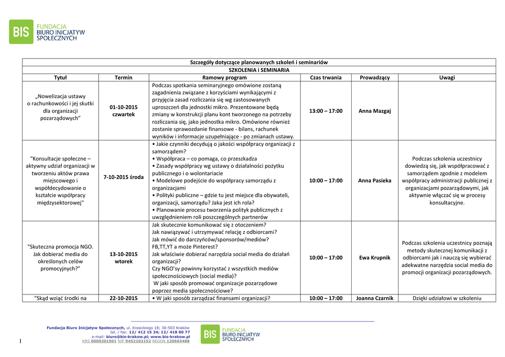 Tytuł „Nowelizacja ustawy o rachunkowości i jej skutki dla organizacji pozarządowych” "Konsultacje społeczne – aktywny udział organizacji w tworzeniu aktów prawa miejscowego i współdecydowanie o kształcie współpracy międzysektorowej" Termin 01-10-2015 czwartek 7-10-2015 środa "Skuteczna promocja NGO. Jak dobierać media do określonych celów promocyjnych?” 13-10-2015 wtorek "Skąd wziąć środki na 22-10-2015 Szczegóły dotyczące planowanych szkoleń i seminariów SZKOLENIA i SEMINARIA Ramowy program Czas trwania Podczas spotkania seminaryjnego omówione zostaną zagadnienia związane z korzyściami wynikającymi z przyjęcia zasad rozliczania się wg zastosowanych uproszczeń dla jednostki mikro. Prezentowane będą 13:00 – 17:00 zmiany w konstrukcji planu kont tworzonego na potrzeby rozliczania się, jako jednostka mikro. Omówione również zostanie sprawozdanie finansowe - bilans, rachunek wyników i informacje uzupełniające - po zmianach ustawy. • Jakie czynniki decydują o jakości współpracy organizacji z samorządem? • Współpraca – co pomaga, co przeszkadza • Zasady współpracy wg ustawy o działalności pożytku publicznego i o wolontariacie • Modelowe podejście do współpracy samorządu z 10:00 – 17:00 organizacjami • Polityki publiczne – gdzie tu jest miejsce dla obywateli, organizacji, samorządu? Jaka jest ich rola? • Planowanie procesu tworzenia polityk publicznych z uwzględnieniem roli poszczególnych partnerów Jak skutecznie komunikować się z otoczeniem? Jak nawiązywać i utrzymywać relację z odbiorcami? Jak mówić do darczyńców/sponsorów/mediów? FB,TT,YT a może Pinterest? Jak właściwie dobierać narzędzia social media do działań 10:00 – 17:00 organizacji? Czy NGO’sy powinny korzystać z wszystkich mediów społecznościowych (social media)? W jaki sposób promować organizacje pozarządowe poprzez media społecznościowe? • W jaki sposób zarządzać finansami organizacji? 10:00 – 17:00 Prowadzący Anna Mazgaj Anna Pasieka Podczas szkolenia uczestnicy dowiedzą się, jak współpracować z samorządem zgodnie z modelem współpracy administracji publicznej z organizacjami pozarządowymi, jak aktywnie włączać się w procesy konsultacyjne. Ewa Krupnik Podczas szkolenia uczestnicy poznają metody skutecznej komunikacji z odbiorcami jak i nauczą się wybierać adekwatne narzędzia social media do promocji organizacji pozarządowych. Joanna Czarnik Dzięki udziałowi w szkoleniu ________________________________________ Fundacja Biuro Inicjatyw Społecznych, ul. Krasickiego 18; 30-503 Kraków tel. / fax: 12/ 412 15 24; 12/ 418 00 77 e-mail: [email protected]; www.bis-krakow.pl KRS 0000301501 NIP 9452102152 REGON 120665488 Uwagi finansowanie działalności statutowej organizacji?” „Księgowość i finanse w organizacjach pozarządowych" "Projekt w pięciu krokach czyli metodologia konstruowania i pisania projektów" "Rozliczanie projektów - jak realizować i rozliczać projekty konkursowe?" czwartek 27-10-2015 wtorek 04-11-2015 środa 24-11-2015 wtorek • Jak zaplanować finansowanie działalności statutowej? • W jaki sposób dobierać źródła finansowania? • Kiedy możemy pozyskiwać darczyńców a kiedy sponsorów? • Jak grantów na finansowanie działalności statutowej możemy skorzystać? Podczas seminarium omówione zostaną prawne zobowiązania fundacji i stowarzyszeń w zakresie prowadzenia księgowości i finansów oraz efektywne sposoby realizacji tych zobowiązań. Zaprezentowane zostaną korzyści i ograniczenia wynikające z przyjęcia różnych modeli prowadzenia księgowości - księgowość prowadzona samodzielnie, zatrudnienie obsługi księgowej, współpraca z biurem rachunkowym. • Geneza i główne założenia metodologii projektowej Dlaczego w ogóle piszemy projekty? • Krok 1 - określanie potrzeb i celów - Jak ustalić, co chcemy osiągnąć naszym działaniem? • Krok 2 - poprawny dobór działań - Jak osiągniemy to, co założyliśmy? Krok 3 - rezultaty i efekty działań - Skąd będziemy wiedzieć, że nam się udało? • Krok 4 - budżet - Jak poprawnie określić wydatki? • Krok 5 - Wypełnianie wniosków konkursowych - Jak zapisać nasze pomysły w formularzu konkursowym? • Zobowiązania realizatorów projektów finansowanych ze środków publicznych - Po co nam sprawozdania? • Planowanie dokumentacji i rozliczeń w projekcie - O czym warto pamiętać rozpoczynając projekt? • Dokumentacja działań merytorycznych - dzienniki zajęć, listy obecności, raporty - Jak dokumentować działania by nie "utonąć w papierach", ale zachować poprawność? uczestnicy wzmocnią wiedzę i umiejętności w zakresie sięgania po zewnętrzne źródła finansowania organizacji. Dowiedzą się w jaki sposób mogą dywersyfikować finasowanie NGO oraz jak zarządzać jej finansami. 13:00 – 17:00 10:00 – 17:00 10:00 – 17:00 Małgorzata Klewska Dorota Kobylec Anna Mazgaj ________________________________________ Fundacja Biuro Inicjatyw Społecznych, ul. Krasickiego 18; 30-503 Kraków tel. / fax: 12/ 412 15 24; 12/ 418 00 77 e-mail: [email protected]; www.bis-krakow.pl KRS 0000301501 NIP 9452102152 REGON 120665488 Dzięki udziałowi w szkoleniu uczestnicy mają rozwinąć umiejętność efektywnego konstruowania projektów, poczynając od celów, przez określanie zadań i rezultatów a na kalkulowaniu budżetu kończąc. Umiejętność ta zaowocuje poprawnym wypełnianiem wniosków konkursowych, niezależnie od organu ogłaszającego konkurs i wzorca formularza projektowego. Dzięki udziałowi w szkoleniu uczestnicy rozwiną umiejętność dokumentowania działań i wydatków w projekcie, prowadzenia dokumentacji finansowej oraz przygotowywania sprawozdań z realizowanych działań. „Końcoworoczne sprawozdanie finansowe z działalności organizacji” 01-12-2015 wtorek • Dokumentacja wydatków - Kiedy potrzebujemy faktury? Jak opisywać doku