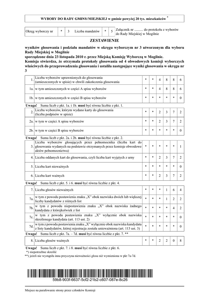 WYBORY DO RADY GMINY/MIEJSKIEJ w gminie powyżej 20 tys. mieszkańców * Okręg wyborczy nr * 3 Liczba mandatów * 5 Załącznik nr .......... do protokołu z wyborów do Rady Miejskiej w Mogilnie ZESTAWIENIE wyników głosowania i podziału mandatów w okręgu wyborczym nr 3 utworzonym dla wyboru Rady Miejskiej w Mogilnie sporządzone dnia 23 listopada 2010 r. przez Miejską Komisję Wyborczą w Mogilnie. Komisja stwierdza, że otrzymała protokoły głosowania od 4 obwodowych komisji wyborczych właściwych do przeprowadzenia głosowania i ustaliła następujące wyniki głosowania w okręgu nr 3 1. Liczba wyborców uprawnionych do głosowania (umieszczonych w spisie) w chwili zakończenia głosowania * * 4 8 8 6 1a. w tym umieszczonych w części A spisu wyborców * * 4 8 8 6 1b. w tym umieszczonych w części B spisu wyborców * * * * * 0 * * 2 3 7 2 2a. w tym w części A spisu wyborców * * 2 3 7 2 2b. w tym w części B spisu wyborców * * * * * 0 * * * * 1 Uwaga! Suma liczb z pkt. 1a. i 1b. musi być równa liczbie z pkt. 1. Liczba wyborców, którym wydano karty do głosowania 2. (liczba podpisów w spisie) Uwaga! Suma liczb z pkt. 2a. i 2b. musi być równa liczbie z pkt. 2. Liczba wyborców głosujących przez pełnomocnika (liczba kart do 3. głosowania wydanych na podstawie otrzymanych przez komisje obwodowe * aktów pełnomocnictwa) 4. Liczba oddanych kart do głosowania, czyli liczba kart wyjętych z urny * * 2 3 7 2 5. Liczba kart nieważnych * * * * * 0 6. Liczba kart ważnych * * 2 3 7 2 * * * 1 6 4 * * * 1 2 2 * * * * 4 2 * * * * * 0 * * * * * 0 * * 2 2 0 8 Uwaga! Suma liczb z pkt. 5. i 6. musi być równa liczbie z pkt. 4. 7. Liczba głosów nieważnych w tym z powodu postawienia znaku „X” obok nazwiska dwóch lub większej liczby kandydatów z różnych list w tym z powodu niepostawienia znaku „X” obok nazwiska żadnego 7b. kandydata z którejkolwiek z list w tym z powodu postawienia znaku „X” wyłącznie obok nazwiska 7c. skreślonego kandydata (art. 113 ust. 2) w tym z powodu postawienia znaku „X” wyłącznie obok nazwiska kandydata 7d. z listy kandydatów, której rejestracja została unieważniona (art. 113 ust. 3) 7a. Uwaga! Suma liczb z pkt. 7a. – 7d. musi być równa liczbie z pkt. 7. ** 8. Liczba głosów ważnych Uwaga! Suma liczb z pkt. 7. i 8. musi być równa liczbie z pkt. 6. *) niepotrzebne skreślić **) jeżeli nie wystąpiła inna przyczyna nieważności głosu niż wymieniona w pkt 7a-7d. 59b8-903f-6637-5cf2-21b2-c607-087e-8c26 Miejsce na parafowanie strony przez członków Komisji –2– 9. Na poszczególnych kandydatów z list kandydatów oddano następującą liczbę głosów ważnych: Lista nr 1 — KOMITET WYBORCZY SLD Liczba głosów ważnych oddanych na listę: * * * 3 7 3 Na poszczególnych kandydatów z tej listy oddano następujące liczby głosów ważnych: 1. KRYGIER Mirosław Andrzej * * * 1 4 5 2. SKORUPIŃSKA Violetta * * * * 4 3 3. MATECKA-STĘPIEŃ Agnieszka * * * * 2 5 4. SZYMCZAK Izabela * * * * 3 3 5. MALCZEWSKI Piotr * * * * 5 2 6. KWIT Sławomir Maciej * * * * 2 5 7. KRZYWY Piotr Władysław * * * * 1 9 8. ŻYWICA Feliks * * * * 3 1 RAZEM * * * 3 7 3 Uwaga! Suma głosów oddanych na wszystkich kandydatów z danej listy (rubryka „Razem”) musi równać się liczbie głosów ważnych oddanych na tę listę. Lista nr 2 — KW POLSKIE STRONNICTWO LUDOWE Liczba głosów ważnych oddanych na listę: * * * 7 4 4 Na poszczególnych kandydatów z tej listy oddano następujące liczby głosów ważnych: 1. MOLENDA Paweł * * * 3 1 1 2. ZIELIŃSKI Zenon Kazimierz * * * * 3 9 3. GRAJEK Urszula Maria * * * * 3 0 4. MAJKA Katarzyna * * * * 2 7 5. JAKUBOWSKI Michał * * * * 9 2 6. OLEJNIK Karol Tomasz * * * 1 4 0 7. SIESZCHUŁA Jan Antoni * * * * 4 2 8. NOWAKOWSKI Maciej * * * * 2 1 9. BUBAK Dariusz Paweł * * * * 4 2 RAZEM * * * 7 4 4 Uwaga! Suma głosów oddanych na wszystkich kandydatów z danej listy (rubryka „Razem”) musi równać się liczbie głosów ważnych oddanych na tę listę. 59b8-903f-6637-5cf2-21b2-c607-087e-8c26 Miejsce na parafowanie strony przez członków Komisji –3– Lista nr 4 — KW PLATFORMA OBYWATELSKA RP Liczba głosów ważnych oddanych na listę: * * * 8 3 1 Na poszczególnych kandydatów z tej listy oddano następujące liczby głosów ważnych: 1. LECH Barbara Krystyna * * * 1 0 9 2. RADTKE Stanisław * * * 1 3 9 3. GOLIS Iwona Renata * * * 1 1 7 4. GWIAZDA Roman Bogdan * * * 1 0 7 5. WITKOWSKI Benon Heliodor * * * * 4 2 6. MYSZKOWSKI Janusz Florian * * * 1 0 6 7. SZATKOWSKI Jan * * * * 8 6 8. TROMSKI Andrzej * * * * 2 5 9. CHOJNACKI Zbigniew Jarosław * * * * 3 4 * * * * 6 6 RAZEM * * * 8 3 1 10. MIKOŁAJCZYK Tadeusz Uwaga! Suma głosów oddanych na wszystkich kandydatów z danej listy (rubryka „Razem”) musi równać się liczbie głosów ważnych oddanych na tę listę. Lista nr 5 — KW PRAWO I SPRAWIEDLIWOŚĆ Liczba głosów ważnych oddanych na listę: * * * 2 6 0 Na poszczególnych kandydatów z tej listy oddano następujące liczby głosów ważnych: 1. KĄKOL Genowefa * * * 1 1 3 2. ZARYCHTA Łukasz * * * * 4 2 3. CEGIEL Krzysztof Jan * * * * 2 0 4. KUJAWSKA Małgorzata Maria * * * * 5 1 5. JASKULSKA Cecylia Maria * * * * 3 4 RAZEM * * * 2 6 0 Uwaga! Suma głosów oddanych na wszystkich kandydatów z danej listy (rubryka „Razem”) musi równać się liczbie głosów ważnych oddanych na tę listę. 10. Warunek uzyskania co najmniej 5% głosów ważnych i prawo do uczestniczenia w podziale mandatów w okręgu uzyskały listy następujących komitetów wyborczych: 1) lista nr 1 KOMITET WYBORCZY SLD 373 2) lista nr 2 KW POLSKIE STRONNICTWO LUDOWE 744 3) lista nr 4 KW PLATFORMA OBYWATELSKA RP 831 4) lista nr 5 KW PRAWO I SPRAWIEDLIWOŚĆ 260 Podział mandatów pomiędzy listy kandydatów 59b8-903f-6637-5cf2-21b2-c607-087e-8c26 Miejsce na parafowanie strony przez członków Komisji –4– 11. Wyliczenie ilorazów wyborczych dla poszczególnych list kandydatów uczestniczą