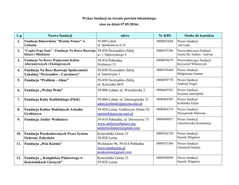 Wykaz fundacji na terenie powiatu lubańskiego. stan na dzień 07.09
