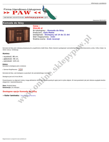 Informacje o produkcie Utworzono 08-03-2017 Komoda do Ibizy py pa w Nr katalogowy : /Komoda do Ibizy Producent : Gała Meble Dostępność : Dostępny od 14 do 21 dni Stan magazynowy : niski Średnia ocena : brak recenzji .p l Cena : 554,00 zł Komoda do Ibizy jest ciekawą propozycją do uzupełnienia mebli Ibiza. Może również występować samodzielnie dodają pomieszczeniu uroku i kilku miejsc na różne rzeczy i drobiazgi. Wymiary: ● ● wysokość: 86 cm, głębokość: 46 cm, szerokość: 123 cm sk le ● Kolory: Komoda ta dostępna jest w kolorze: Samoa King/Havana: e. ● Komoda do Ibizy jest dostępna w paczkach do samodzielnego montażu. in Dostępna jest od 14 do 28 dni. .o Stan: Produkt Nowy Gwarancja: 24 miesiące nl Prezentowane na zdjęciach kolory mogą delikatnie różnić się od rzeczywistych gdyż jest to tylko zdjęcie. W rzeczyswistości jak jest złożona wygląda bardzo elegancko i reprezentatywnie. w Dostępne opcje Komoda do Ibizy w w » Kolor laminatu: Samoa King/Havana. Wygenerowano w programie www.oscGold.com