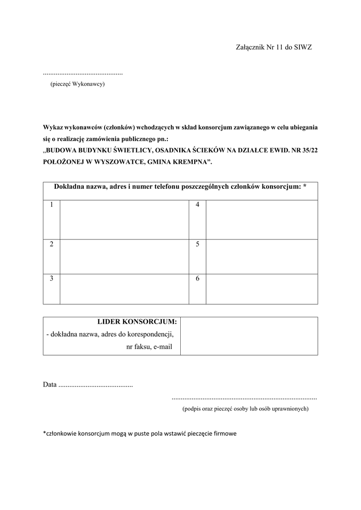 Załącznik Nr 11 do SIWZ ............................................ (pieczęć Wykonawcy) Wykaz wykonawców (członków) wchodzących w skład konsorcjum zawiązanego w celu ubiegania się o realizację zamówienia publicznego pn.: „BUDOWA BUDYNKU ŚWIETLICY, OSADNIKA ŚCIEKÓW NA DZIAŁCE EWID. NR 35/22 POŁOŻONEJ W WYSZOWATCE, GMINA KREMPNA”. Dokładna nazwa, adres i numer telefonu poszczególnych członków konsorcjum: * 1 4 2 5 3 6 LIDER KONSORCJUM: - dokładna nazwa, adres do korespondencji, nr faksu, e-mail Data ......................................... ................................................................................ (podpis oraz pieczęć osoby lub osób uprawnionych) *członkowie konsorcjum mogą w puste pola wstawić pieczęcie firmowe