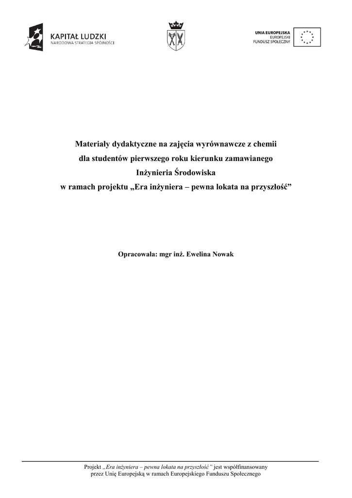 Materiały dydaktyczne na zajęcia wyrównawcze z chemii dla studentów pierwszego roku kierunku zamawianego Inżynieria Środowiska w ramach projektu „Era inżyniera – pewna lokata na przyszłość” Opracowała: mgr inż. Ewelina Nowak Projekt „Era inżyniera – pewna lokata na przyszłość” jest współfinansowany przez Unię Europejską w ramach Europejskiego Funduszu Społecznego Reakcje dysocjacji elektrolitycznej Dysocjacja elektrolityczna (jonowa) – rozpad na jony dodatnie – kationy i jony ujemne – aniony, pod wpływem wody. Elektrolity – substancje, które pod wpływem wody lub innego rozpuszczalnika polarnego ulegają dysocjacji, przewodzą prąd elektryczny w wodnych roztworach. Elektrolitami są związki o budowie jonowej lub wiązaniu kowalencyjnym spolaryzowanym. Dysocjacja elektrolityczna kwasów - HmRm Kwasy dysocjują na kationy wodorowe i aniony reszty kwasowej, wg schematu: H2O HmRm mmH+ + R R – reszta kwasowa m – wartościowość reszty kwasowej równa ilości atomów wodoru w cząsteczce kwasu Dysocjacja elektrolityczna zasad - Mn(OH)n Zasady dysocjują na kationy metalu i aniony wodorotlenowe, wg schematu: H2O Mn(OH)n Mn+ + n (OH) M – symbol metalu n – wartościowość metalu równa ilości grup hydroksylowych w cząsteczce Dysocjacja elektrolityczna soli - M mn Rnm Sole dysocjują na kationy metali i aniony reszty kwasowej zgodnie ze schematem: Mmn Rnm H2 O m Mn+ + n Rm- Przykładowe reakcje dysocjacji jonowej podano poniżej: H2O Mg(OH)2 H2O H2SO3 Mg2+ + 2OH2 H+ + SO32- Stała dysocjacji – stosunek iloczynu stężeń jonów podniesionych do odpowiednich potęg, do stężenia cząsteczek niezdysocjowanych. Stałą dysocjacji wyznacza się dla elektrolitów średniej mocy i słabych. Stałą reakcji dysocjacji jonowej przedstawionej zgodnie z poniższym ogólnym zapisem: AB H2O A+ + B [ A ] [B ] [ AB] + [A ], [B ] – stężenie jonów w stanie równowagi [AB] – stężenie cząsteczek niezdysocjowanych w stanie równowagi można wyrazić jako Kd Stała dysocjacji jest miarą mocy kwasu i zasady; im większa jest wartość tej stałej tym bardziej elektrolit jest zdysocjowany. Stała dysocjacji, tak jak inne stałe równowagi, nie zależy od początkowego stężenia elektrolitu, a zależy od temperatury. Projekt „Era inżyniera – pewna lokata na przyszłość” jest współfinansowany przez Unię Europejską w ramach Europejskiego Funduszu Społecznego Stopień dysocjacji (α) - stosunek ilości moli jonów, które powstały w wyniku dysocjacji do całkowitej liczby moli cząsteczek wprowadzonych do roztworu. Wyrażamy jako: stosunek liczby cząsteczek dysocjowanych (Nzdysocj.) do liczby cząsteczek N zdysocj . N zdysocj . 100% ) wprowadzonych do roztworu (N0), (lub N0 N0 stosunek liczby moli cząsteczek zdysocjowanych (nzdysocj.) do liczby moli cząsteczek n zdysocj . n zdysocj. 100% ) wprowadzonych do roztworu (n0) (lub n0 n0 stosunek stężenia cząsteczek zdysocjowanych (Czdysocj.) do stężenia cząsteczek C zdysocj. wprowadzonych do roztworu (stężenie molowe roztworu) (C0) C0 C zdysocj. 100% ) (lub C0 Stopień dysocjacji α przyjmuje wartości z przedziału 0,1 jeśli ma wartość niemianowaną lub zawiera się w granicach 0<α≤100 gdy jest podawany w procentach. Ze względu na stopień dysocjacji elektrolity można podzielić na: mocne, które w roztworach wodnych są silnie zdysocjowane i zawierają niewielką ilość cząsteczek niezdysocjowanych (α>30%), należą do nich: - wszystkie sole rozpuszczalne w wodzie, - wodorotlenki litowców i berylowców z wyjątkiem Be(OH)2 i Mg(OH)2, - niektóre kwasy np. H2SO4, HCl, HClO4, HNO3, HBr, słabe, które w roztworach wodnych ulegają niewielkiej dysocjacji na jony (α<5%), należą do nich pozostałe wodorotlenki i większość kwasów. Słabe wielowodorotlenowe zasady i wieloprotonowe kwasy dysocjują stopniowo. H2O Zn(OH)2 ZnOH+ H2O H2O H3PO4 H2PO4HPO42- H2 O H2 O ZnOH+ + OHZn2+ + OHH+ + H2PO4H+ + HPO42H+ + PO43- Prawo rozcieńczeń Ostwalda: Określa zależność pomiędzy stałą dysocjacji słabego elektrolitu Kd, stopniem dysocjacji α a stężeniem molowym elektrolitu. C 2 Kd 1 Projekt „Era inżyniera – pewna lokata na przyszłość” jest współfinansowany przez Unię Europejską w ramach Europejskiego Funduszu Społecznego K C Stopień dysocjacji jest odwrotnie proporcjonalny do pierwiastka kwadratowego ze stężenia elektrolitu. Kd 2 C lub przekształcając: Wyprowadzenie wzoru: W roztworze słabego elektrolitu AB o stężeniu C0 = C oraz stopniu dysocjacji α: [A+] = [B-] = Czdysocj. C zdysocj. + C0 [AB] = C0 – Czdysocj. = C0 – C0 ∙ α - więc: [A ] = [B ] = C0 ∙ α 2 2 C0 C0 C0 C0 2 Kd C0 C0 C0 (1 ) 1 Uproszczony wzór prawa rozcieńczeń Ostwalda można zastosować gdy wartość (1-α) ≈ 1 C 5% ( dla: 400 lub 0,05 ) Kd wtedy wzór przyjmuje postać: K d C 2 Zadania: 1. Oblicz stopień dysocjacji elektrolitu, wiedząc, że w roztworze znajduje się 0,3 mola cząsteczek zdysocjowanych i 0,9 mola cząsteczek, które nie uległy dysocjacji jonowej. 2. Oblicz stężenie jonów wodorowych w 0,4 molowym roztworze kwasu fluorowodorowego, dla którego stała dysocjacji wynosi 6,3 ∙10-4. 3. Oblicz stałą dysocjacji kwasu jednoprotonowego, jeżeli w 1,5 molowym roztworze tego kwasu stopień dysocjacji wynosi 3%. 4. Oblicz stężenie roztworu kwasu metanowego (HCOOH), którego stopień dysocjacji wynosi 3% a stała dysocjacji tego kwasu Kd = 1,8 ∙ 10-4. Zapisz wyrażenie na stałą dysocjacji dla tego kwasu. 5. Oblicz stopień dysocjacji kwasu butanowego (masłowego) o wzorze CH3-CH2-CH2-COOH w roztworze o stężeniu 0,06 mol/dm3 i stałej dysocjacji równej Kd = 1,5 ∙ 10-5. Zapisz reakcję dysocjacji jonowej tego kwasu i wyrażenie na stałą dysocjacji. 6. Oblicz jaki jest stopień dysocjacji α elektrolitu, jeśli na 30 cząsteczek wprowadzonych do roztworu 6 cząsteczek tego elektrolitu uległo reakcji dysocjacji. Projekt „Era inżyniera – pe