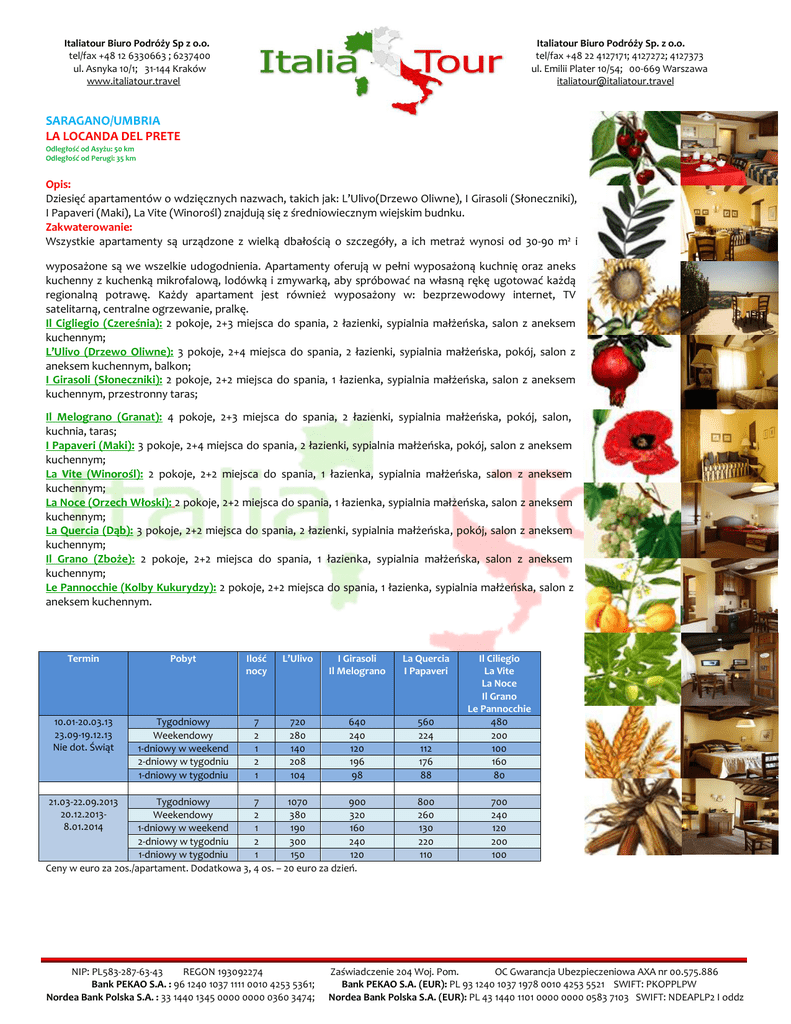 Italiatour Biuro Podróży Sp z o.o. tel/fax +48 12 6330663 ; 6237400 ul. Asnyka 10/1; 31-144 Kraków www.italiatour.travel Italiatour Biuro Podróży Sp. z o.o. tel/fax +48 22 4127171; 4127272; 4127373 ul. Emilii Plater 10/54; 00-669 Warszawa [email protected] SARAGANO/UMBRIA LA LOCANDA DEL PRETE Odległość od Asyżu: 50 km Odległość od Perugi: 35 km Opis: Dziesięć apartamentów o wdzięcznych nazwach, takich jak: L’Ulivo(Drzewo Oliwne), I Girasoli (Słoneczniki), I Papaveri (Maki), La Vite (Winorośl) znajdują się z średniowiecznym wiejskim budnku. Zakwaterowanie: Wszystkie apartamenty są urządzone z wielką dbałością o szczegóły, a ich metraż wynosi od 30-90 m² i wyposażone są we wszelkie udogodnienia. Apartamenty oferują w pełni wyposażoną kuchnię oraz aneks kuchenny z kuchenką mikrofalową, lodówką i zmywarką, aby spróbować na własną rękę ugotować każdą regionalną potrawę. Każdy apartament jest również wyposażony w: bezprzewodowy internet, TV satelitarną, centralne ogrzewanie, pralkę. Il Cigliegio (Czereśnia): 2 pokoje, 2+3 miejsca do spania, 2 łazienki, sypialnia małżeńska, salon z aneksem kuchennym; L’Ulivo (Drzewo Oliwne): 3 pokoje, 2+4 miejsca do spania, 2 łazienki, sypialnia małżeńska, pokój, salon z aneksem kuchennym, balkon; I Girasoli (Słoneczniki): 2 pokoje, 2+2 miejsca do spania, 1 łazienka, sypialnia małżeńska, salon z aneksem kuchennym, przestronny taras; Il Melograno (Granat): 4 pokoje, 2+3 miejsca do spania, 2 łazienki, sypialnia małżeńska, pokój, salon, kuchnia, taras; I Papaveri (Maki): 3 pokoje, 2+4 miejsca do spania, 2 łazienki, sypialnia małżeńska, pokój, salon z aneksem kuchennym; La Vite (Winorośl): 2 pokoje, 2+2 miejsca do spania, 1 łazienka, sypialnia małżeńska, salon z aneksem kuchennym; La Noce (Orzech Włoski): 2 pokoje, 2+2 miejsca do spania, 1 łazienka, sypialnia małżeńska, salon z aneksem kuchennym; La Quercia (Dąb): 3 pokoje, 2+2 miejsca do spania, 2 łazienki, sypialnia małżeńska, pokój, salon z aneksem kuchennym; Il Grano (Zboże): 2 pokoje, 2+2 miejsca do spania, 1 łazienka, sypialnia małżeńska, salon z aneksem kuchennym; Le Pannocchie (Kolby Kukurydzy): 2 pokoje, 2+2 miejsca do spania, 1 łazienka, sypialnia małżeńska, salon z aneksem kuchennym. Termin Pobyt Ilość nocy L’Ulivo I Girasoli Il Melograno La Quercia I Papaveri 10.01-20.03.13 23.09-19.12.13 Nie dot. Świąt Tygodniowy Weekendowy 1-dniowy w weekend 2-dniowy w tygodniu 1-dniowy w tygodniu 7 2 1 2 1 720 280 140 208 104 640 240 120 196 98 560 224 112 176 88 Il Ciliegio La Vite La Noce Il Grano Le Pannocchie 480 200 100 160 80 Tygodniowy 7 1070 900 Weekendowy 2 380 320 1-dniowy w weekend 1 190 160 2-dniowy w tygodniu 2 300 240 1-dniowy w tygodniu 1 150 120 Ceny w euro za 2os./apartament. Dodatkowa 3, 4 os. – 20 euro za dzień. 800 260 130 220 110 700 240 120 200 100 21.03-22.09.2013 20.12.20138.01.2014 NIP: PL583-287-63-43 REGON 193092274 Bank PEKAO S.A. : 96 1240 1037 1111 0010 4253 5361; Nordea Bank Polska S.A. : 33 1440 1345 0000 0000 0360 3474; Zaświadczenie 204 Woj. Pom. OC Gwarancja Ubezpieczeniowa AXA nr 00.575.886 Bank PEKAO S.A. (EUR): PL 93 1240 1037 1978 0010 4253 5521 SWIFT: PKOPPLPW Nordea Bank Polska S.A. (EUR): PL 43 1440 1101 0000 0000 0583 7103 SWIFT: NDEAPLP2 I oddz