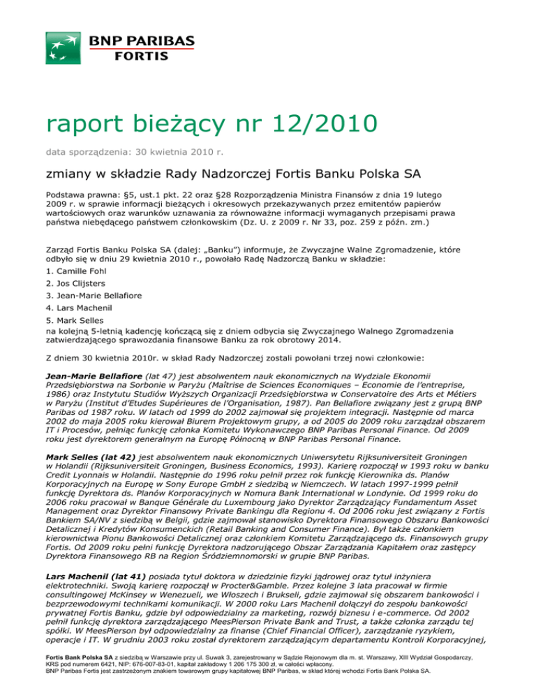 raport bieżący nr 12/2010 data sporządzenia: 30 kwietnia 2010 r. zmiany w składzie Rady Nadzorczej Fortis Banku Polska SA Podstawa prawna: §5, ust.1 pkt. 22 oraz §28 Rozporządzenia Ministra Finansów z dnia 19 lutego 2009 r. w sprawie informacji bieżących i okresowych przekazywanych przez emitentów papierów wartościowych oraz warunków uznawania za równoważne informacji wymaganych przepisami prawa państwa niebędącego państwem członkowskim (Dz. U. z 2009 r. Nr 33, poz. 259 z późn. zm.) Zarząd Fortis Banku Polska SA (dalej: „Banku”) informuje, że Zwyczajne Walne Zgromadzenie, które odbyło się w dniu 29 kwietnia 2010 r., powołało Radę Nadzorczą Banku w składzie: 1. Camille Fohl 2. Jos Clijsters 3. Jean-Marie Bellafiore 4. Lars Machenil 5. Mark Selles na kolejną 5-letnią kadencję kończącą się z dniem odbycia się Zwyczajnego Walnego Zgromadzenia zatwierdzającego sprawozdania finansowe Banku za rok obrotowy 2014. Z dniem 30 kwietnia 2010r. w skład Rady Nadzorczej zostali powołani trzej nowi członkowie: Jean-Marie Bellafiore (lat 47) jest absolwentem nauk ekonomicznych na Wydziale Ekonomii Przedsiębiorstwa na Sorbonie w Paryżu (Maîtrise de Sciences Economiques – Economie de l’entreprise, 1986) oraz Instytutu Studiów Wyższych Organizacji Przedsiębiorstwa w Conservatoire des Arts et Métiers w Paryżu (Institut d’Etudes Supérieures de l’Organisation, 1987). Pan Bellafiore związany jest z grupą BNP Paribas od 1987 roku. W latach od 1999 do 2002 zajmował się projektem integracji. Następnie od marca 2002 do maja 2005 roku kierował Biurem Projektowym grupy, a od 2005 do 2009 roku zarządzał obszarem IT i Procesów, pełniąc funkcję członka Komitetu Wykonawczego BNP Paribas Personal Finance. Od 2009 roku jest dyrektorem generalnym na Europę Północną w BNP Paribas Personal Finance. Mark Selles (lat 42) jest absolwentem nauk ekonomicznych Uniwersytetu Rijksuniversiteit Groningen w Holandii (Rijksuniversiteit Groningen, Business Economics, 1993). Karierę rozpoczął w 1993 roku w banku Credit Lyonnais w Holandii. Następnie do 1996 roku pełnił przez rok funkcję Kierownika ds. Planów Korporacyjnych na Europę w Sony Europe GmbH z siedzibą w Niemczech. W latach 1997-1999 pełnił funkcję Dyrektora ds. Planów Korporacyjnych w Nomura Bank International w Londynie. Od 1999 roku do 2006 roku pracował w Banque Générale du Luxembourg jako Dyrektor Zarządzający Fundamentum Asset Management oraz Dyrektor Finansowy Private Bankingu dla Regionu 4. Od 2006 roku jest związany z Fortis Bankiem SA/NV z siedzibą w Belgii, gdzie zajmował stanowisko Dyrektora Finansowego Obszaru Bankowości Detalicznej i Kredytów Konsumenckich (Retail Banking and Consumer Finance). Był także członkiem kierownictwa Pionu Bankowości Detalicznej oraz członkiem Komitetu Zarządzającego ds. Finansowych grupy Fortis. Od 2009 roku pełni funkcję Dyrektora nadzorującego Obszar Zarządzania Kapitałem oraz zastępcy Dyrektora Finansowego RB na Region Śródziemnomorski w grupie BNP Paribas. Lars Machenil (lat 41) posiada tytuł doktora w dziedzinie fizyki jądrowej oraz tytuł inżyniera elektrotechniki. Swoją karierę rozpoczął w Procter&Gamble. Przez kolejne 3 lata pracował w firmie consultingowej McKinsey w Wenezueli, we Włoszech i Brukseli, gdzie zajmował się obszarem bankowości i bezprzewodowymi technikami komunikacji. W 2000 roku Lars Machenil dołączył do zespołu bankowości prywatnej Fortis Banku, gdzie był odpowiedzialny za marketing, rozwój biznesu i e-commerce. Od 2002 pełnił funkcję dyrektora zarządzającego MeesPierson Private Bank and Trust, a także członka zarządu tej spółki. W MeesPierson był odpowiedzialny za finanse (Chief Financial Officer), zarządzanie ryzykiem, operacje i IT. W grudniu 2003 roku został dyrektorem zarządzającym departamentu Kontroli Korporacyjnej, Fortis Bank Polska SA z siedzibą w Warszawie przy ul. Suwak 3, zarejestrowany w Sądzie Rejonowym dla m. st. Warszawy, XIII Wydział Gospodarczy, KRS pod numerem 6421, NIP: 676-007-83-01, kapitał zakładowy 1 206 175 300 zł, w całości wpłacony. BNP Paribas Fortis jest zastrzeżonym znakiem towarowym grupy kapitałowej BNP Paribas, w skład której wchodzi Fortis Bank Polska SA. Fortis Bank Polska SA | raport bieżący nr 12/2010 a w lutym 2005 roku zajął się również obszarem zarządzania wynikami finansowymi (Performance Management). Od grudnia 2005 roku kierował zespołem Performance, Consolidation and Accounting będącym częścią Pionu Finansowego. Od stycznia 2008 roku był Dyrektorem Finansowym Fortis Banku, a obecnie BNP Paribas Fortis. Jednocześnie z dniem odbycia się Zwyczajnego Walnego Zgromadzenie upłynęła kadencja Pana Antoniego Potockiego, Wiceprzewodniczącego Rady Nadzorczej Banku oraz Pana Zbigniewa Dreslera, Członka Rady Nadzorczej Banku, od wielu lat zaangażowanych w prace Rady Nadzorczej Banku. Zgodnie z zaleceniem Walnego Zgromadzenia, uzupełnienie składu Rady Nadzorczej Fortis Bank Polska SA o niezależnych członków rady nadzorczej planowane jest do końca czerwca 2010 roku na nadzwyczajnym walnym zgromadzeniu. W dniu 30 kwietnia 2010 roku odbyło się posiedzenie nowej Rady Nadzorczej, na którym ukonstytuowało się Prezydium Rady - Pan Camille Fohl został ponownie wybrany na Przewodniczącego Rady Nadzorczej a Pan Jos Clijsters na Wiceprzewodniczącego Rady Nadzorczej. Podpisy osób reprezentujących spółkę: data imię i nazwisko stanowisko/funkcja 30.04.2010 r. Jan Bujak pierwszy wiceprezes zarządu podpis
