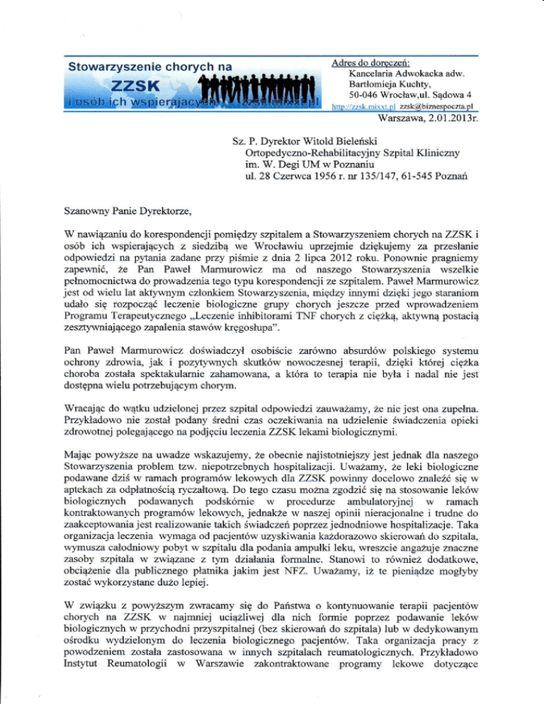 Stowarzyszeniechorych na E!' |EY!t Adres do doreczeń: KancelariaAdwokackaadw. BartłomiejaKuchty, 50-046Wrocław"ul. Sadowa4 [email protected] httpr//zzsk.mi\xt.pl Warszawa.f .0I.20I3r. Sz. P. D1'rektorWitold Bieleński Ortopedyczno-RehabilitacyjnySzpital Kliniczny im. W. Degi UM w Poznaniu ul. 28 Czerwca 1956r. rrr 135lI47. 6I.545Poznań SzanownyPanie Dyrektorze, W nawiqzaniudo korespondencjipomiędzy szpitalema Stowarzyszeniemchorych na ZZSK i osób ich wspierających z siedzibą we Wrocławiu uprzejmie dziękujemy za przestalie odpowiedzina pytania zadale przy piśmiez dnia 2 lipca 2012 roku. Ponowniepragniemy zapewnió, ize Pat Paweł Marmurowicz ma od naszego Stowarzyszenia wszelkie pełnomocnictwa do prowadzeniategotypu korespondencji ze szpitalem.PawełMarmurowicz jest od wielu lat aktyrvnymczłonkiemStowarzyszenia,między irnymi dzięki jego staraniom udało się rozpocz4c,leczenie biologiczne grupy chorych jeszcze przed wprowadzeniem Programu Terapeutycmego,,Leczenie inhibitorami TNF chorych z cięźką,akĘwną postacią go zapalenia stawów kręgosłupa''. zesztywntające Pan Paweł Marmurowicz doświadczyłosobiściezarówno absurdów polskiego systemu ochrony zdrowia, jak i poątywnych skutków nowoczesnej terapii, dzięki któĘ ciężka choroba została spektakulamie zahamowana' a która to terapia nie była i nadal nie jest dostępnawielu potrzebującym chorym. Wracającdo wątku udzielonej puez szpita|odpowiedzi zauu]dŻamy, żenie jest ona zupełna. Przykładowo ńe zostałpodany średniczas oczekiwania na udzielenie świadczeniaopieki zdrowotnejpolegającego na podjęciuleczertlaZZSK |ekatli biologicznymi' jest j ednakdla naszego Mając powyższena uwadzewskazujemy,żeobecnienajistotniejszy Stowarzyszeniaproblem tzw. niepotrzebnychhospitalizacji. Uwa:żamy,że leki biologiczne podawanedziśw ramach plogramów lekowych dla ZZSK powinny docelowo zna|eźćsię w aptekachza odpłatnością ryczahową.Do tego czasu możnazgodzió się na stosowanieleków biologicznych podawanych podskómie w plocedurze ambulatoryjnej w ramach konhaklowanych programów lekowych, jednakżew naszej opinii nieracjonalnei trudne do jest realizowanietakich świadczeń zaakceptowania poprzezjednodniowehospitalizacje.Taka olganizacja|eczęria wymaga od pacjentów uzyskiwania ka:idorazowoskierowańdo szpitala, wymusza całodniowypobl w szpitalu dla podania ampułkileku, wreszcie anga]Źuje znaczne zasoby szpitala w z.vu.tryane z tW działarliaformalne. Stanowi to również dodatkowe, obciążeniedla publicmego płatnikajakim jest NFZ. Uwazamy, iż te pien;ądzemogĘby zostaćwykorzystanedużolepiej. W zw.iązku z poryiszym zwlacamy się do Państwa o kont1nuowanie terapii pacjentów chorych na ZZSK w najmniej uciqzliwej dla nich formie poprzez podawanie leków biologicmych w przychodni przyszpitalnej(bez skierowań do szpitala) lub w dedykowanyn ośrodkuwydzielonym do leczęnia biologicmego pacjentów. Taka organizacja ptacy z powodzeniem została zastosowana w irurych szpitalach reumatologicmych. Przykładowo Insty.tut Reumatologii w Warszawie zakontraktowane programy lekowe dotyczące Ieumatologii rea}i^Ljew dedykowanymośrodkuTerapii Biologicznej - co skraca koniecmy czas do podanialeku do kilkudziesięciu minut. Liczymy, iż nasze uwagi zostanąodebranejako wyraz troski o jakośći efektywnośóprocedur medycznychw Pana szpitalu otaz prryczytią się do pozytywnie odebranychprzez pacjentów zmian w tej cenionejprzez nasjednostcesłu]żby zdrowia. Z wwazarni szacunku. '-,(tUa^r",/rJ Krzysfof Kucharski Prezes StowarzyszeniaChorych na ZZSK i osób Ich Wspierających. Do wiadomości: 1) Rzecznik Praw Pacjenta 01-829WarszawąN, Zjednoczenia25 2) adw.Bańłomiej Kuchta - PehromocnikStowarzyszeńą 50-04óWrocław, ul. Sądowa4 3) PawełMarmurowicz 62-272Łagiewnlkj Kościelrre,4718Łagiewniki Kościelne 4) Zespółkoordynacyjnyds leczenia biologicznego w chorobachreumaĘcznych ptzy InsĘrtucieReumatologii