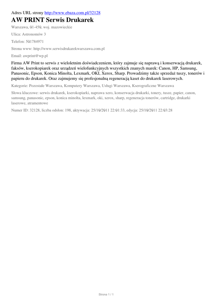 AW PRINT Serwis Drukarek, Warszawa, Astronomow 3
