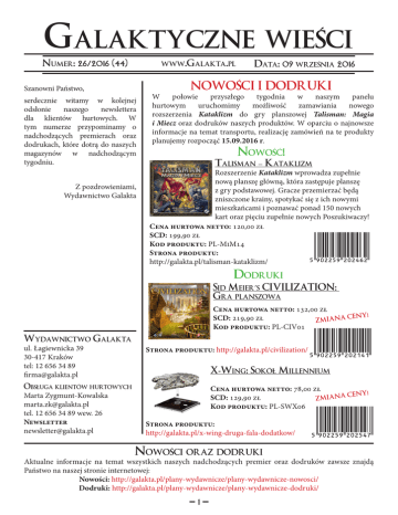 Galaktyczne Numer: 26/2016 (44) www.Galakta.pl wieści Data: 09 września 2016 Nowości i dodruki Szanowni Państwo, serdecznie witamy w kolejnej odsłonie naszego newslettera dla klientów hurtowych. W tym numerze przypominamy o nadchodzących premierach oraz dodrukach, które dotrą do naszych magazynów w nadchodzącym tygodniu. Z pozdrowieniami, Wydawnictwo Galakta W połowie przyszłego tygodnia w naszym panelu hurtowym uruchomimy możliwość zamawiania nowego rozszerzenia Kataklizm do gry planszowej Talisman: Magia i Miecz oraz dodruków naszych produktów. W oparciu o najnowsze informacje na temat transportu, realizację zamówień na te produkty planujemy rozpocząć 15.09.2016 r. Nowość! Talisman – Kataklizm Rozszerzenie Kataklizm wprowadza zupełnie nową planszę główną, która zastępuje planszę z gry podstawowej. Gracze przemierzać będą zniszczone krainy, spotykać się z ich nowymi mieszkańcami i poznawać ponad 150 nowych kart oraz pięciu zupełnie nowych Poszukiwaczy! Cena hurtowa netto: 120,00 zł SCD: 199,90 zł Kod produktu: PL-MiM14 Strona produktu: http://galakta.pl/talisman-kataklizm/ Dodruki Sid Meier’s CIVILIZATION: Gra planszowa Wydawnictwo Galakta ul. Łagiewnicka 39 30-417 Kraków tel: 12 656 34 89 [email protected] Cena hurtowa netto: 132,00 zł ! A CENY SCD: 219,90 zł ZMIAN Kod produktu: PL-CIV01 Strona produktu: http://galakta.pl/civilization/ X-Wing: Sokół Millennium Obsługa klientów hurtowych Marta Zygmunt-Kowalska [email protected] tel. 12 656 34 89 wew. 26 Newsletter [email protected] Cena hurtowa netto: 78,00 zł ! A CENY SCD: 129,90 zł ZMIAN Kod produktu: PL-SWX06 Strona produktu: http://galakta.pl/x-wing-druga-fala-dodatkow/ Nowości oraz dodruki Aktualne informacje na temat wszystkich naszych nadchodzących premier oraz dodruków zawsze znajdą Państwo na naszej stronie internetowej: Nowości: http://galakta.pl/plany-wydawnicze/plany-wydawnicze-nowosci/ Dodruki: http://galakta.pl/plany-wydawnicze/plany-wydawnicze-dodruki/ 1