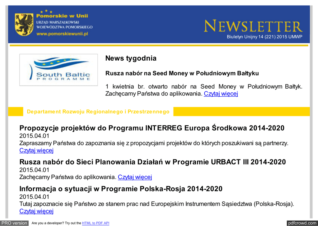 Biuletyn Unijny 14 (221) 2015 UMWP News tygodnia Rusza nabór na Seed Money w Południowym Bałtyku 1 kwietnia br. otwarto nabór na Seed Money w Południowym Bałtyk. Zachęcamy Państwa do aplikowania. Czytaj więcej Departament Rozwoju Regionalnego i Przestrzennego Propozycje projektów do Programu INTERREG Europa Środkowa 2014-2020 2015.04.01 Zapraszamy Państwa do zapoznania się z propozycjami projektów do których poszukiwani są partnerzy. Czytaj więcej Rusza nabór do Sieci Planowania Działań w Programie URBACT III 2014-2020 2015.04.01 Zachęcamy Państwa do aplikowania. Czytaj więcej Informacja o sytuacji w Programie Polska-Rosja 2014-2020 2015.04.01 Tutaj zapoznacie się Państwo ze stanem prac nad Europejskim Instrumentem Sąsiedztwa (Polska-Rosja). Czytaj więcej PRO version Are you a developer? Try out the HTML to PDF API pdfcrowd.com Departament Programów Regionalnych Dni Otwarte Funduszy Europejskich 2015 2015.04.01 Zapraszamy beneficjentów środków unijnych do współpracy przy organizacji Dni Otwartych Funduszy Europejskich poprzez przygotowanie w dniach od 7 do 10 maja różnorodnych wydarzeń na terenie projektów, które będą zachęcały mieszkańców Pomorza oraz turystów do ich odwiedzenia i poznania. Atrakcje do Dni Otwarte można zgłosić poprzez wysłanie formularza do dnia 3 kwietnia. Czytaj więcej Główny Punkt Informacyjny Funduszy Europejskich Nabór wniosków w ramach działania 2.1 Programu Polska Cyfrowa 2015.04.01 Od 27 lutego 2015 r. do 4 maja 2015 r. trwa nabór wniosków w ramach działania 2.1 Wysoka dostępność i jakość e-usług publicznych, w ramach Programu Polska Cyfrowa. Konkurs dotyczy finansowania projektów o zasięgu ogólnokrajowym, które przyczynią się do zwiększenia dostępności i jakość e-usług publicznych poprzez tworzenie lub rozwój e-usług publicznych (A2B, A2C) oraz tworzenie lub rozwój usług wewnątrzadministracyjnych (A2A) niezbędnych dla funkcjonowania e-usług publicznych. Czytaj więcej Harmonogram naboru wniosków w Programie Inteligentny Rozwój 2015.04.01 Ogłoszono harmonogram konkursów w Programie Inteligentny Rozwój. Harmonogram przewiduje przeprowadzenie w 2015 roku czternastu konkursów w ramach dwunastu instrumentów programu. Orientacyjna kwota przewidziana na nabory w 2015 r. to blisko 5,06 mld zł. Czytaj więcej Mobilne Punkty Informacyjne na Pomorzu - KWIECIEŃ 2015 2015.04.01 Serdecznie zapraszamy do skorzystania z działań Mobilnych Punktów Informacyjnych na Pomorzu. Czytaj więcej PRO version Are you a developer? Try out the HTML to PDF API pdfcrowd.com Spotkanie Informacyjne w Malborku: „Możliwości wsparcia dla osób zamierzających rozpocząć działalność gospodarczą” 2015.04.01 Lokalny Punkt Informacyjny Funduszy Europejskich zaprasza na spotkanie informacyjne poświęcone zagadnieniom związanym z Funduszami Europejskimi w nowej perspektywie finansowej na lata 2014-2020. Czytaj więcej Przyjęto część Szczegółowego Opisu Osi Priorytetowych Programu Inteligentny Rozwój 2015.04.01 27 marca 2015 r. przyjęto część Szczegółowego Opisu Osi Priorytetowych Programu Operacyjnego Inteligentny Rozwój 2014-2020. Dokument dotyczy działań 1.1 Projekty B+R przedsiębiorstw i 1.2 Sektorowe programy B+R oraz V osi Pomoc techniczna programu. Czytaj więcej Aktualizacja harmonogramu naborów wniosków na 2015 rok dla Programu Polska Cyfrowa 2015.04.01 Wiceminister infrastruktury i rozwoju Iwona Wendel zaakceptowała harmonogram naborów wniosków o dofinansowanie w trybie konkursowym na 2015 rok dla Programu Polska Cyfrowa. Czytaj więcej Departament Europejskiego Funduszu Społecznego Bez matematyki kariery nie zrobisz 2015.04.01 Zapraszamy do zapoznania się z relacją z IV Seminarium "Bez matematyki kariery nie zrobisz". Czytaj więcej Uwaga! Jeżeli po otrzymaniu newslettera mają Państwo problem z otwarciem zdjęć prosimy wybrać kursorem myszy zamknięte zdjęcie, nacisnąć prawy klawisz i w zależności od potrzeb zaznaczyć jedną ze wskazanych opcji. PRO version Are you a developer? Try out the HTML to PDF API pdfcrowd.com Jeśli nie chcesz otrzymyw ać kolejnych publikacji new slettera z Urzędu Marszałkow skiego Wojew ództw a Pomorskiego - kliknij tutaj. Newsletter współfinansowany ze środków Unii Europejskiej - ze środków Europejskiego Funduszu Społecznego w ramach POKL, ze środków Europejskiego Funduszu Rozwoju Regionalnego w ramac h RPO, ze środków Europejskiego Funduszu Rozwoju Regionalnego w ramach Programu Operacyjnego Pomoc Techniczna 2007-2013, ze środków Europejskiego Funduszu Rolnego na rzecz Rozwoju Obszarów Wiejskich w ramach PROW oraz ze środków budżetu Samorządu Województwa Pomorskiego. PRO version Are you a developer? Try out the HTML to PDF API pdfcrowd.com