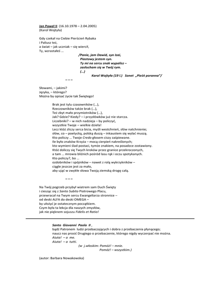 Jan Paweł II (16.10.1978 – 2.04.2005) (Karol Wojtyła) Gdy czekał na Ciebie Pierścień Rybaka i Paliusz też, a świat – jak uczniak – się wiercił, Ty, wzrastałeś … /Panie, jam Dawid, syn Izai, Piastowy jestem syn. Ty mi na sercu znak wypalisz – zasłucham się w Twój rym. (…) Karol Wojtyła (19 l.) Sonet „Pieśń poranna”/ ––– Słowami, – jakimi? Języka, – którego? Można by opisać życie tak Świętego! Brak jest tylu czasowników (…), Rzeczowników także brak (…), Też zbyt mało przymiotników (…), Jak? Gdzie? Kiedy? – i przysłówków już nie starcza. Liczebniki? – w nich nadzieja – by policzyć, wszystkie Twoje – wielkie dzieła! Lecz któż zliczy serca bicia, myśli westchnień, słów natchnienie; słów, co – poetycką, polską duszą – inkaustem się wylać muszą. Kto policzy … Twoje Credo głosem ciszy zaśpiewane. Ile było znaków Krzyża – mocą cierpień nakreślonych; kto wymieni ślad postaci, tymże znakiem, na posadzce zostawiony. Któż doliczy się Twych kroków przez granice przekroczonych, a tam … mrowia bliźnich pośród lasu rąk i oczu spotykanych. Kto policzy?, bo … ozdobników i spójników – nawet z rolą wykrzykników – ciągle jeszcze jest za mało, aby ująć w zwykłe słowa Twoją ziemską drogę całą. ––– Na Twój pogrzeb przybył wiatrem sam Duch Święty i ciesząc się z Santo Subito Piotrowego Placu, przewracał na Twym sercu Ewangeliarza stronnice – od deski ALFA do deski OMEGA – by ułożyć je ostatecznym początkiem. Czym była ta lekcja dla naszych zmysłów, jak nie pięknem sojuszu Fidelis et Ratio! Santo Giovanni Paolo II , bądź Patronem ludzi przebaczających i dobra z przebaczenia płynącego; naucz nas prosić Drugiego o przebaczenie, którego nigdy wyczerpać nie można. Aiuta! – a me. Aiuta! – a tutti. (w j.włoskim: Pomóż! – mnie. Pomóż! – wszystkim.) (autor: Barbara Nowakowska)