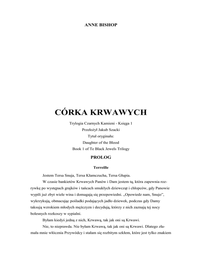 ANNE BISHOP CÓRKA KRWAWYCH Trylogia Czarnych Kamieni - Księga 1 Przełożył Jakub Szacki Tytuł oryginału: Daughter of the Blood Book 1 of Te Black Jewels Trilogy PROLOG Terreille Jestem Tersa Snuja, Tersa Kłamczucha, Tersa Głupia. W czasie bankietów Krwawych Panów i Dam jestem tą, która zapewnia rozrywkę po występach grajków i tańcach smukłych dziewcząt i chłopców, gdy Panowie wypili już zbyt wiele wina i domagają się przepowiedni. „Opowiedz nam, Snujo”, wykrzykują, obmacując pośladki podających jadło dziewek, podczas gdy Damy taksują wzrokiem młodych mężczyzn i decydują, którzy z nich zaznają tej nocy bolesnych rozkoszy w sypialni. Byłam kiedyś jedną z nich, Krwawą, tak jak oni są Krwawi. Nie, to nieprawda. Nie byłam Krwawą, tak jak oni są Krwawi. Dlatego złamała mnie włócznia Przywódcy i stałam się rozbitym szkłem, które jest tylko znakiem tego, czym mogłoby być. Niełatwo jest złamać Krwawego mężczyznę, ale całe życie czarownicy zależy od jej hymenu, i to, co stanie się w trakcie Dziewiczej Nocy, zadecyduje o tym, czy będzie ona uprawiać Fach, czy stanie się rozbitym naczyniem i do końca będzie tęsknić za utraconą częścią swojego ciała. Trochę magii, oczywiście, zachowa, wystarczy jej do codziennego życia i sztuczek w salonie, ale nie Fach, nie esencję życia. Fach można jednak odzyskać - jeśli jest się gotową ponieść koszty. Gdy byłam młodsza, opierałam się przed ostatecznym pogrążeniem w Wykrzywionym Królestwie. Lepiej być złamaną i zdrową na umyśle niż złamaną i niespełna rozumu. Lepiej widzieć świat i poznawać drzewa i kwiaty, niż patrzeć przez muślinową zasłonę na szare i upiorne kształty, wyraźnie widząc jedynie części samej siebie. Tak wtedy myślałam. Gdy wlokłam się do niskiego taboretu, walczyłam, aby pozostać na brzegu Wykrzywionego Królestwa i po raz ostatni wyraźnie widzieć świat fizyczny. Na stoliczku obok taboretu ostrożnie położyłam drewnianą ramę, na której była rozpięta poplątana Sieć, Sieć snów i wizji. Panowie i Damy oczekują ode mnie przepowiadania im przyszłości i zawsze nie uciekając się do magii, ale mając uszy i oczy otwarte - mówię im to, co chcą usłyszeć. Po prostu. Bez żadnej magii. Ale nie dzisiejszego wieczoru. Od kilku dni słyszę dziwny grzmot, odległe wołanie. Ostatniej nocy poddałam się szaleństwu, aby odzyskać Fach jako Czarna Wdowa, czarownica sabatów Klepsydry. W nocy snułam splątaną Sieć, aby zobaczyć sny i wizje. Dziś wieczorem nie będzie wróżb. Mam siłę, aby powiedzieć to tylko raz. Zanim przemówię, muszę mieć pewność, że wszyscy, którzy muszą to usłyszeć, znajdują się w sali. Czekam. Oni nie zwracają na nic uwagi. Szklanice są wychylane i napełniane, a ja walczę, aby pozostać na krawędzi Wykrzywionego Królestwa. Aaa, oto i on. Daemon Sadi z Terytorium zwanego Hayll. Jest piękny, zimny i okrutny. Ma uwodzicielski uśmiech i ciało, które kobiety chcą dotykać i które tak świetnie nadaje się do pieszczot, ale jest przepełniony zimną, nienasyconą wściekłością. Gdy Damy mówią o jego łóżkowej sprawności, słowami, które wyszeptują, są „nieznośna przyjemność”. Nie wątpię, że jest w nim dość sadysty, aby zmieszać w równych proporcjach ból i przyjemność, ale dla mnie jest zawsze miły. Dziś wieczorem daję mu trochę nadziei, ale to i tak więcej, niż dał mu ktokolwiek inny. Panowie i Damy są coraz bardziej niespokojni. Zwykle nie czekam aż tak długo z rozpoczęciem swojej mowy. Niepokój i złość narastają, ale czekam. Po dzisiejszym wieczorze nie będzie to miało znaczenia. W drugim rogu pokoju jest jeszcze jeden. Lucivar Yaslana, mieszaniec Eyrien z Terytorium o nazwie Askavi. Hayll nie darzy sympatią Askavi, podobnie jak Askavi nie przepada za Hayll, ale Daemona i Lucivara ciągną do siebie, nie wiedząc dlaczego. Są tak silnie powiązani, że nie mogą się rozdzielić. Złączeni trudną przyjaźnią, toczyli legendarne walki, niszcząc tak wiele dworów, że Krwawi nie chcą ich mieć razem nawet przez chwilę. Podnoszę ręce, pozwalam im opaść na kolana. Daemon mnie obserwuje. Nic się w nim nie zmienia, ale wiem, że czeka, nasłuchuje. A ponieważ on słucha, słucha także Lucivar. - Ona nadchodzi. Na początku nie zauważyli, że przemówiłam. Potem, gdy zrozumieli słowa, rozległy się gniewne szepty. - Głupia suka - ktoś krzyknął. - Powiedz mi, z kim będę się kochać dzisiejszej nocy. - A jakie to ma znaczenie? - odpowiedziałam. - Ona nadchodzi. Świat Terreille rozpadnie się przez jego głupią zachłanność. Ci, którzy przeżyją, będą służyć, ale przeżyje niewielu. Zsuwam się dalej z krawędzi. Po moich policzkach toczą się łzy frustracji. Jeszcze nie. Słodka Ciemności, jeszcze nie. Muszę to powiedzieć. Daemon klęka za mną, swoje dłonie kładzie na moich. Mówię do niego, tylko do niego, a przez niego do Lucivara. - Krwawi w Terreille wypaczyli stare zwyczaje i ośmieszają wszystko, czym jesteśmy - pomachałam ręką, aby wskazać na tych, którzy obecnie rządzą. - Naginają wszystko do swoich potrzeb. Stroją się i udają. Noszą Krwawe Kamienie, ale nie wiedzą, co to znaczy być Krwawym. Mówią o uhonorowaniu Ciemności, ale to kłamstwo. Ich honorem są wyłącznie ich własne ambicje. Krwawi zostali stworzeni, aby opiekować się Królestwami. Dlatego zostaliśmy obdarzeni naszą mocą. To dlatego, choć pochodzimy od ludzi, we wszystkich Terytoriach trzymamy się od nich z daleka. Nasze wypaczenia nie mogą trwać dłużej. Nadchodzi dzień spłaty długu, a Krwawi nie będą umieli zareagować na to, czym się stali. - Oni są Krwawymi, którzy rządzą, Tersa - mówi ze smutkiem Daemon. - Któż może się domagać zwrotu długu? Zniewolone bękarty, takie jak ja? Szybko się ześlizguję. Moje paznokcie wbijają się w jego dłonie, które zaczyna