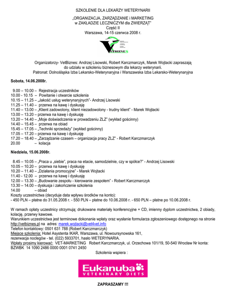 SZKOLENIE DLA LEKARZY WETERYNARII „ORGANIZACJA, ZARZĄDZANIE i MARKETING w ZAKŁADZIE LECZNICZYM dla ZWIERZĄT” Część II Warszawa, 14-15 czerwca 2008 r. Organizatorzy- VetBiznes: Andrzej Lisowski, Robert Karczmarczyk, Marek Wojtacki zapraszają do udziału w szkoleniu biznesowym dla lekarzy weterynarii. Patronat: Dolnośląska Izba Lekarsko-Weterynaryjna i Warszawska Izba Lekarsko-Weterynaryjna Sobota, 14.06.2008r. 9.00 – 10.00 – Rejestracja uczestników 10.00 - 10.15 – Powitanie i otwarcie szkolenia 10.15 – 11.25 – „Jakość usług weterynaryjnych”- Andrzej Lisowski 11.25 – 11.40 – przerwa na kawę i dyskusję 11.40 – 13.00 – „Klient zadowolony, klient niezadowolony - trudny klient” - Marek Wojtacki 13.00 – 13.20 – przerwa na kawę i dyskusję 13.20 – 14.40 – „Moje doświadczenia w prowadzeniu ZLZ” (wykład gościnny) 14.40 – 15.45 – przerwa na obiad 15.45 – 17.05 – „Techniki sprzedaŜy” (wykład gościnny) 17.05 – 17.20 – przerwa na kawę i dyskusję 17.20 – 18.40 – „Zarządzanie czasem – organizacja pracy ZLZ” - Robert Karczmarczyk 20.00 – kolacja Niedziela, 15.06.2008r. 8.45 – 10.05 – „Praca u „siebie”, praca na etacie, samodzielnie, czy w spółce?” - Andrzej Lisowski 10.05 – 10.20 – przerwa na kawę i dyskusję 10.20 – 11.40 – „Działania promocyjne” - Marek Wojtacki 11.40 - 12.00 – przerwa na kawę i dyskusję 12.00 – 13.30 – „Budowanie zespołu - kierowanie zespołem” - Robert Karczmarczyk 13.30 – 14.00 – dyskusja i zakończenie szkolenia 14.00 – obiad Koszty uczestnictwa (decyduje data wpływu środków na konto): - 450 PLN – płatne do 31.05.2008 r. - 550 PLN – płatne do 10.06.2008 r. - 650 PLN – płatne po 10.06.2008 r. W ramach opłaty uczestnicy otrzymują: drukowane materiały konferencyjne + CD, imienny dyplom uczestnictwa, 2 obiady, kolację, przerwy kawowe. Warunkiem uczestnictwa jest terminowe dokonanie wpłaty oraz wysłanie formularza zgłoszeniowego dostępnego na stronie http://vetbiznes.pl na adres: [email protected] Telefon kontaktowy: 0501 631 788 (Robert Karczmarczyk) Miejsce szkolenia: Hotel Asystenta IKAR, Warszawa, ul. Nowoursynowska 161, rezerwacja noclegów - tel. (022) 5933701, hasło WETERYNARIA. Wpłaty prosimy kierować: VET-MARKETING Robert Karczmarczyk, ul. Orzechowa 101/19, 50-540 Wrocław Nr konta: BZWBK 14 1090 2486 0000 0001 0741 2450 Szkolenia wspiera : ZAPRASZAMY !!!
