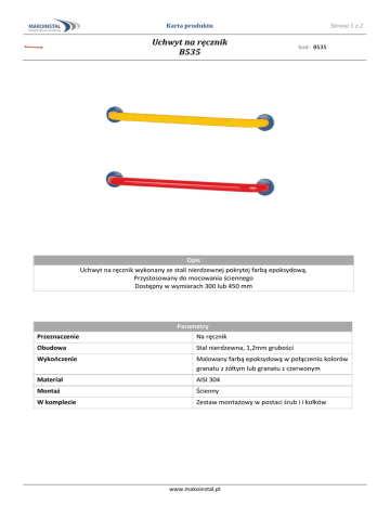 Karta produktu Uchwyt na ręcznik B535 Strona 1 z 2 kod: B535 Opis Uchwyt na ręcznik wykonany ze stali nierdzewnej pokrytej farbą epoksydową. Przystosowany do mocowania ściennego Dostępny w wymiarach 300 lub 450 mm Parametry Przeznaczenie Na ręcznik Obudowa Stal nierdzewna, 1,2mm grubości Wykończenie Malowany farbą epoksydową w połączeniu kolorów granatu z żółtym lub granatu z czerwonym Materiał AISI 304 Montaż Ścienny W komplecie Zestaw montażowy w postaci śrub i i kołków www.makoinstal.pl Karta produktu Uchwyt na ręcznik B535 www.makoinstal.pl Strona 2 z 2 kod: B535