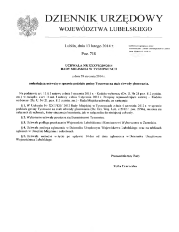 zmieniająca uchwałę w sprawie podziału gminy Tyszowce na stałe obwody głosowania.