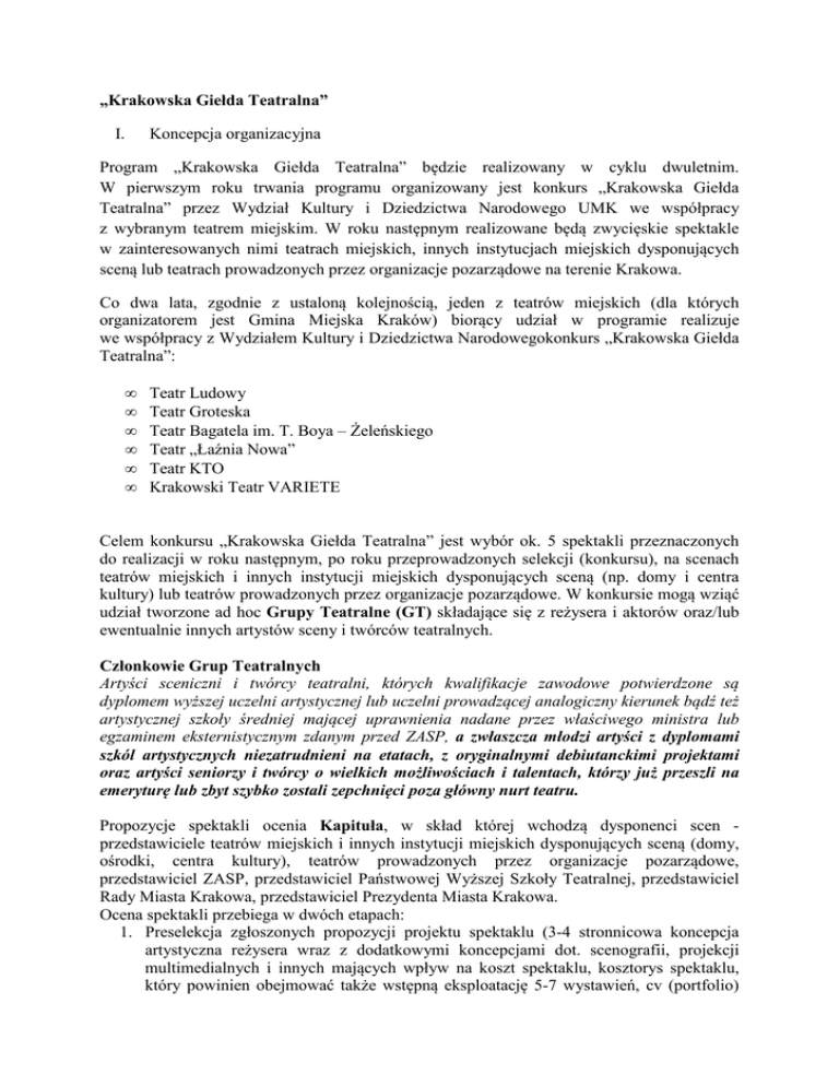 „Krakowska Giełda Teatralna” I. Koncepcja organizacyjna Program „Krakowska Giełda Teatralna” będzie realizowany w cyklu dwuletnim. W pierwszym roku trwania programu organizowany jest konkurs „Krakowska Giełda Teatralna” przez Wydział Kultury i Dziedzictwa Narodowego UMK we współpracy z wybranym teatrem miejskim. W roku następnym realizowane będą zwycięskie spektakle w zainteresowanych nimi teatrach miejskich, innych instytucjach miejskich dysponujących sceną lub teatrach prowadzonych przez organizacje pozarządowe na terenie Krakowa. Co dwa lata, zgodnie z ustaloną kolejnością, jeden z teatrów miejskich (dla których organizatorem jest Gmina Miejska Kraków) biorący udział w programie realizuje we współpracy z Wydziałem Kultury i Dziedzictwa Narodowegokonkurs „Krakowska Giełda Teatralna”: • • • • • • Teatr Ludowy Teatr Groteska Teatr Bagatela im. T. Boya – Żeleńskiego Teatr „Łaźnia Nowa” Teatr KTO Krakowski Teatr VARIETE Celem konkursu „Krakowska Giełda Teatralna” jest wybór ok. 5 spektakli przeznaczonych do realizacji w roku następnym, po roku przeprowadzonych selekcji (konkursu), na scenach teatrów miejskich i innych instytucji miejskich dysponujących sceną (np. domy i centra kultury) lub teatrów prowadzonych przez organizacje pozarządowe. W konkursie mogą wziąć udział tworzone ad hoc Grupy Teatralne (GT) składające się z reżysera i aktorów oraz/lub ewentualnie innych artystów sceny i twórców teatralnych. Członkowie Grup Teatralnych Artyści sceniczni i twórcy teatralni, których kwalifikacje zawodowe potwierdzone są dyplomem wyższej uczelni artystycznej lub uczelni prowadzącej analogiczny kierunek bądź też artystycznej szkoły średniej mającej uprawnienia nadane przez właściwego ministra lub egzaminem eksternistycznym zdanym przed ZASP, a zwłaszcza młodzi artyści z dyplomami szkól artystycznych niezatrudnieni na etatach, z oryginalnymi debiutanckimi projektami oraz artyści seniorzy i twórcy o wielkich możliwościach i talentach, którzy już przeszli na emeryturę lub zbyt szybko zostali zepchnięci poza główny nurt teatru. Propozycje spektakli ocenia Kapituła, w skład której wchodzą dysponenci scen przedstawiciele teatrów miejskich i innych instytucji miejskich dysponujących sceną (domy, ośrodki, centra kultury), teatrów prowadzonych przez organizacje pozarządowe, przedstawiciel ZASP, przedstawiciel Państwowej Wyższej Szkoły Teatralnej, przedstawiciel Rady Miasta Krakowa, przedstawiciel Prezydenta Miasta Krakowa. Ocena spektakli przebiega w dwóch etapach: 1. Preselekcja zgłoszonych propozycji projektu spektaklu (3-4 stronnicowa koncepcja artystyczna reżysera wraz z dodatkowymi koncepcjami dot. scenografii, projekcji multimedialnych i innych mających wpływ na koszt spektaklu, kosztorys spektaklu, który powinien obejmować także wstępną eksploatację 5-7 wystawień, cv (portfolio) członków GT, proponowaną lokalizację spektaklu). W wyniku preselekcji zostanie wybranych ok. 10 koncepcji do dalszego rozwoju. 2. Ocena prezentacji wstępnej koncepcji spektaklu wybranych w preselekcji (10). W wyniku tego etapu wybranych zostanie ok. 5 koncepcji przedstawień do realizacji. 3. Od etapu prezentacji członkowie GT otrzymują wynagrodzenia. Prezentacje są otwarte dla publiczności oraz zainteresowanych dysponentów scen. II. Tryb realizacji finansowej „Krakowskiej Giełdy Teatralnej”: Finansowanie: a) od 2017: organizacja konkursu „Krakowska Giełda Teatralna” – 100 000 zł b) od 2018 realizacja zwycięskich spektakli 500 000 zł Środki na przeprowadzenie procedury konkursowej w pierwszym roku realizacji zadania przekazywane są dotacją celową w kwocie 100 000 zł dla teatru miejskiego organizatora „Krakowskiej Giełdy Teatralnej”. Środki na realizacje przedstawień są przekazywane w formie dotacji zainteresowanym dysponentom scen (teatry miejskie lub inne instytucje miejskie dysponujące sceną, lub teatry prowadzone przez organizacje pozarządowe). Podstawą przekazania środków jest protokół z posiedzenia Kapituły dotyczący wyboru zwycięskich spektakli. Środku na realizacje wybranych przedstawień w kwocie 500 000 zł, w drugim roku realizacji zadania, przekazywane będą w formie dotacji celowej nas realizację spektaklu/spektakli dla miejskiej instytucji kultury lub w formie dotacji dla organizacji pozarządowej zgodnie z obowiązującymi przepisami Wszelkie uwagi do programu można zgłaszać do dnia 6 listopada 2016 r. na adres e-mail: [email protected]. w tytule proszę wpisać: Krakowska Giełda Teatralna – uwagi.