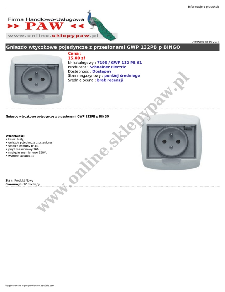 Informacje o produkcie Utworzono 08-03-2017 Gniazdo wtyczkowe pojedyncze z przesłonami GWP 132PB p BINGO sk le Gniazdo wtyczkowe pojedyncze z przesłonami GWP 132PB p BINGO w w w .o nl in e. Właściwości: • kolor: biały, • gniazdo pojedyncze z przesłoną, • stopień ochrony IP 44, • prąd znamionowy 16A , • napięcie znamionowe 250V, • wymiar: 80x80x13 Stan: Produkt Nowy Gwarancja: 12 miesięcy py pa w Nr katalogowy : 7198 / GWP 132 PB 61 Producent : Schneider Electric Dostępność : Dostępny Stan magazynowy : poniżej średniego Średnia ocena : brak recenzji Wygenerowano w programie www.oscGold.com .p l Cena : 15,00 zł
