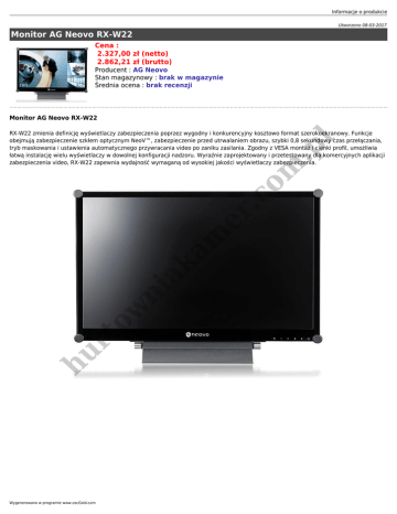 Informacje o produkcie Utworzono 08-03-2017 Monitor AG Neovo RX-W22 Cena : 2.327,00 zł (netto) 2.862,21 zł (brutto) Producent : AG Neovo Stan magazynowy : brak w magazynie Średnia ocena : brak recenzji Monitor AG Neovo RX-W22 hu rt ow ni ak am er .c om .p l RX-W22 zmienia definicję wyświetlaczy zabezpieczenia poprzez wygodny i konkurencyjny kosztowo format szerokoekranowy. Funkcje obejmują zabezpieczenie szkłem optycznym NeoV™, zabezpieczenie przed utrwalaniem obrazu, szybki 0,8 sekundowy czas przełączania, tryb maskowania i ustawienia automatycznego przywracania video po zaniku zasilania. Zgodny z VESA montaż i cienki profil, umożliwia łatwą instalację wielu wyświetlaczy w dowolnej konfiguracji nadzoru. Wyraźnie zaprojektowany i przetestowany dla komercyjnych aplikacji zabezpieczenia video, RX-W22 zapewnia wydajność wymaganą od wysokiej jakości wyświetlaczy zabezpieczenia. Wygenerowano w programie www.oscGold.com .p l er .c om Właściwości: hu rt ow ni ak am • Rozdzielczość FHD 1920 x1080 • Współczynnik kontrastu 4000:1 • Szkło optyczne NeoV™ • Technologia Anti-Burn-in™ • Inteligentna wielokierunkowa przeglądarka: Funkcje PIP, PBP i VOV • Wbudowany układ poprawiania obrazu: Filtr grzebieniowy 3D/Usuwanie przeplotu/Redukcja zakłóceń • Wiele wejść video (Wejście BNC x2, wyjście BNC x2) • Rozdzielczość w poziomie do 630TVL(NTSC), 650TVL(PAL) • Wbudowane HDCP udostępnia video w formacie HD • Wyjście prądu stałego do zasilania urządzeń peryferyjnych • Wybierany współczynnik kształtu, zapewniający uzyskanie najlepszego obrazu: Oryginalny, Overscan, Underscan • Obsługa systemów video NTSC/PAL/SECAM • Szybki czas przełączania sygnału (≤ 0.8 sek.) • Pilot zdalnego sterowania na podczerwień • Wytrzymała metalowa obudowa • Zestaw do montażu na ścianie w standardzie VESA • Rygorystyczne ekranowanie komponentów krytycznych aplikacji działających w trybie 24/7 Specyfikacja: Rozmiar panela 22.0" (559 mm) Jasność 300 cd/m² (Typowa) Współczynnik kontrastu 4000:1 (Typowy) Kąt widzenia (w poziomie/w pionie) 170º / 160º (Typowy) Rozdzielczość wyświetlania WSXGA+ 1680 x 1050 Sygnał wejścia Analogowy, Cyfrowy, zabezpieczenie BNC Czas odpowiedzi 3 ms (GTG) Wymiary bez opakowania 512 x 392 x 155 mm (20.2" x 15.4" x 6.1") Informacje o produkcie 6.9 kg (15.2 funta) hu rt ow ni ak am er .c om .p l Waga netto Wygenerowano w programie www.oscGold.com