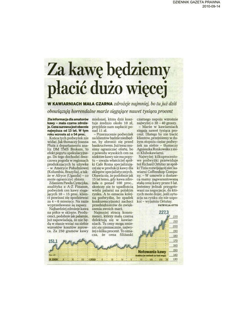DZIENNIK GAZETA PRAWNA 2010-09-14 Za kawę będziemy placie dużo więcej W KAWIARNIACH MAŁA CZARNA zdrożeje najmniej, bo tu już dziś obowiązują horrendalne marże sięgające nawet tysiąca procent Zła informacja dla amatorów kawy - mała czarna zdroże je. Cena surowca jest obecnie najwyższa od 13 lat. W tym roku wzrosła aż o 54 proc. Końca tych podwyżek nie widać. Jak tłumaczy Joanna Pluta z departamentu ana liz DM TMS Brokers, to efekt popytu spekulacyjne go. Do tego dochodzi desz czowa pogoda w regionach produkujących tę używkę - w Ameryce Południowej (Kolumbia, Brazylia), a tak że w Afryce (Uganda) - co może ograniczyć zbiory. Zdaniem Pawła Cymcyka, analityka z A-Z Finanse, podwyżek cen kawy sięga jących 10-15 proc. klien ci powinni się spodziewać za 4 - 6 miesięcy. Na razie wyprzedawane są zapasy. Najbardziej zdrożeje kawa na półce w sklepie. Produ cenci, podobnie jak palarnie, już zapowiadają, że nie bę dą w stanie wziąć na siebie wzrostów kosztów surow ca. Za 250 gramów kawy mielonej, która dziś kosz tuje średnio około 10 zł, przyjdzie nam zapłacić po nad 11 zł. - Przerzucenie podwyżek na klientów będzie niezbęd ne, by obronić się przed bankructwem. Już teraz mu simy ograniczać ofertę, bo z powodu wysokich cen na niektóre kawy nie ma popy tu - uważa właściciel spół ki Cafe Roma specjalizują cej się w produkcji kawy dla sklepów specjalistycznych. Obawia się, że podobnie jak 15 lat temu, gdy kawa zdro żała o ponad 100 proc, skończy się to upadłością wielu palarni na polskim rynku. A to oznacza kolej ną podwyżkę, bo spadek konkurencyjności zachęci przedsiębiorców do zwięk szenia swoich marż. Najmniej stracą konsu menci, którzy małą czarną delektują się w kawiar niach. Tu ceny mogą zmie nić się nieznacznie, najwy żej o kilka procent. To ozna cza, że cena filiżanki czarnego napoju wzrośnie najwyżej o 30 - 40 groszy. - Marże w kawiarniach sięgają nawet tysiąca pro cent. Dlatego by nie tracić klientów, przejmiemy w du żym stopniu ciężar podwy żek na siebie - tłumaczy Agnieszka Ronkowska z sie ci Klubokawiarni. Najwyżej kilkuprocentowe podwyżki przewiduje też Richard Ortutay ze spół ki Tizia rozwijającej sieć ka wiarni Coffeeshop Compa ny. - W umowie z dostawcąmamy zagwarantowaną stałą cenę kawy przez 5 lat. Jesteśmy jednak przygoto wani na negocjacje, do któ rych może dojść, jeśli sytu acja na rynku się nie uspo koi - wyjaśnia Ortutay. PATRYCJA OTTO 227,3 Notowania kawy Rys.ŁR 1X2009 Arabica (w centach za funt wagi) vi I vii l VIII !ix