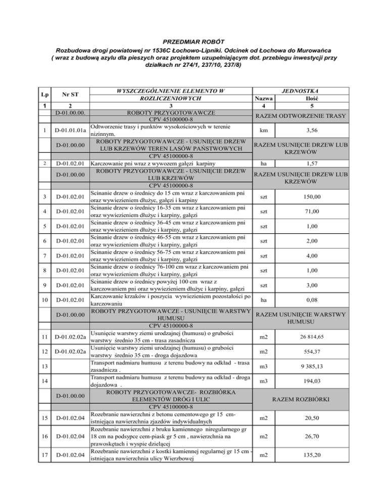 PRZEDMIAR ROBÓT Rozbudowa drogi powiatowej nr 1536C Łochowo-Lipniki. Odcinek od Łochowa do Murowańca ( wraz z budową azylu dla pieszych oraz projektem uzupełniającym dot. przebiegu inwestycji przy działkach nr 274/1, 237/10, 237/8) Lp Nr ST 1 2 D-01.00.00. 1 D-01.01.01a D-01.00.00 2 D-01.02.01 D-01.00.00 3 D-01.02.01 4 D-01.02.01 5 D-01.02.01 6 D-01.02.01 7 D-01.02.01 8 D-01.02.01 9 D-01.02.01 10 D-01.02.01 D-01.00.00 11 D-01.02.02a 12 D-01.02.02a 13 14 D-01.00.00 15 D-01.02.04 16 D-01.02.04 17 D-01.02.04 JEDNOSTKA WYSZCZEGÓLNIENIE ELEMENTO W ROZLICZENIOWYCH Nazwa Ilość 3 4 5 ROBOTY PRZYGOTOWAWCZE RAZEM ODTWORZENIE TRASY CPV 45100000-8 Odtworzenie trasy i punktów wysokościowych w terenie km 3,56 nizinnym. ROBOTY PRZYGOTOWAWCZE - USUNIĘCIE DRZEW RAZEM USUNIĘCIE DRZEW LUB LUB KRZEWÓW TEREN LASÓW PAŃSTWOWYCH KRZEWÓW CPV 45100000-8 Karczowanie pni wraz z wywozem gałęzi karpiny ha 1,57 ROBOTY PRZYGOTOWAWCZE - USUNIĘCIE DRZEW RAZEM USUNIĘCIE DRZEW LUB LUB KRZEWÓW KRZEWÓW CPV 45100000-8 Scinanie drzew o średnicy do 15 cm wraz z karczowaniem pni szt 150,00 oraz wywiezieniem dłużyc, gałęzi i karpiny Scinanie drzew o średnicy 16-35 cm wraz z karczowaniem pni szt 71,00 oraz wywiezieniem dłużyc i karpiny, gałęzi Scinanie drzew o średnicy 36-45 cm wraz z karczowaniem pni szt 1,00 oraz wywiezieniem dłużyc i karpiny, gałęzi Scinanie drzew o średnicy 46-55 cm wraz z karczowaniem pni szt 2,00 oraz wywiezieniem dłużyc i karpiny, gałęzi Scinanie drzew o średnicy 56-75 cm wraz z karczowaniem pni szt 4,00 oraz wywiezieniem dłużyc i karpiny, gałęzi Scinanie drzew o średnicy 76-100 cm wraz z karczowaniem pni szt 1,00 oraz wywiezieniem dłużyc i karpiny, gałęzi Scinanie drzew o średnicy powyżej 100 cm wraz z szt 3,00 karczowaniem pni oraz wywiezieniem dłużyc i karpiny, gałęzi Karczowanie krzaków i poszycia wywiezieniem pozostałości po ha 0,08 karczowaniu ROBOTY PRZYGOTOWAWCZE - USUNIĘCIE WARSTWY RAZEM USUNIĘCIE WARSTWY HUMUSU HUMUSU CPV 45100000-8 Usunięcie warstwy ziemi urodzajnej (humusu) o grubości 26 814,65 m2 warstwy średnio 35 cm - trasa zasadnicza Usunięcie warstwy ziemi urodzajnej (humusu) o grubości 554,37 m2 warstwy średnio 35 cm - droga dojazdowa Transport nadmiaru humusu z terenu budowy na odkład - trasa m3 9 385,13 zasadnicza . Transport nadmiaru humusu z terenu budowy na odkład - droga m3 194,03 dojazdowa . ROBOTY PRZYGOTOWAWCZE- ROZBIÓRKA RAZEM ROZBIÓRKI ELEMENTÓW DRÓG I ULIC CPV 45100000-8 Rozebranie nawierzchni z betonu cementowego gr 15 cmm2 20,50 istniejąca nawierzchnia zjazdów indywidualnych Rozebranie nawierzchni z bruku kamiennego niregularnego gr 18 cm na podsypce cem-piask gr 5 cm , nawierzchnia na m2 26,70 prawoskętach i wyspie dzielącej Rozebranie nawierzchni z kostki kamiennej regularnej gr 15 cm m2 135,20 istniejąca nawierzchnia ulicy Wierzbowej Lp Nr ST 1 2 18 D-01.02.04 19 D-01.02.04 20 D-01.02.04 21 D-01.02.04 22 D-01.02.04 23 D-01.02.04 24 D-01.02.04 25 D-01.02.04 26 D-01.02.04 27 D-01.02.04 28 D-01.02.04 29 D-01.02.04 30 D-01.02.04 31 32 D-01.02.04 33 D-01.02.04 34 D-01.02.04 35 D-01.02.04 36 D-01.02.04 D-01.02.04 37 D-01.02.04 38 D-01.02.04 39 D-01.02.04 40 D-01.02.04 41 D-01.02.04 42 D-01.02.04 43 D-01.02.04 WYSZCZEGÓLNIENIE ELEMENTO W ROZLICZENIOWYCH 3 Rozebranie nawierzchni z kostki brukowej betonowej gr 8 cm na podsypce cem-piask. Na zatoce postojowej i zjazdach do posesji i drogi boczne Rozebranie nawierzchni chodników z płyt betonowych o wym 25*50*6 cm , istniejący chodnik na ulicy Wierzbowej i skrzyżowaniu z ul. Szosa Nakielska Rozebranie nawierzchni z płyt ażurowych - nawierzchnia na zjazdach indywidualnych Rozebranie nawierzchni z płyt drogowych betonowych na zjazdach indywidualnych Rozebranie krawężników betonowych - wyniesionych 20*30 cm - istniejące obramowanie jezdni z kostki kamiennej regularnej Rozebranie krawężników betonowych wjazdowych 15*22 cm istniejące obramowanie jezdni z kostki kamiennej regularnej Rozebranie oporników kamiennych surowo łupanych - istniejące obramowanie nawierzchni z bruku kamiennego Rozebranie ław pod krawężniki - ława betonowa 20*30 cm Rozebranie obrzeży betonowych trawnikowych 8*30 cm istniejące obramowanie chodnika i wjazdów z kostki kamiennej regularnej Rozebranie istniejącego ścieku z elementów korytkowych w pobliżu istniejącego obiektu mostowego - zły stan techniczny elementów odwodnienia Rozebranie istniejącego przepustu z rur betonowych - 2 szt każdy z przepustów o długości 9.0 m Rozebranie podmurówki betonowej- pozostałość po ogrodzeniu, przekrój 0.20*0.30 cm dł 14,5 m Rozebranie studni z kręgów betonowych - rozbiórka elementów powyżej terenu i zasypanie pozostałych Wywiezienie gruzu z rozbiórek ( gruz betonowy) na najbliższe legalne składowisko gruzu Rozebranie do regulacji krawężników betonowych 15*30 cm materiał do ponownego wbudowania Rozebranie do przełożenia nawierzchni z płyt betonowych 25*50*6 cm , materiał do ponownego wbudowania Rozebranie do regulacji obrzeży betonowych 8*30 cm , materiał do ponownego wbudowania Rozebranie do przełożenia nawierzchni z kostki betonowej gr 8 cm na podsypce cem-pisk , materiał do ponownego wbudowania Rozebranie do przełożenia nawierzchni z kostki kamiennej regularnej - istniejąca nawierzchnia na ulicy Wierzbowej , materiał do ponownego wbudowania Rozebranie ogrodzeń ogrodzenie z siatki stalowej na słupkach stalowych bez podmurówki ogrodzenie z siatki stalowej i słupkach betonowych bez podmurówki ogrodzenie z siatki stalowej na słupkach stalowych , bez podmurówki zakończenie drutem kolczastym ogrodzenie z palisady drewnianej na słupach z kamienia polnego, podmurówka z kamienia polnego ogrodzenie z siatki stalowej na słupkach stalowych na podmurówce betonowej ogrodzenie z siatki stalowej na słupkach stalowych bez podmurówki mur z cegły ceramicznej Nazwa 4 JEDNOSTKA Ilość 5 m2 164,10 m2 213,10 m2 3,50 m2 50,50 m 618,00 m 10,